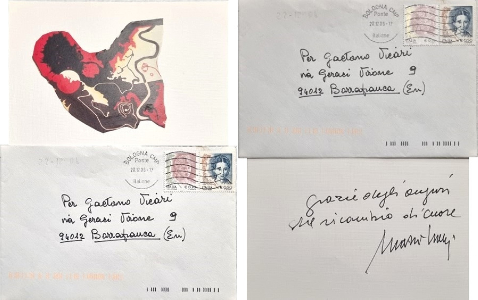 NANNI MARIO Siena 1922 - Bologna 2019 "Senza titolo" Collage su biglietto cm 10,5x16. Dedicato e firmato al verso. Corredato da busta per lettera originale.