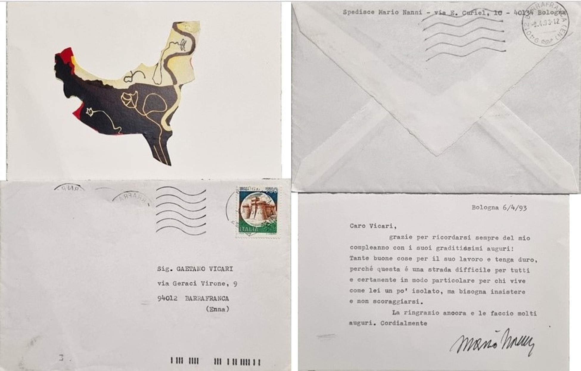 NANNI MARIO Siena 1922 - Bologna 2019 "Senza titolo" Collage su biglietto cm 16x11. Dedicato e firmato al verso. Corredato da busta per lettera originale.
