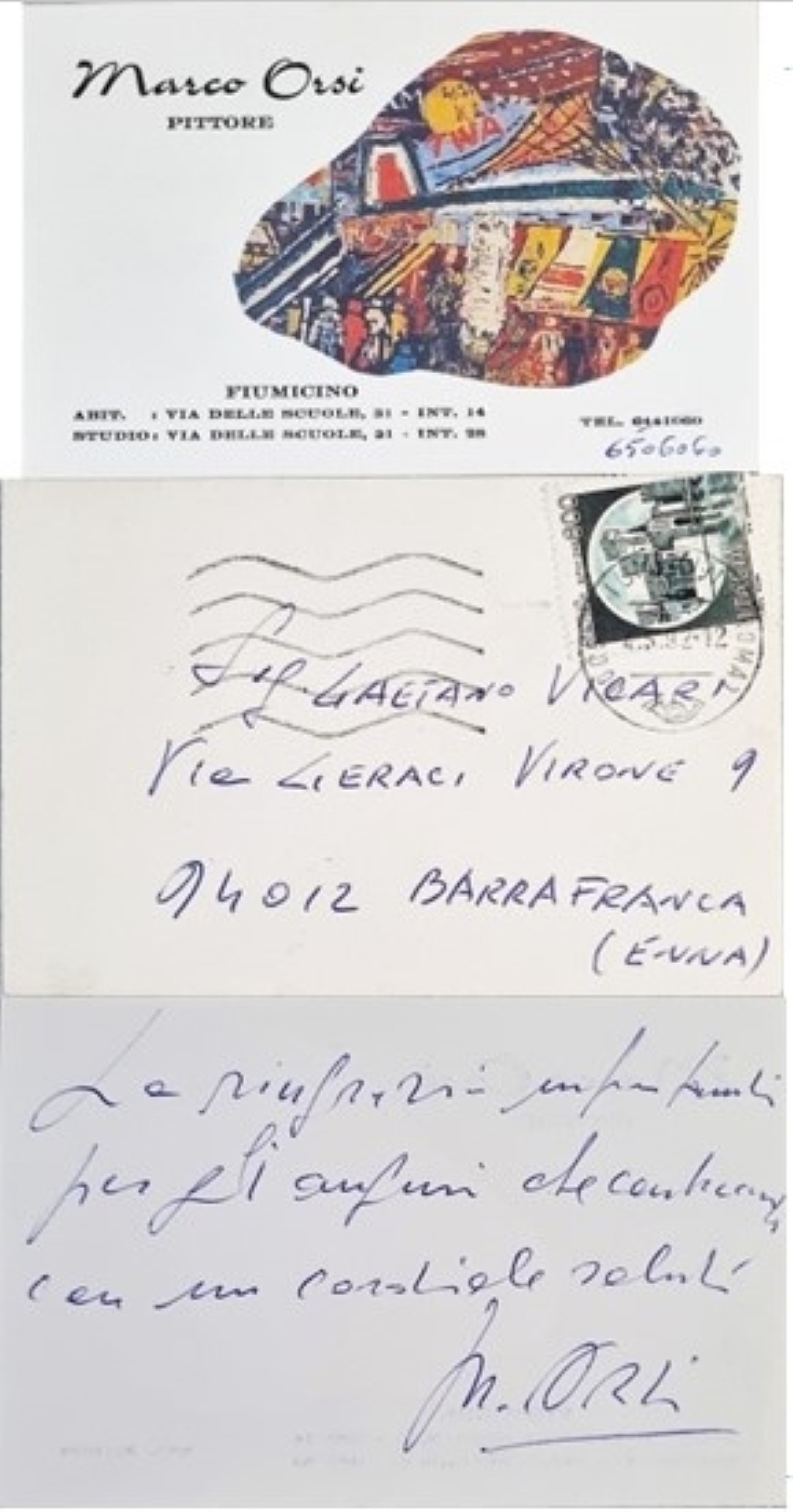 ORSI MARCO Montaldo Bormida 1926 - Fiumicino 1999 "Senza titolo" Collage su cartoncino cm 10,5x7. Dedicato e firmato al verso. Corredato da busta per lettera originale.
