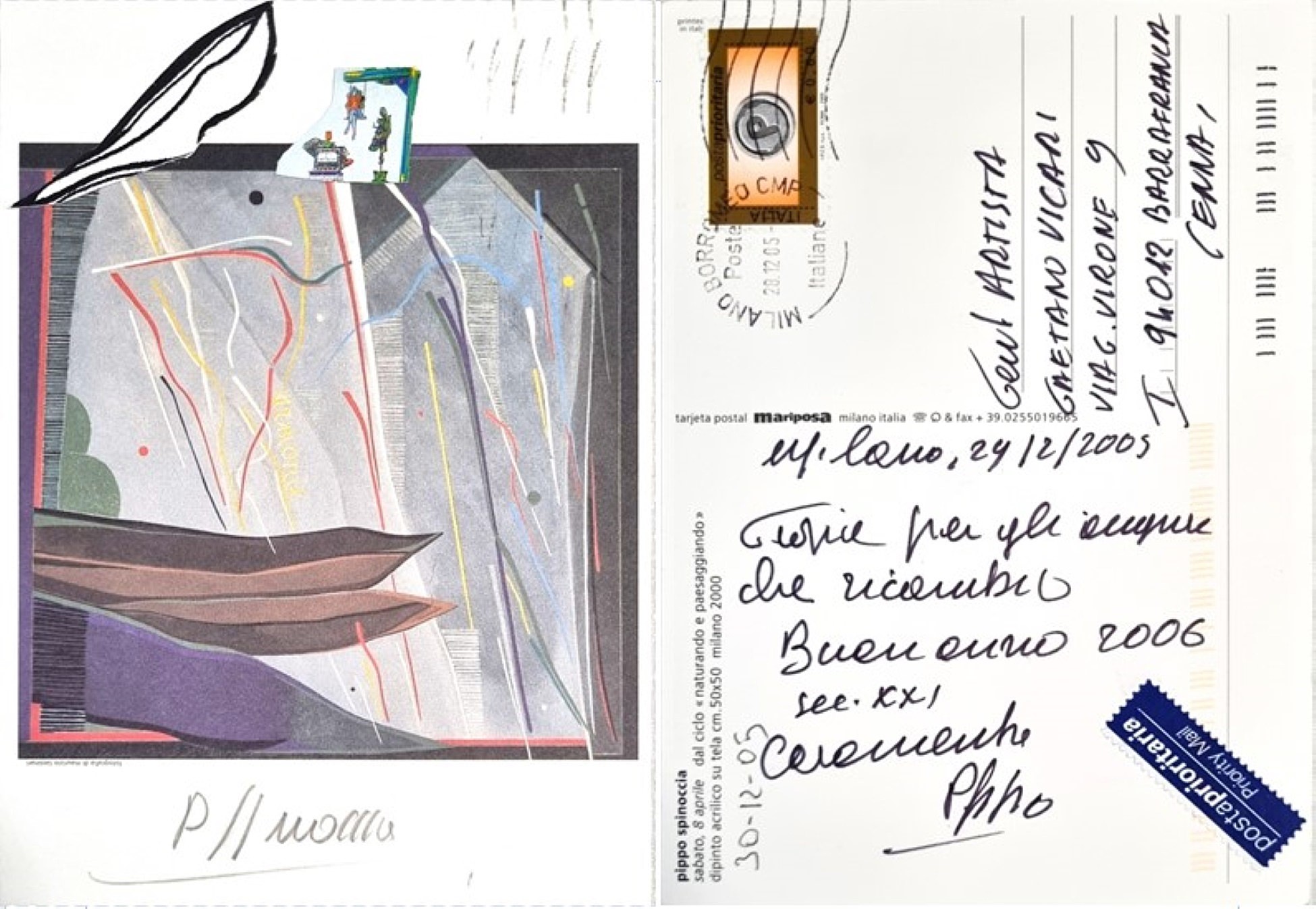 SPINOCCIA PIPPO Siracusa 1928 "Senza titolo" Collage su cartolina cm 16,7x12. Firmato sul fronte in basso al centro, dedicato e firmato al verso.
