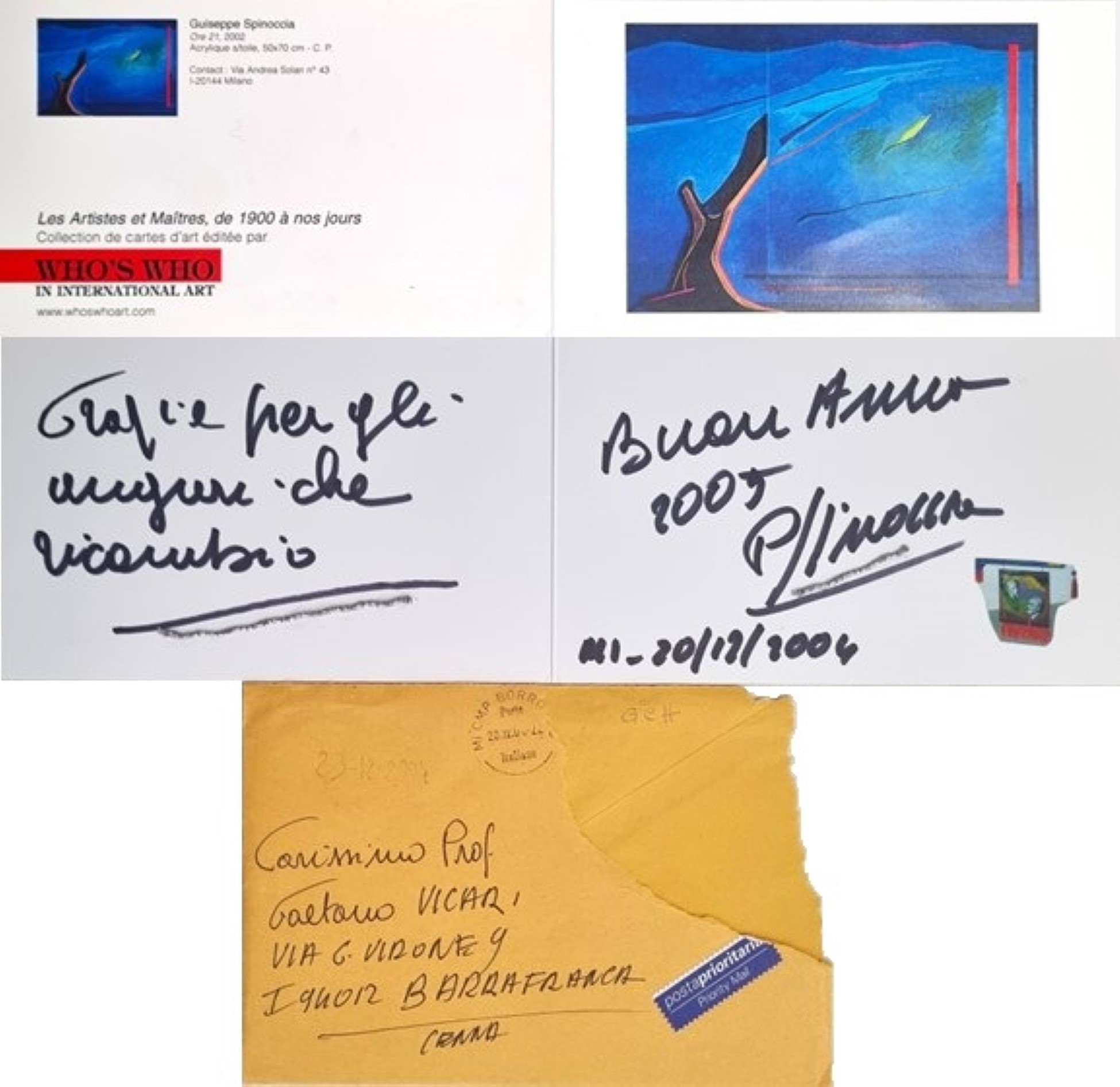 SPINOCCIA PIPPO Siracusa 1928 "Senza titolo" Collage su bigliettino cm 34x10,5 del 2004. Firmato e datato sul fronte in basso a destra. Corredato da busta per lettera originale.