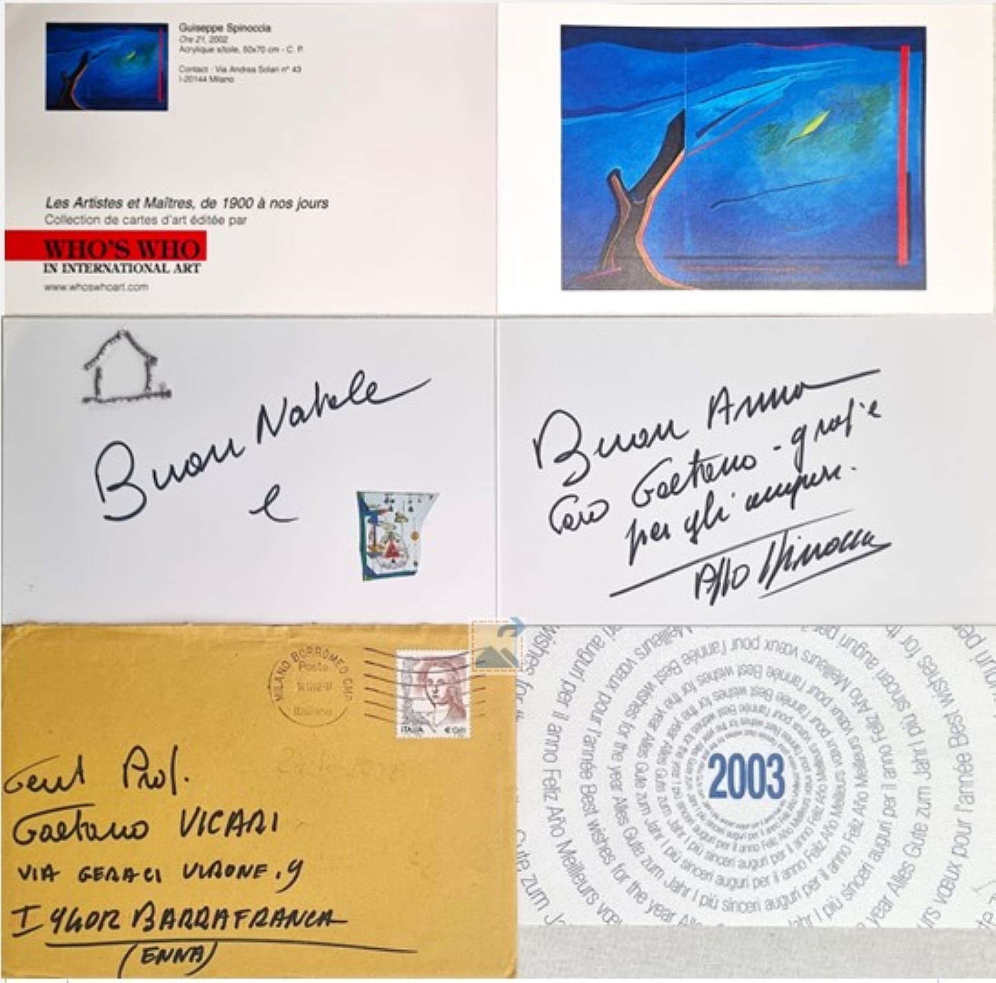 SPINOCCIA PIPPO Siracusa 1928 "Senza titolo" Collage su bigliettino cm 34x10,5 del 2003, firmato e dedicato all'interno. Corredato da busta per lettera originale.