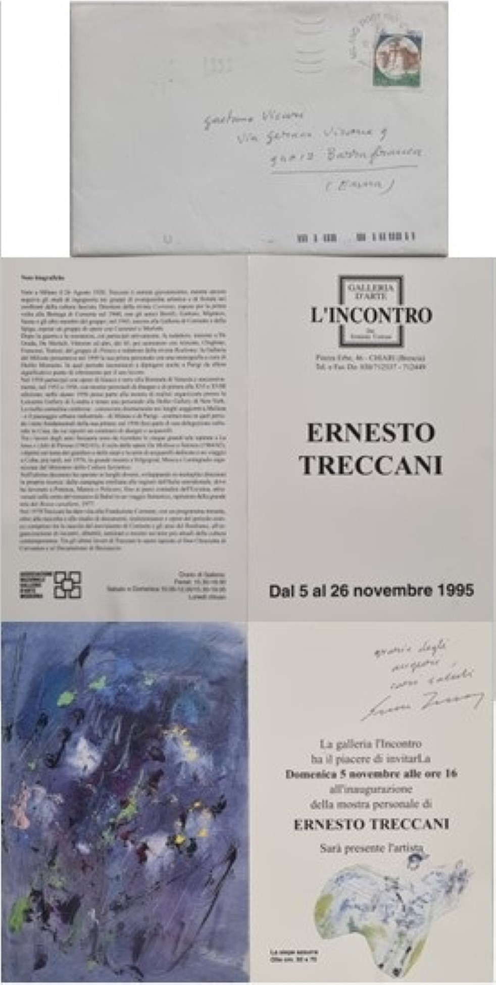 TRECCANI ERNESTO Milano 1920 - 2009 "Senza titolo" Collage su invito alla mostra presso "Galleria Incontro" cm 22,7x17. Firmato e dedicato sul fronte in alto a destra. Corredato da busta per lettera originale.