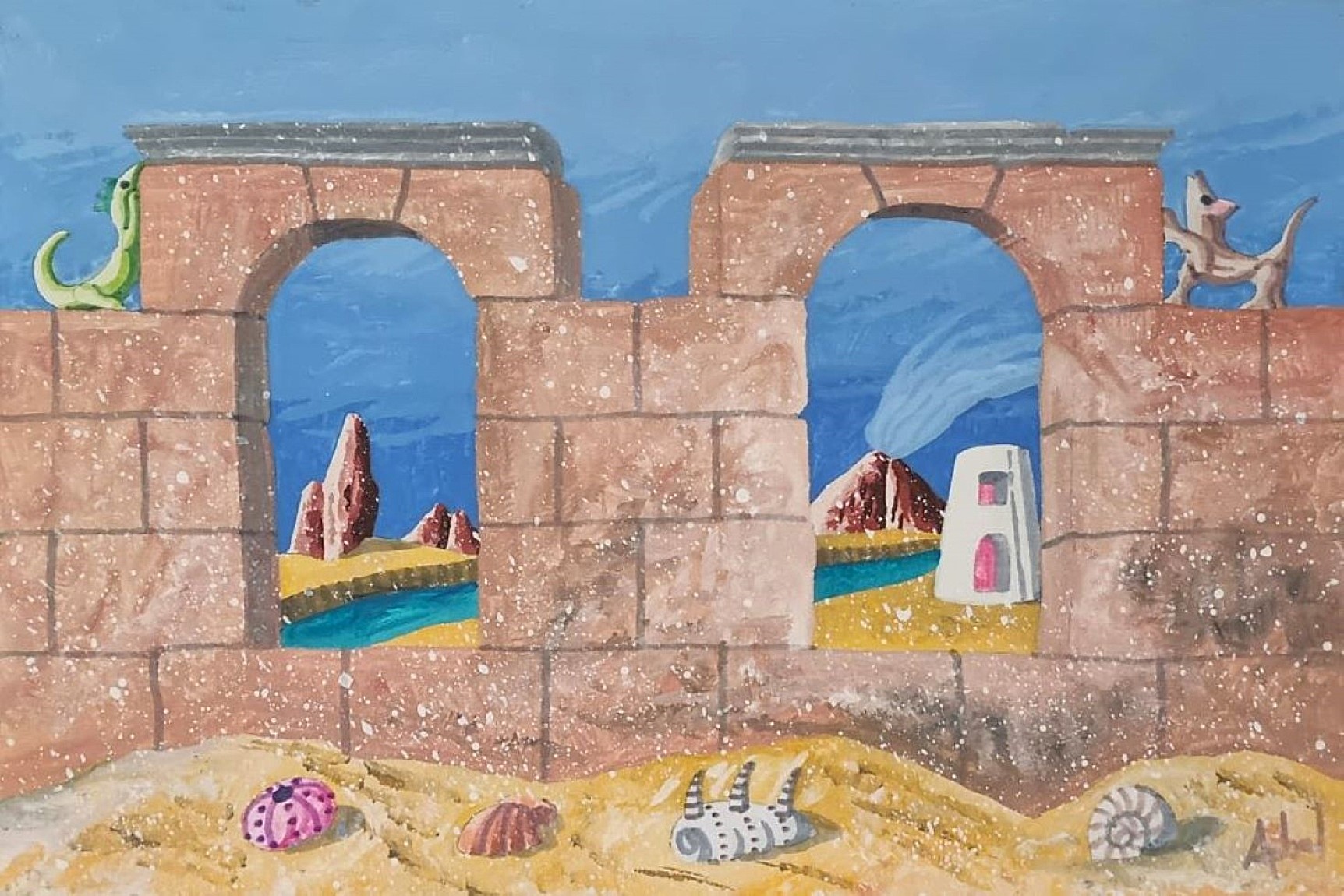 APHEL FABIO Cavalese (TN) 1957 "Rovine" Olio su tavola cm 30x20. Firmato sul fronte in basso a destra. Al verso firma, titolo ed etichetta della mostra "L'isola ritrovata", Galleria d'arte "Il Tetto".