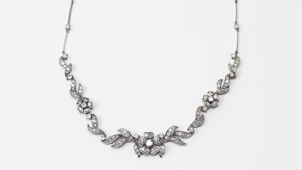 COLLANA IN ORO BIANCO E DIAMANTI realizzata con motivi floreali interamente impreziositi da brillanti ct complessivi 5,50 circa (il diamante centrale ct 0,40 circa), gr 30,3 GOLD AND DIAMONDS NECKLACE