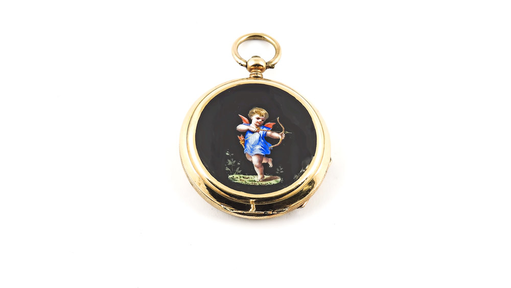 OROLOGIO DA TASCA IN ORO GIALLO 14 KT E SMALTI G. Mermod Frere St. Croix, inizio del XX secolo quadrante in smalto bianco con numeri romani, cassa dipinta con amorino su fondo nero, corredato da due chiavette diam cm 3, gr 22,3 G. MERMOD FRÈRES ST.CROIX BEGINNING XX° CENTURY 14 KT YELLOW GOLD AND ENAMEL POCKET WATCH, WHITE DIAL WITH ROMAN NUMERALS, ENAMEL PAINTED CASE, WITH TWO KEYS