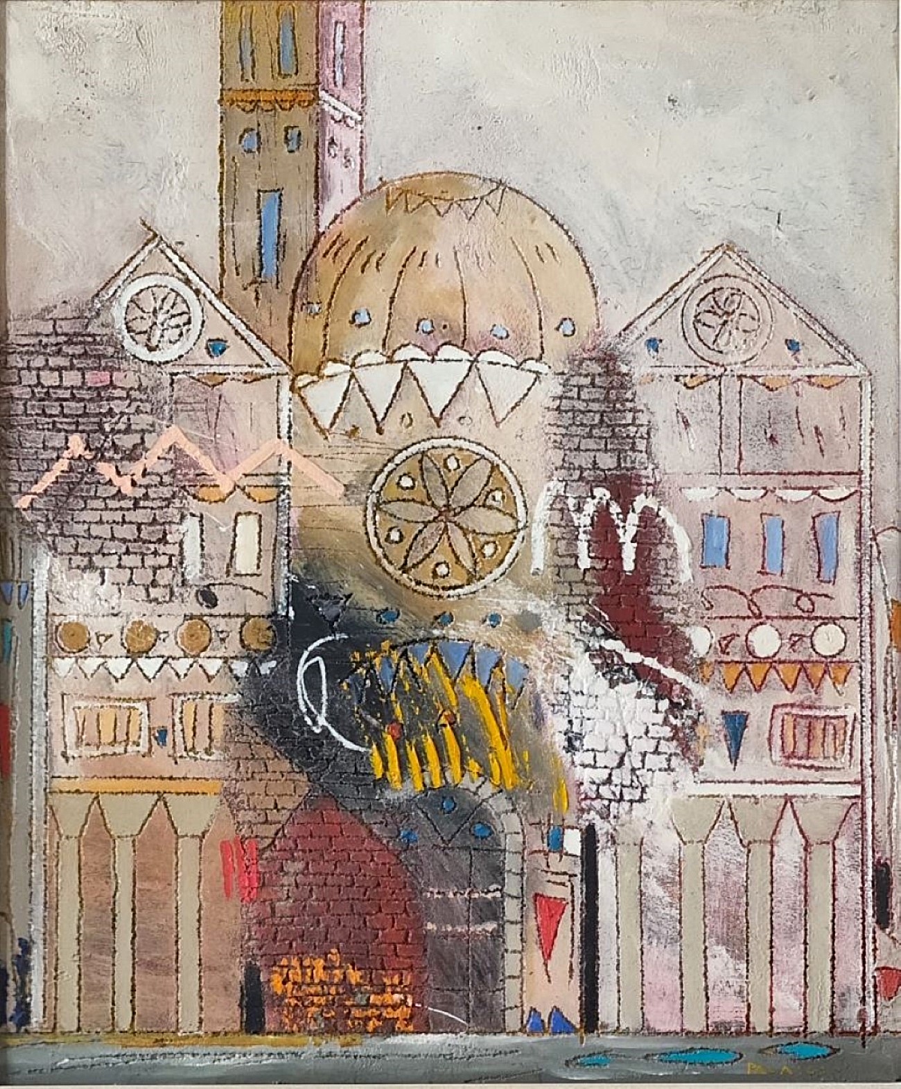 PALASGO DIEGO Noale 1954 "Centro storico" Tecnica mista su tavola cm 50x60 del 1998. Firmata sul fronte in basso a destra. Titolo, firma, data e dichiarazione di autenticità dell'Artista al verso. Certificato di garanzia di altra casa d'aste.