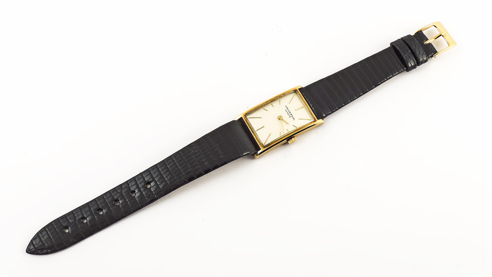 OROLOGIO DA POLSO IN ORO GIALLO Universal movimento a carica manuale, quadrante rettangolare argentato, cinturino in pelle non pertinente UNIVERSAL GENTLEMAN'S MECHANICAL YELLOW GOLD WRISTWATCH, RECTANGULAR SILVER-TONED DIAL, LEATHER STRAPS