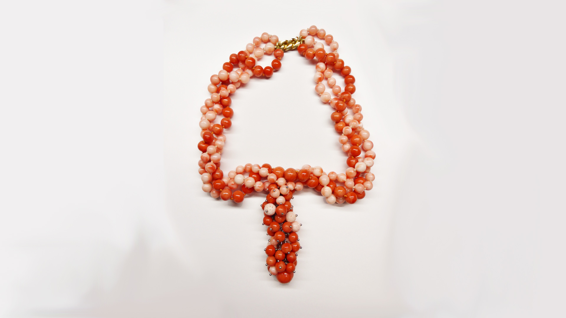 Lot 682 | GIROCOLLO DI TRE FILI IN CORALLO dal rosa al rosso, fermezza in oro giallo...