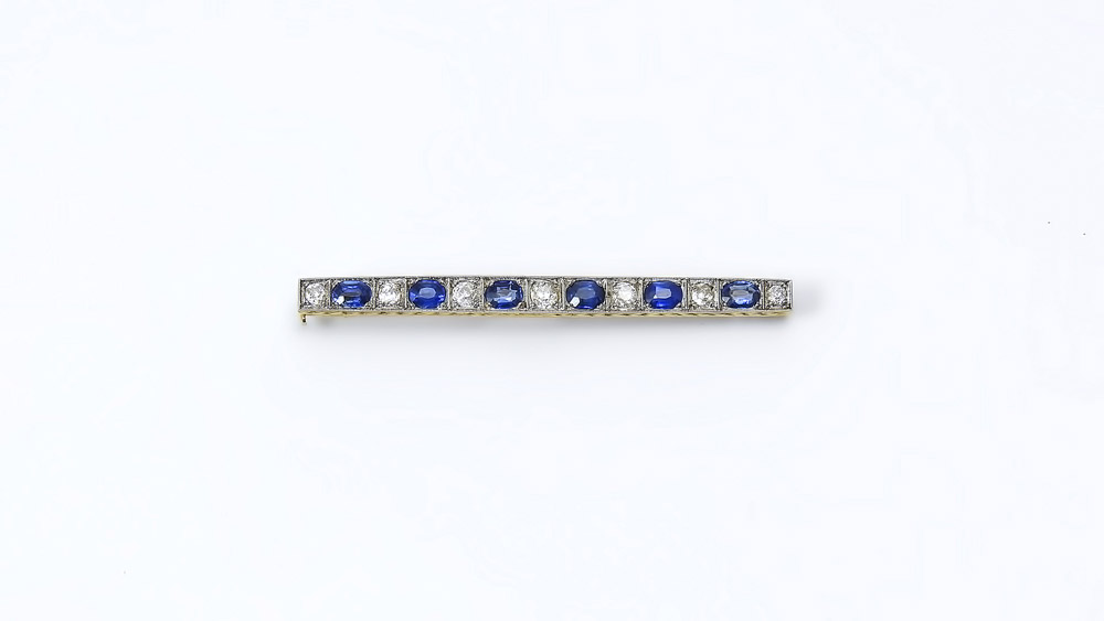 SPILLA A BARRETTA IN ORO GIALLO, ZAFFIRI E BRILLANTI sei zaffiri alternati da...
