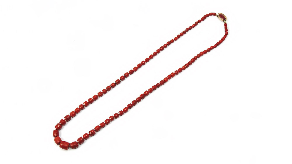 COLLANA SCALARE IN CORALLO MORO MEDITERRANEO chicchi a barilotto sfaccettato, fermezza in oro a basso titolo con cabochon sfaccettato di corallo, presenta leggere imperfezioni diam mm 5/12, gr 51,2 GRADUATED BARREL-SHAPED MEDITERRANEAN DARK RED CORAL NECKLACE, YELLOW GOLD CLASP WITH DARK RED CORAL FACETED CABOCHON