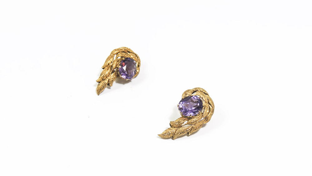 PAIO DI ORECCHINI IN ORO GIALLO cesellati e satinati con motivo di piccole foglie, ciascuno con ametista gr 14,1 GOLD AND AMETHIST PAIR OF EARRINGS