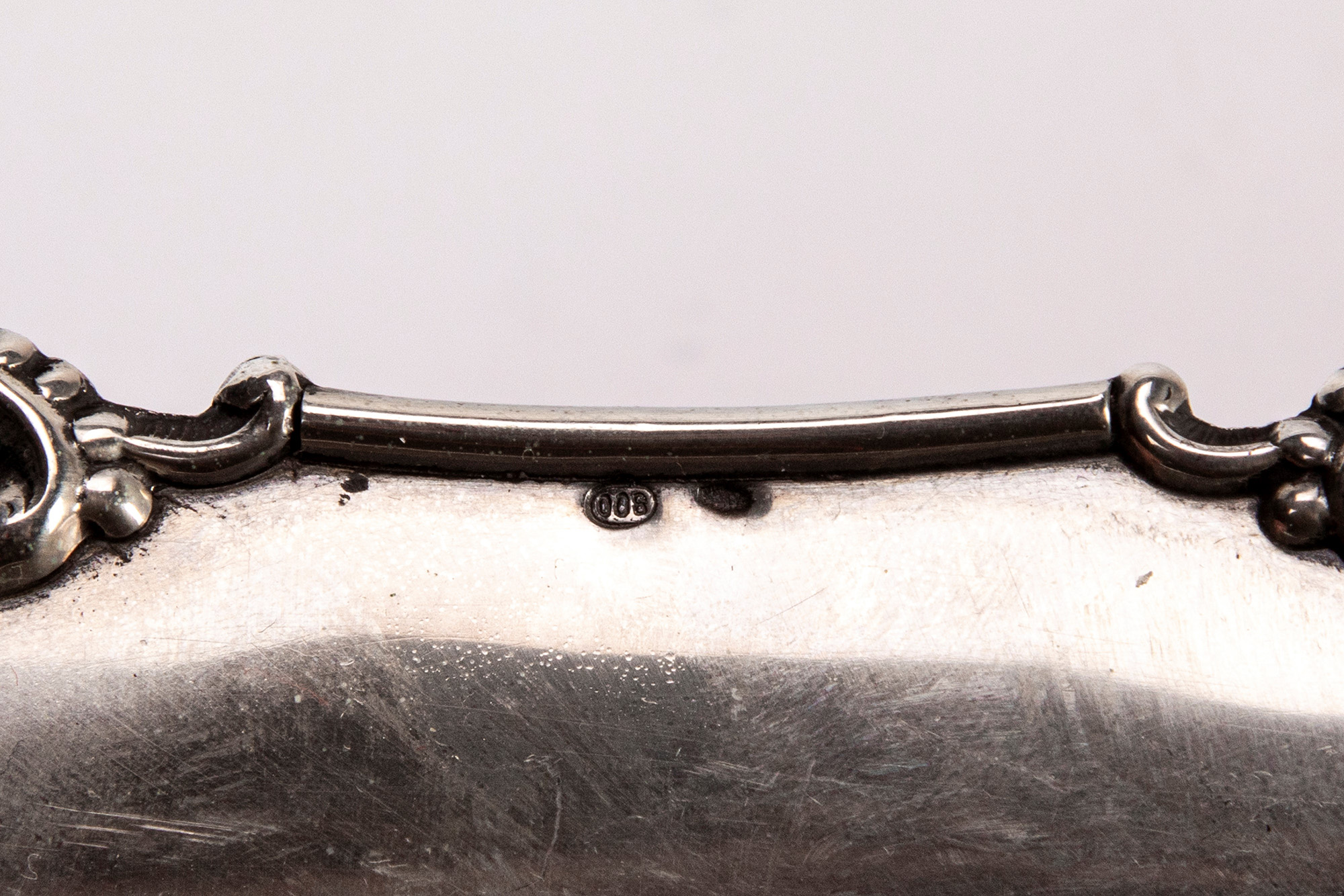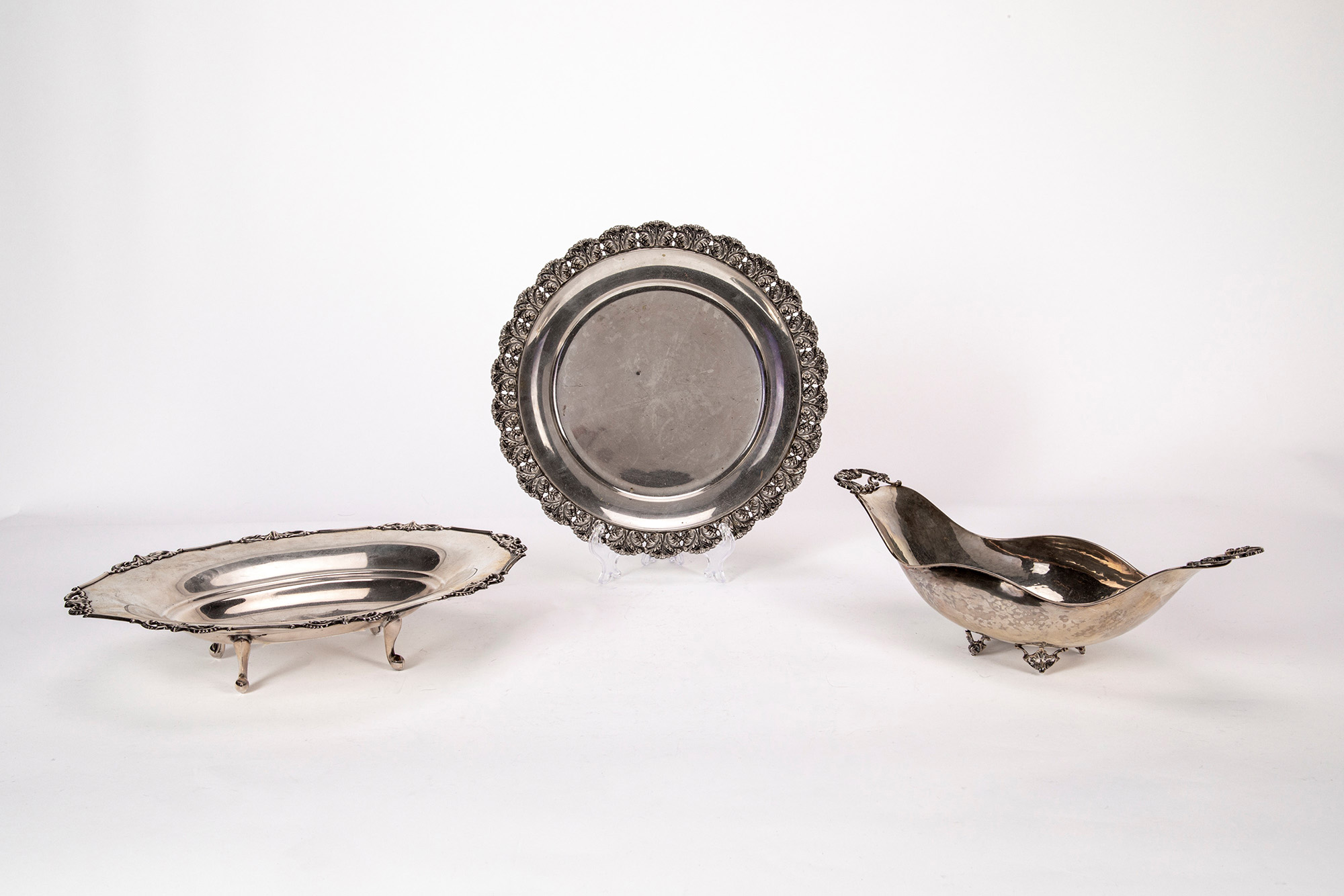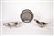 alzatine di forma ovoidale sorrette da piedini e piatto con decoro cesellato a palmette.