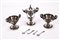 composto da due saliere e una senapiera con struttura di forma circolare decorati in rilievo a foglie di vite con uva e con anse laterali a ricciolo. Piede circolare. Uniti 4 cucchiaini di diverso decoro. Difetti e mancanze.