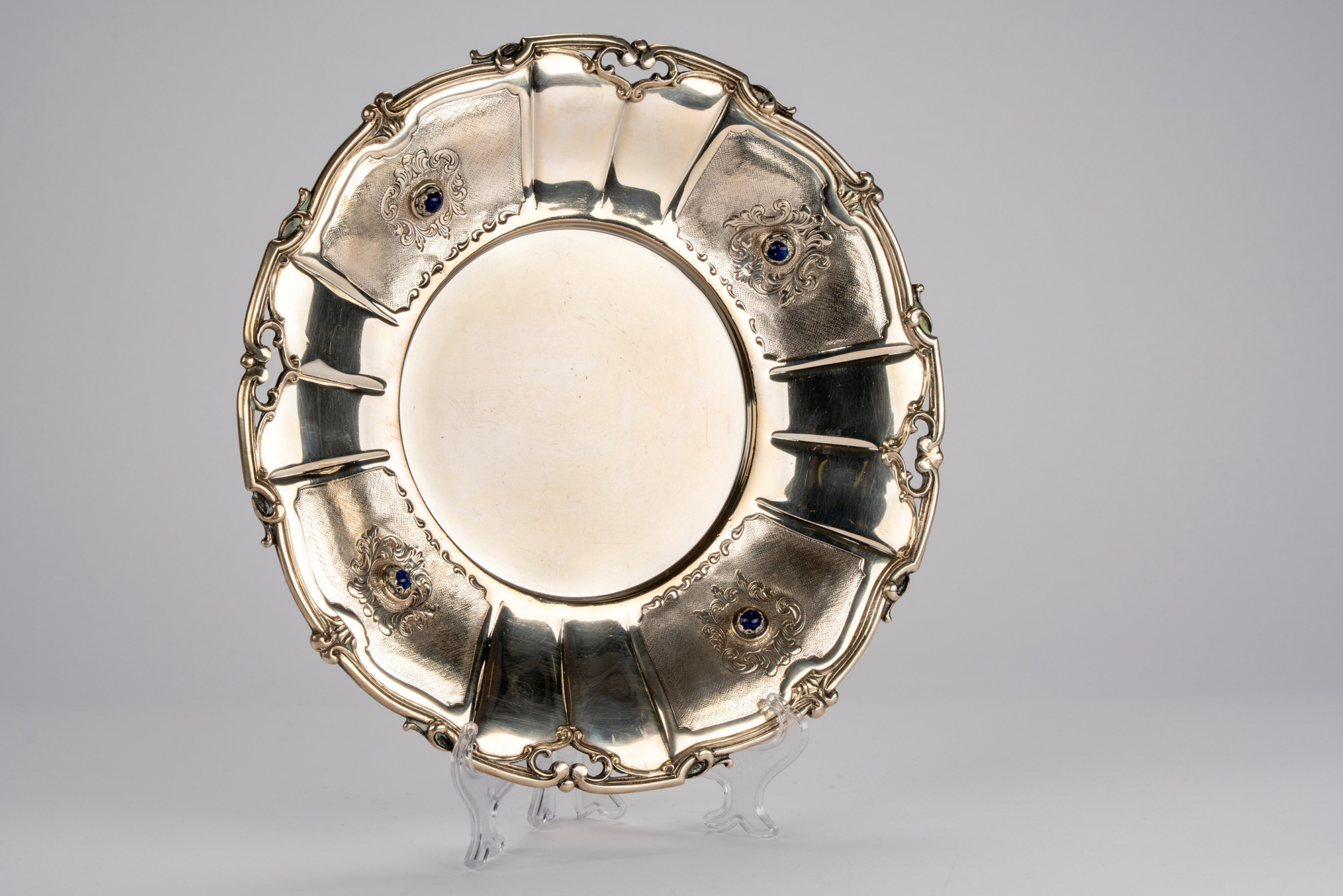 di forma circolare con bordo cesellato, fascia con nicchie decorate a incisioni e pietre dure cabochon.