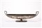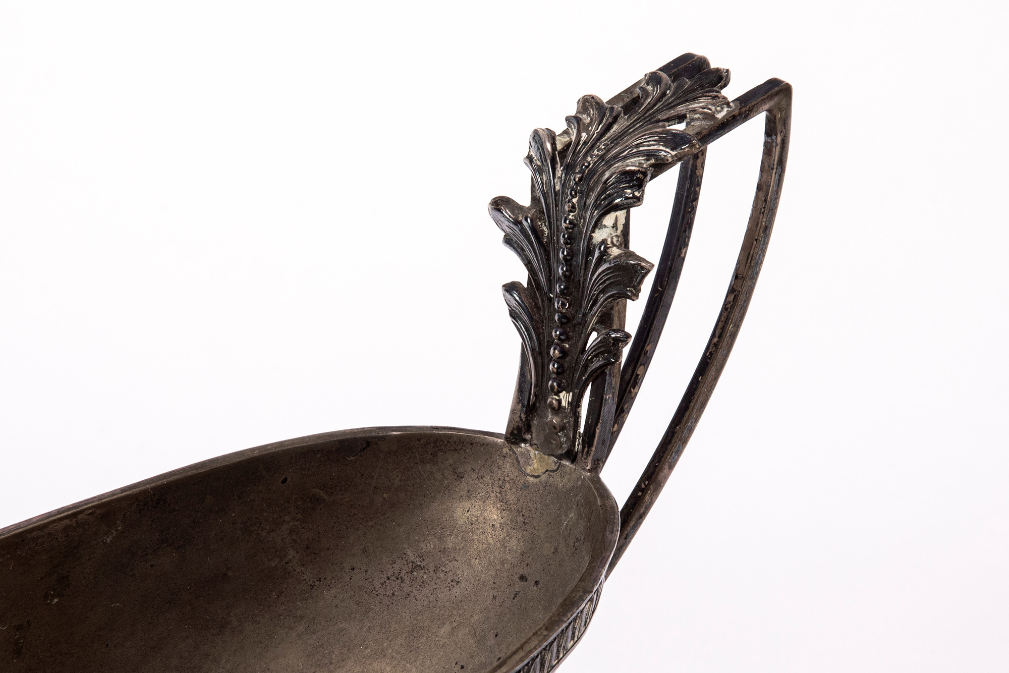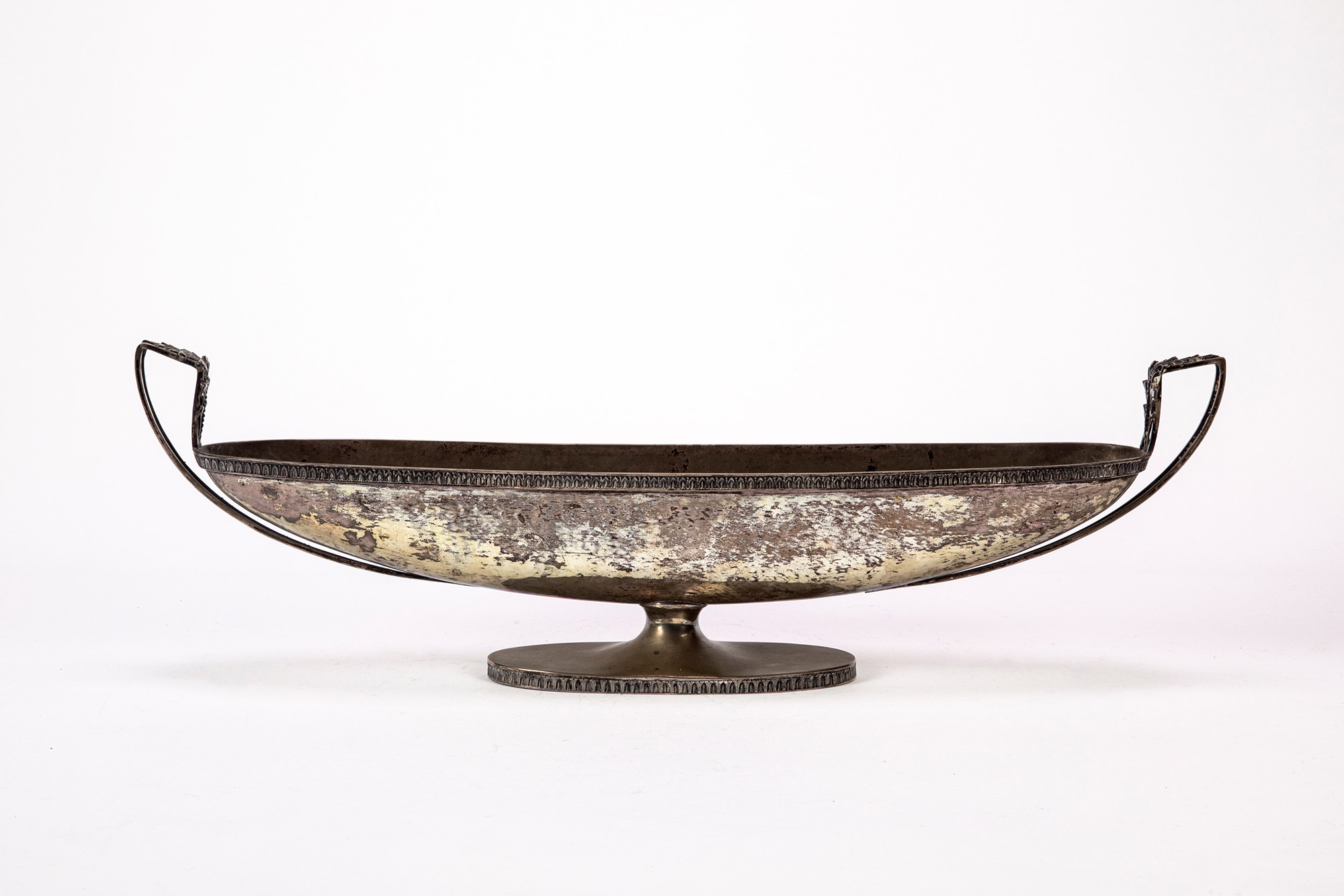 di forma ovale allungata, bordo decorato a palmette, prese laterali con foglie cesellate, base tornita.