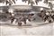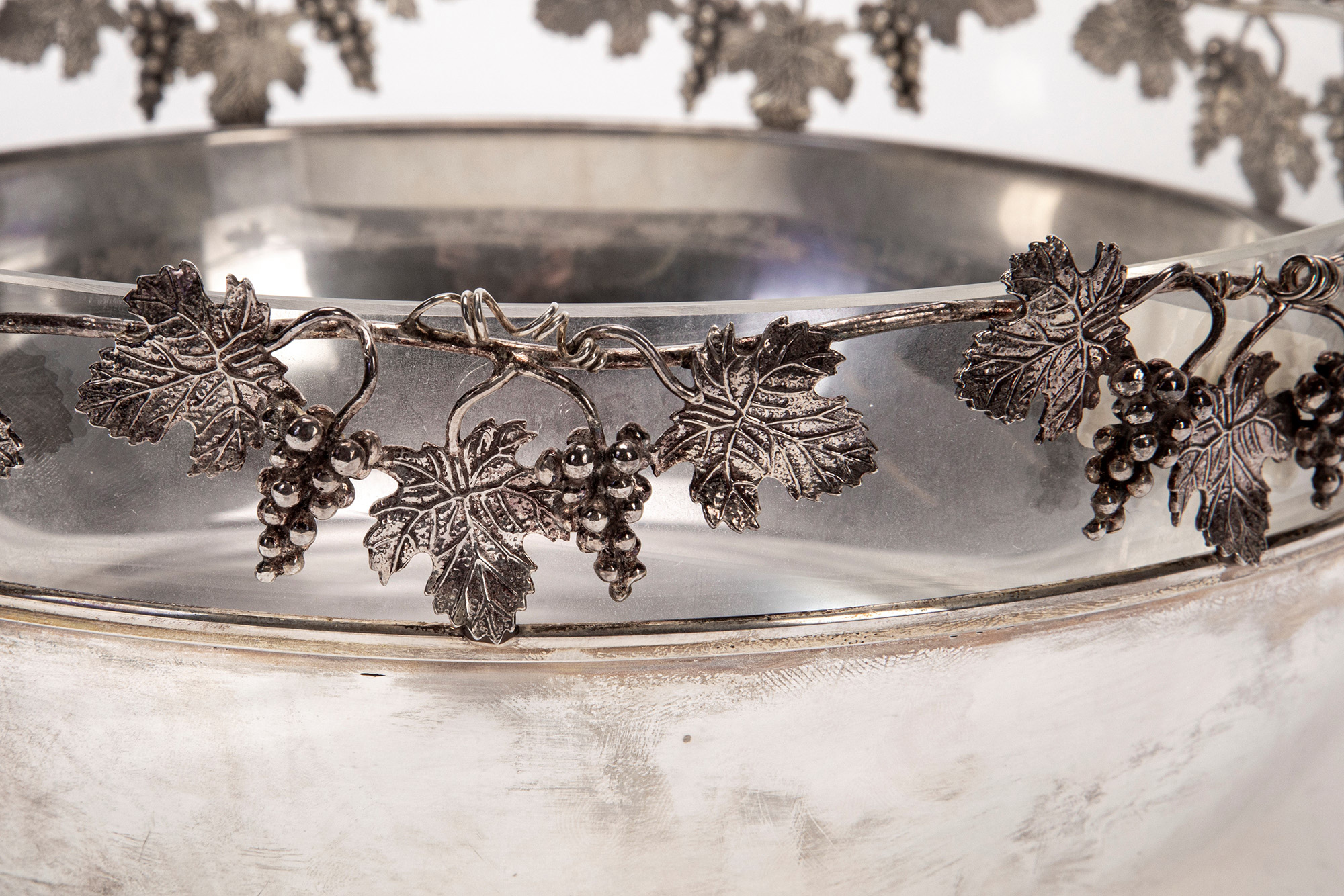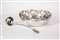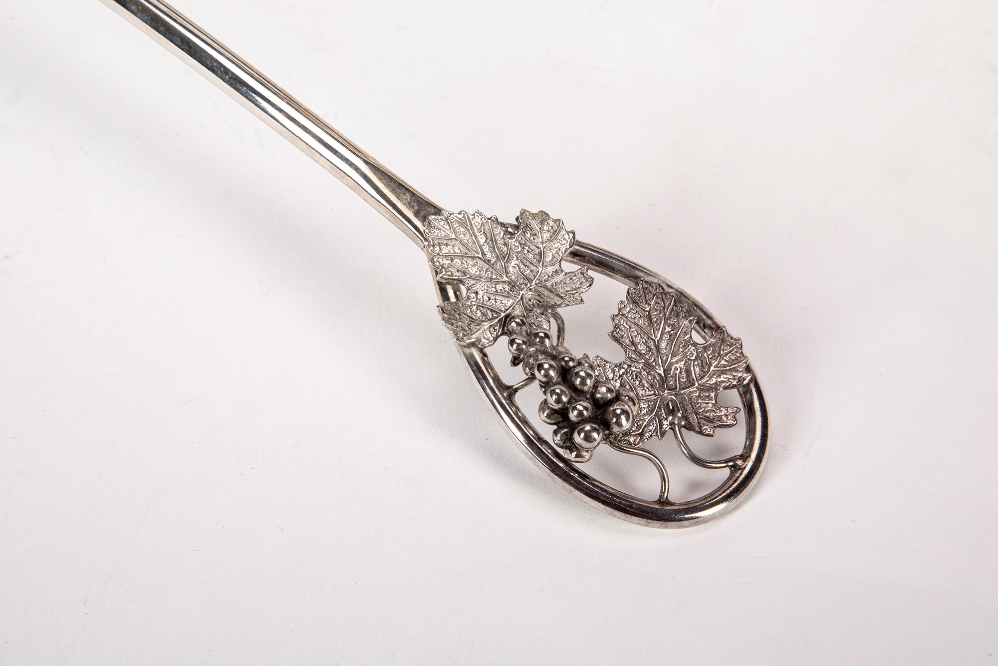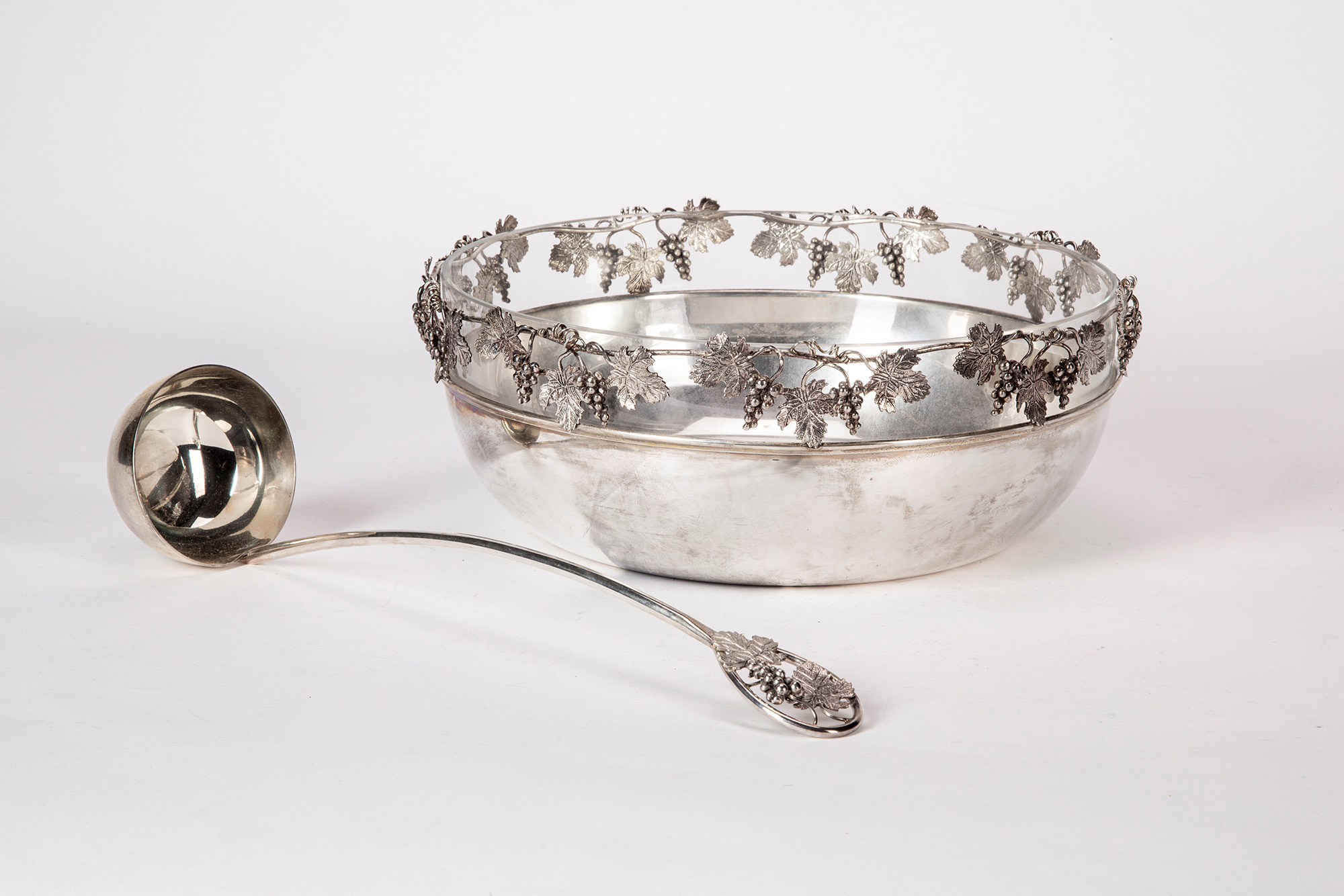 di forma circolare con bordatura finemente cesellata a tralci di vite con uva a tutto tondo, mestolo analogo di forma sagomata anch'esso con decoro a tralci di vite.