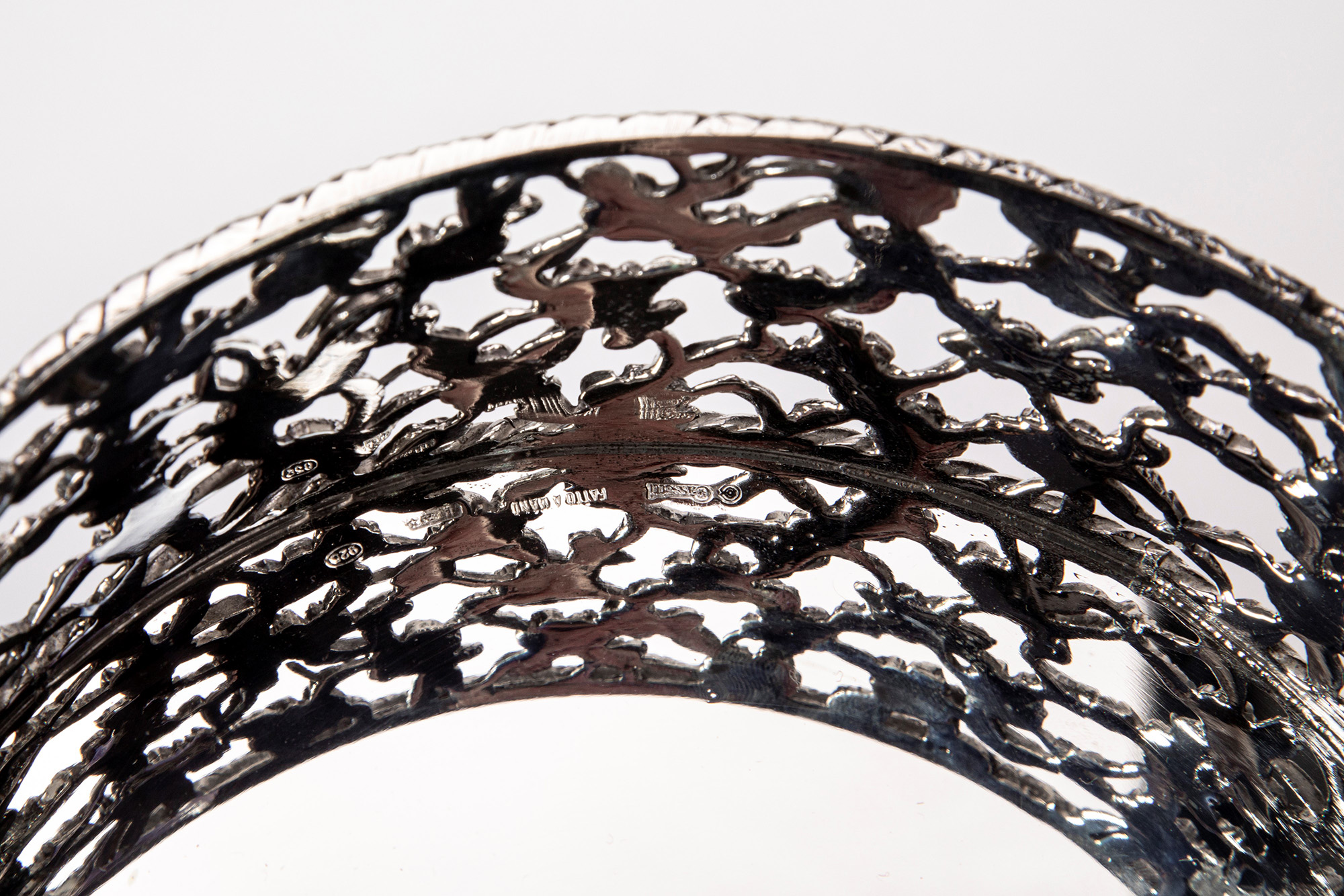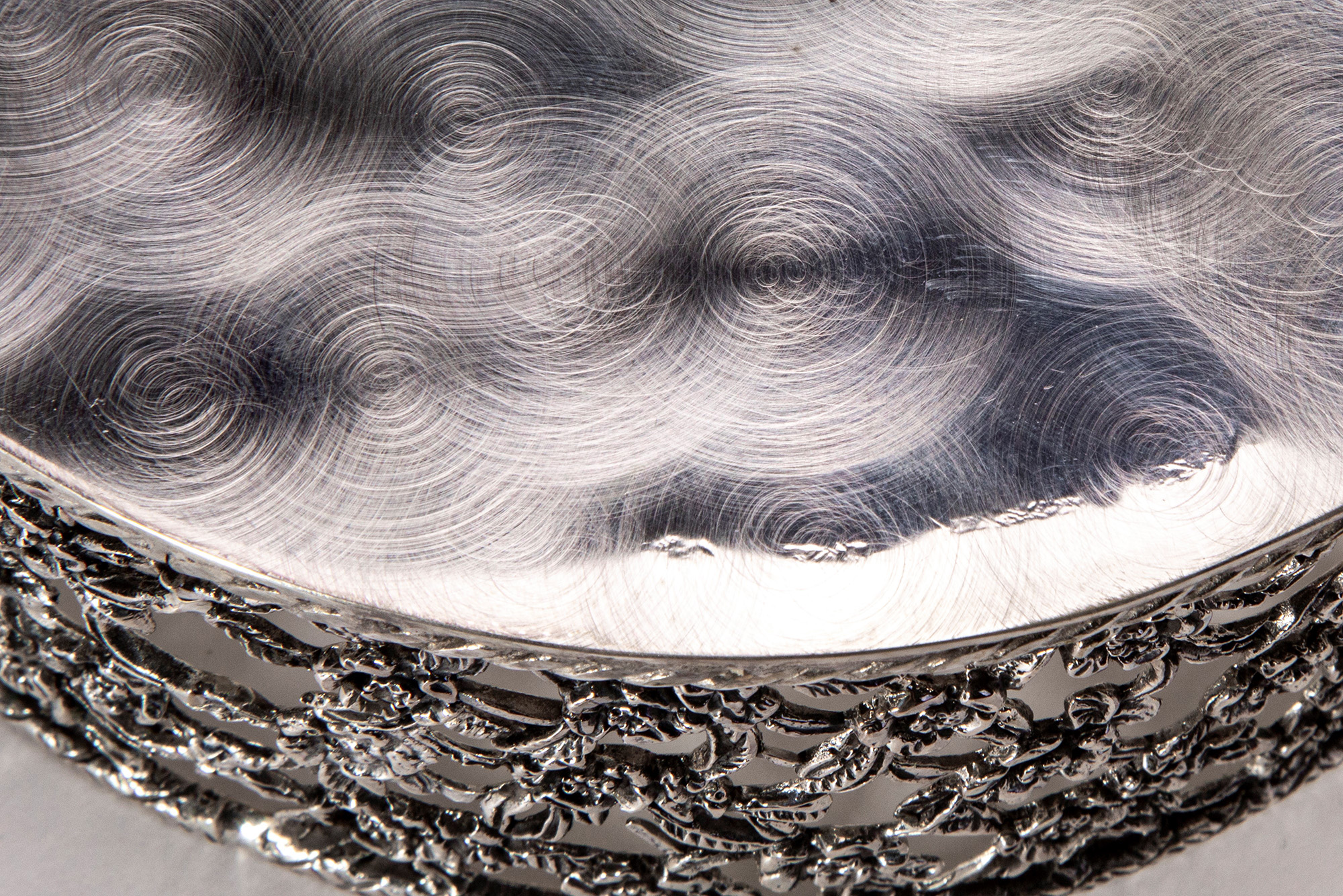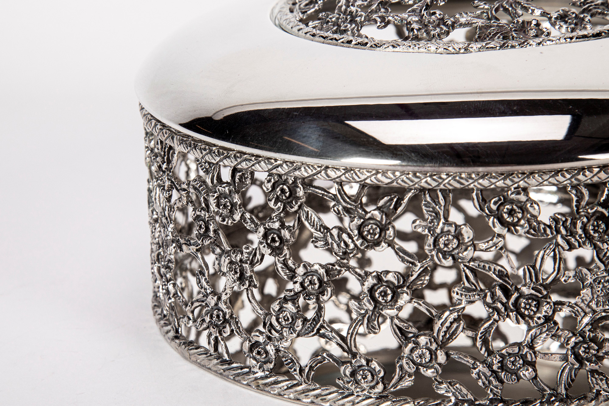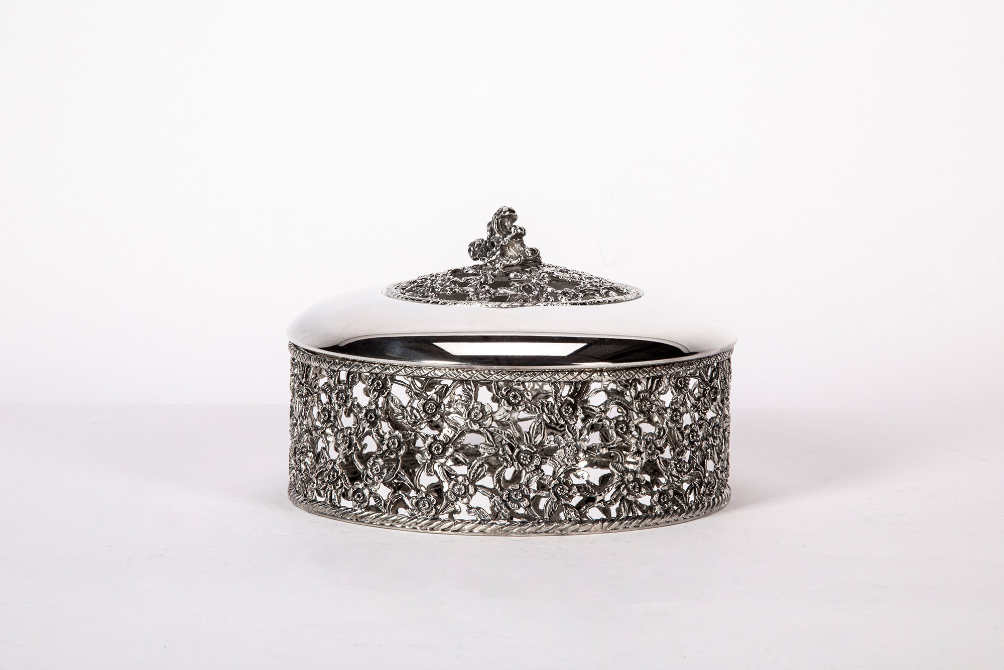 con bordo e coperchio finemente traforati e cesellati a rose, presa del coperchio cesellata a ricciolo.