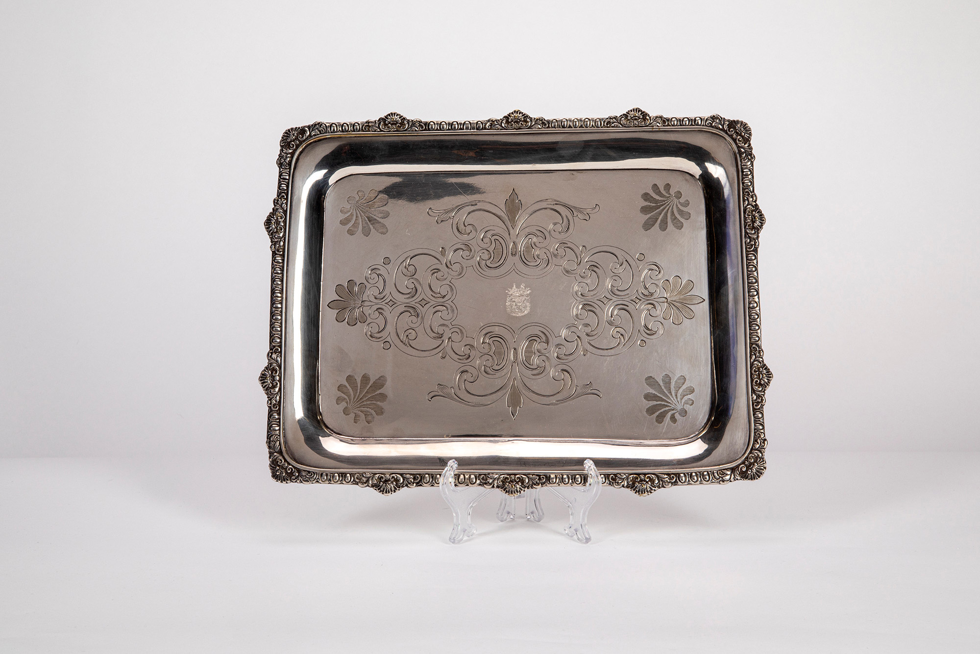 di forma rettangolare con fascia cesellata a motivi stilizzati e cavetto inciso a volute.