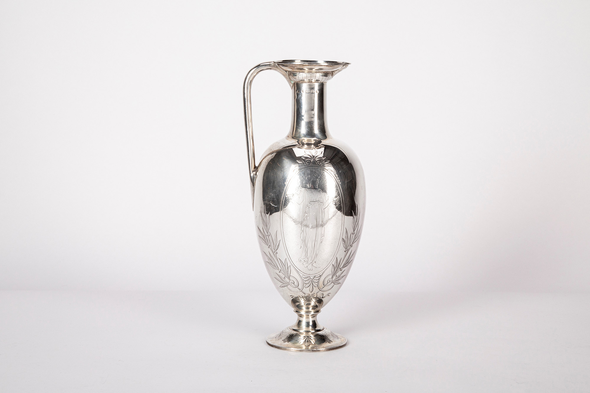 di gusto classico, a corpo ovoidale decorato con incisioni a rami d'ulivo e divinità mitologiche entro medaglioni, manico mosso e piede circolare.