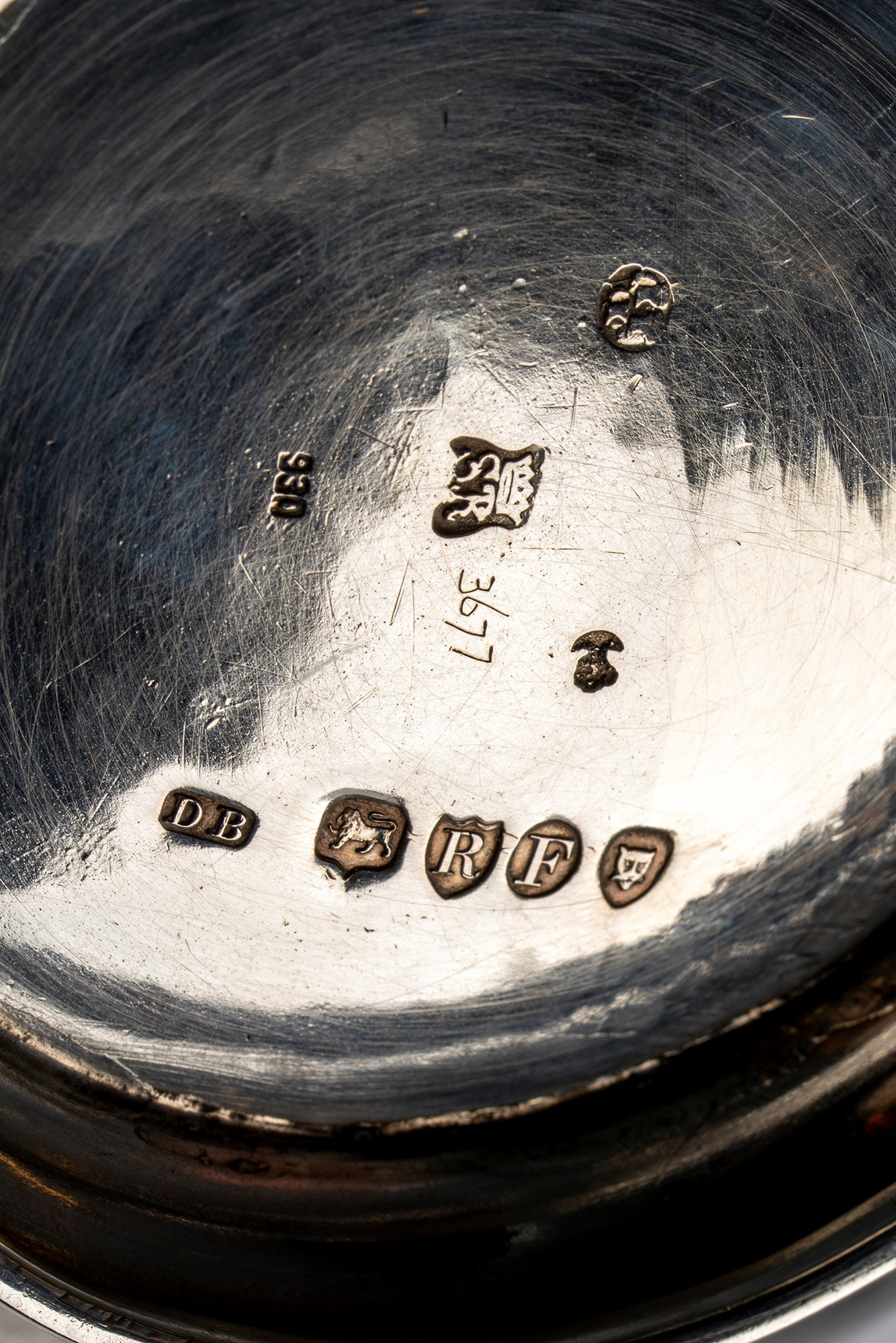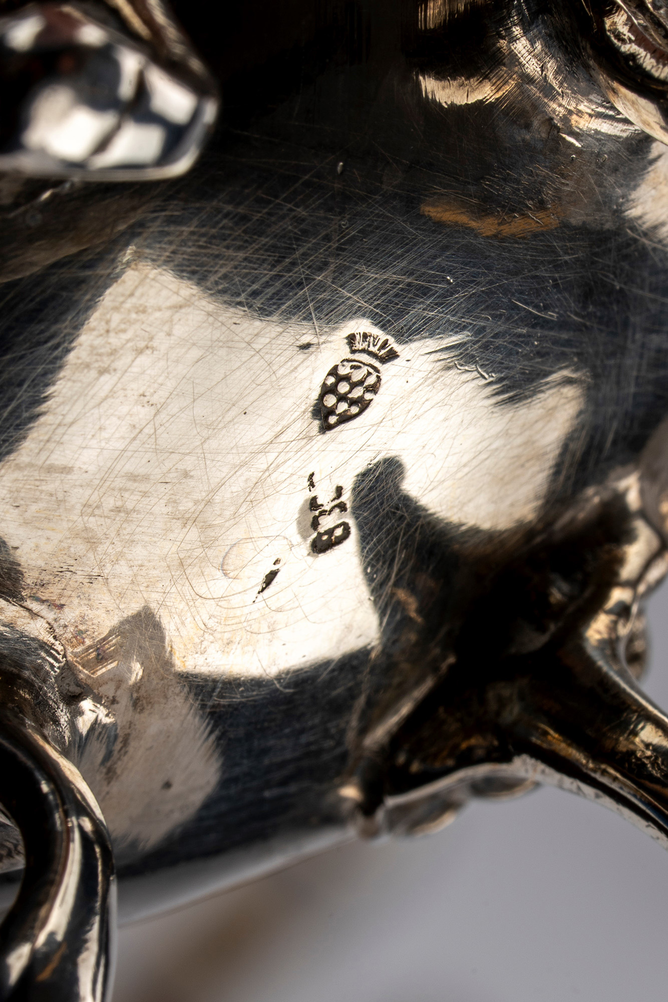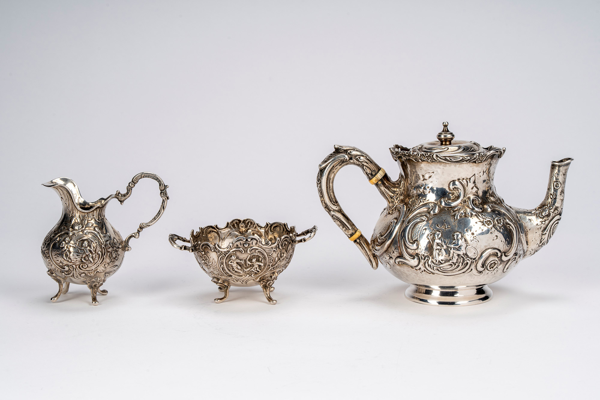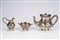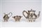 composto da teiera, lattiera e zuccheriera, a corpo bombato decorato con sbalzi in rilievo a figure, volute e fiori, prese mosse, punzoni diversi.