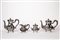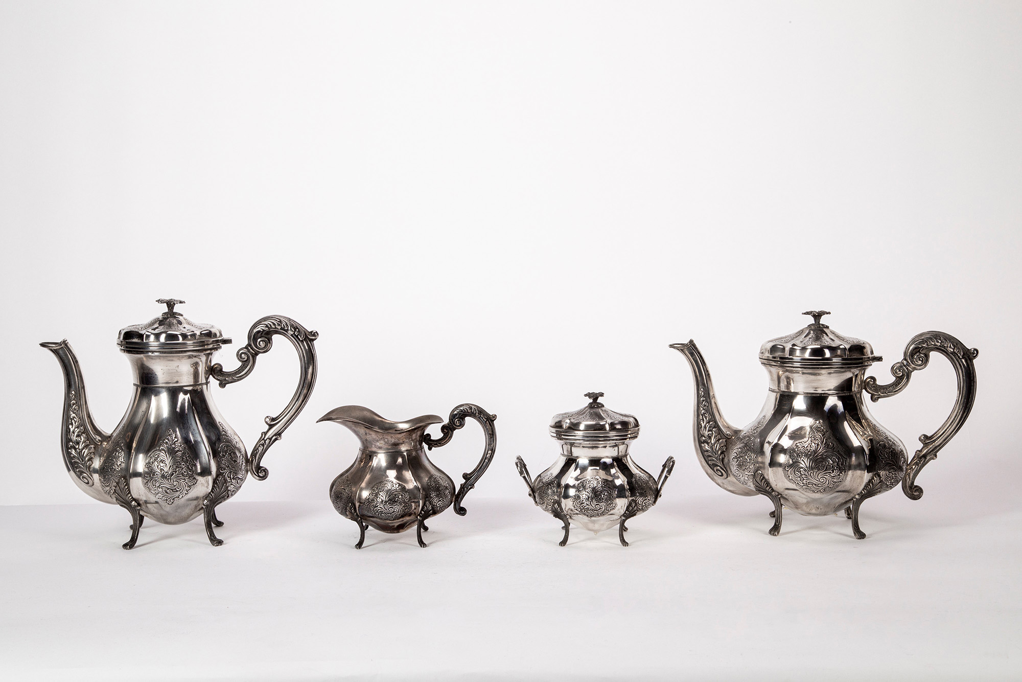composto da lattiera, caffettiera, teiera e zuccheriera, a corpo bombato sbalzato a motivi fogliacei, prese e beccucci mossi, coperchi con prese cesellati a fiori a tutto tondo.