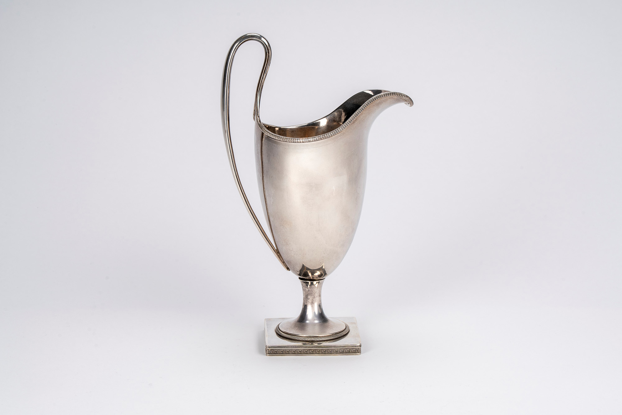 a corpo liscio, brocca di forma mossa con presa sagomata, base squadrata decorata con motivo concatenato geometrico, bacile di forma ovoidale con bordatura scanalata.