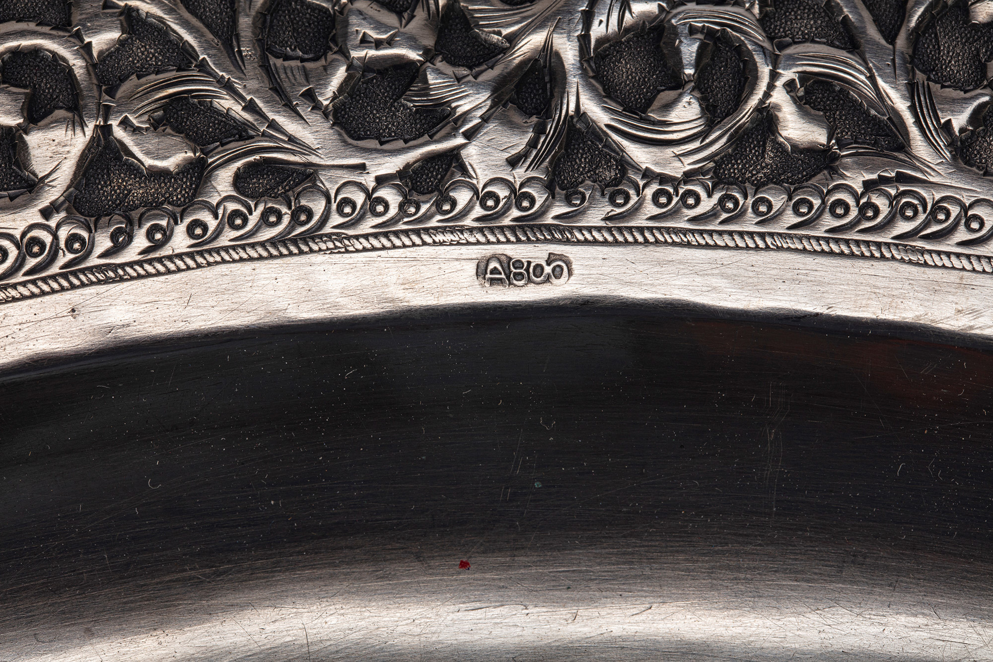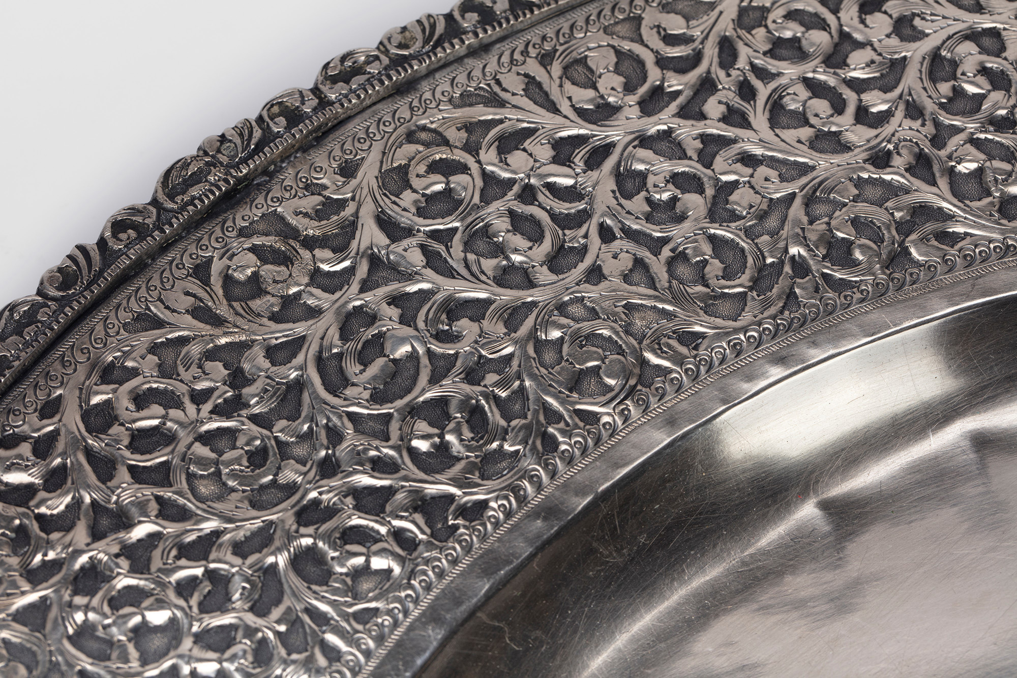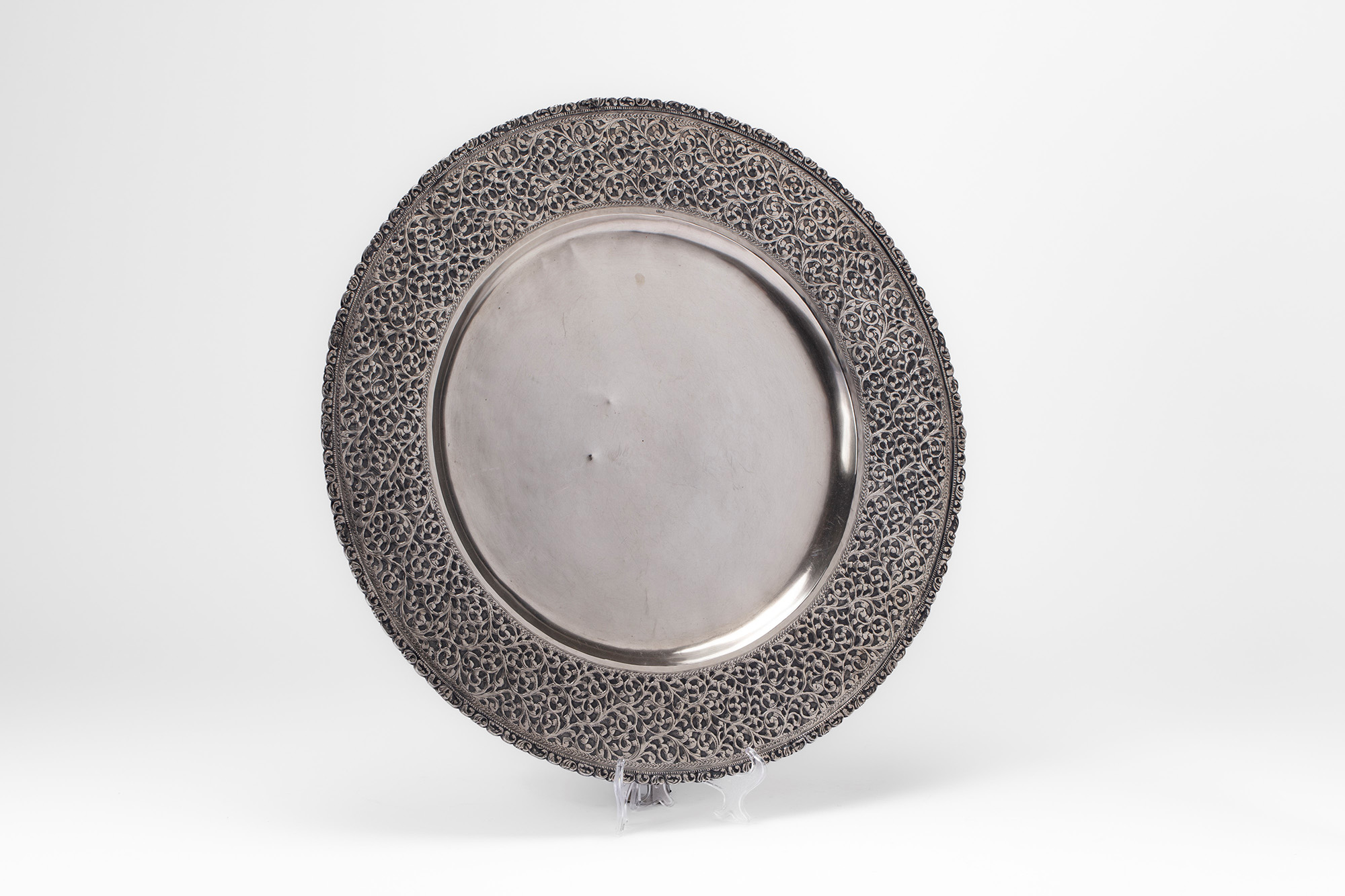 di forma tonda, bordo traforato inciso e cesellato.