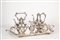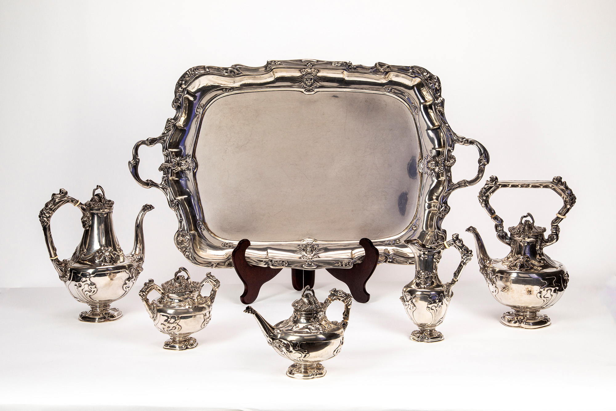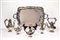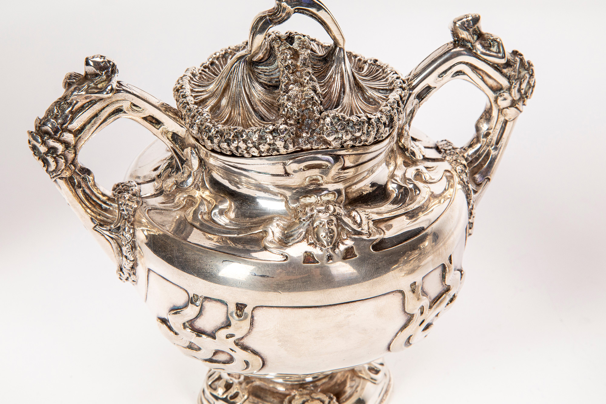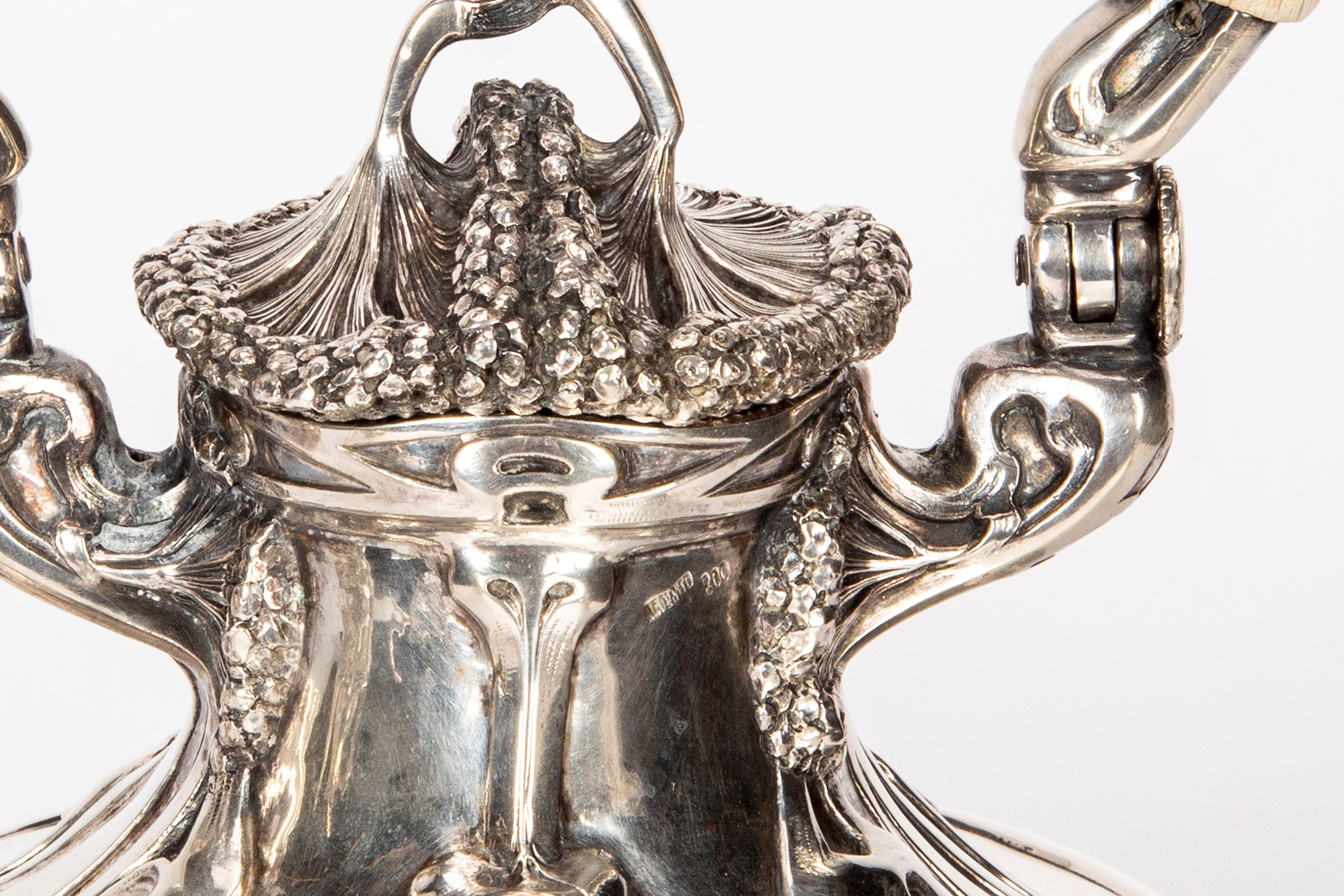 finemente sbalzato a motivi stilizzati, mascheroni allegorici, e sirene sulle prese, decoro a motivi floreali e rami, composto da samovar, teiera, caffettiera, zuccheriera, lattiera e vassoio biansato, samovar mancante del supporto.