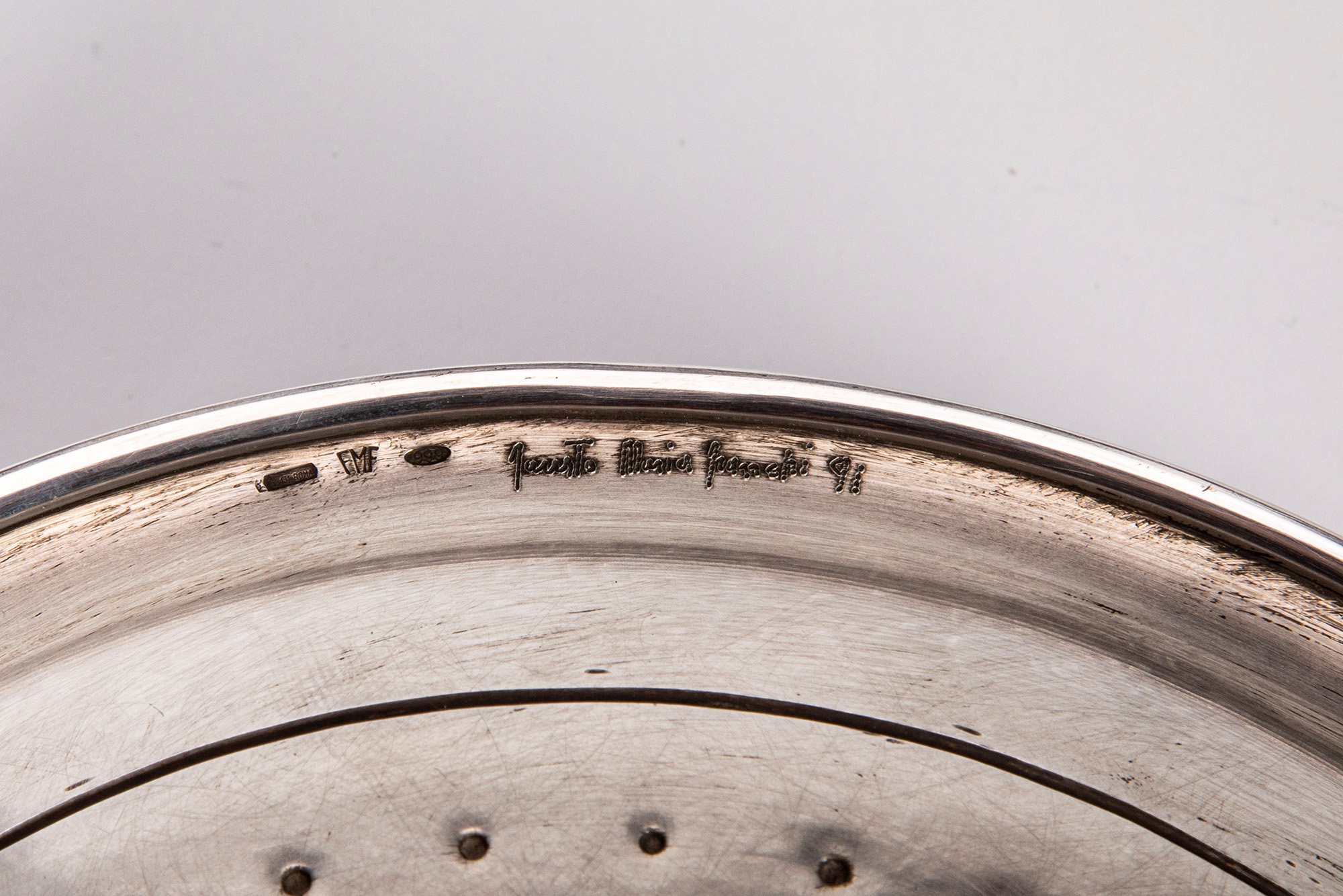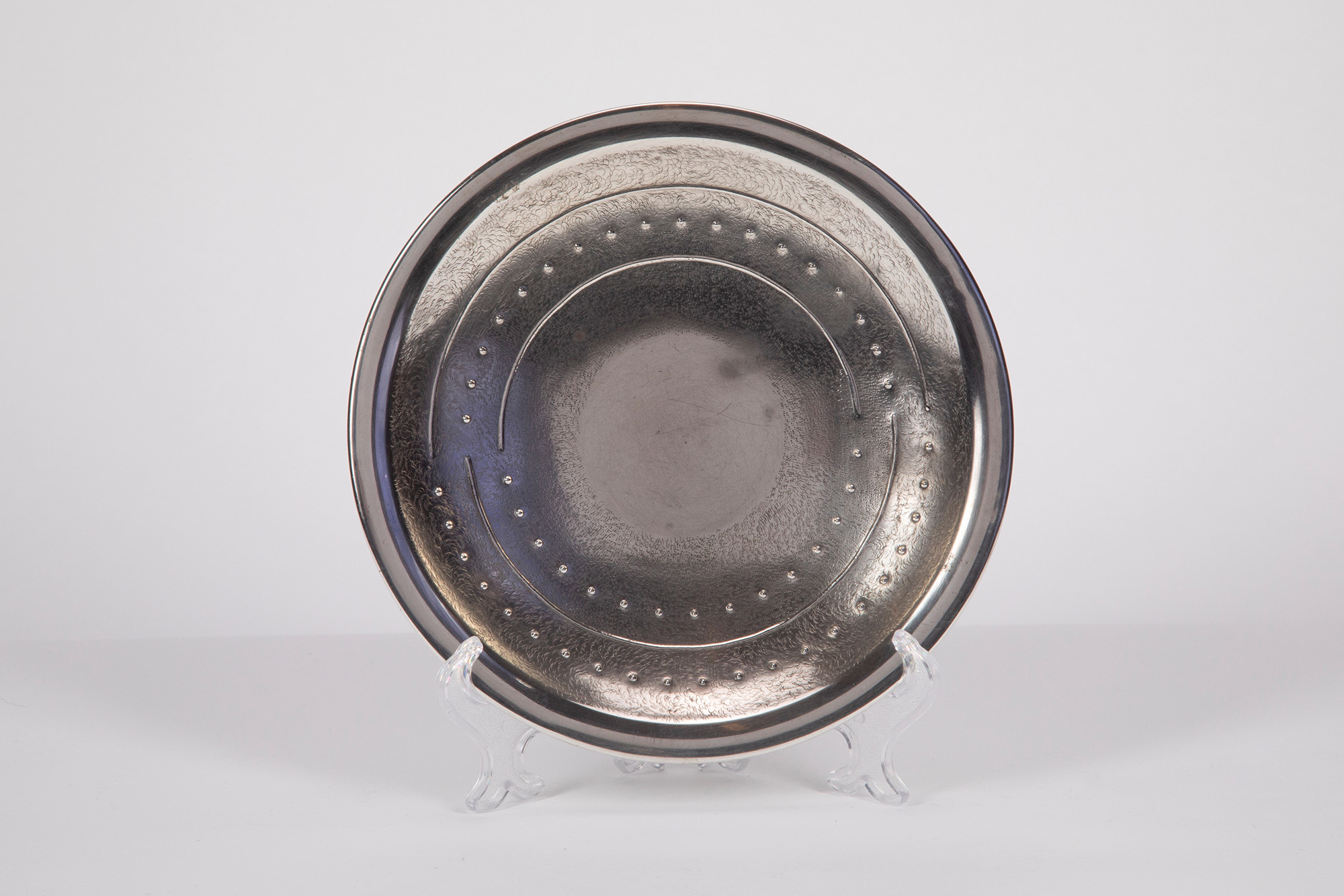 di forma circolare decorato con motivo astratto a punzonature tonde e semi cerchi su sfondo leggermente inciso. Firmato, punzonato e datato alla base.