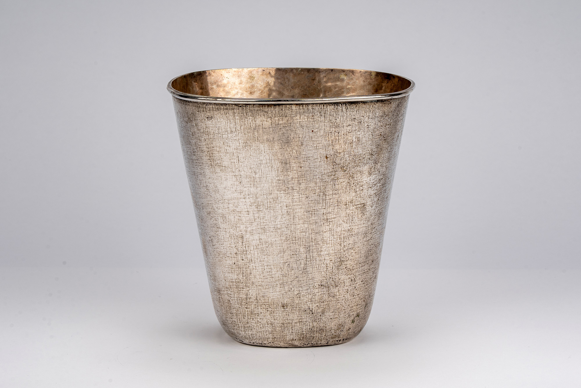 di forma conica leggermente squadrata e arrotondata con corpo decorato a leggere martellature e piccole incisioni,