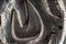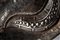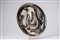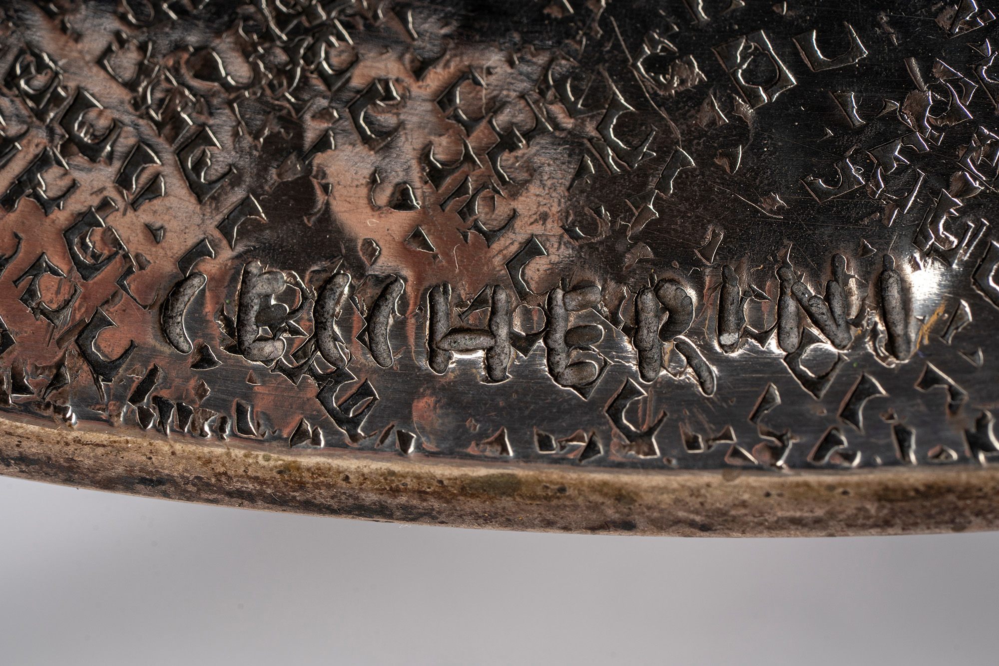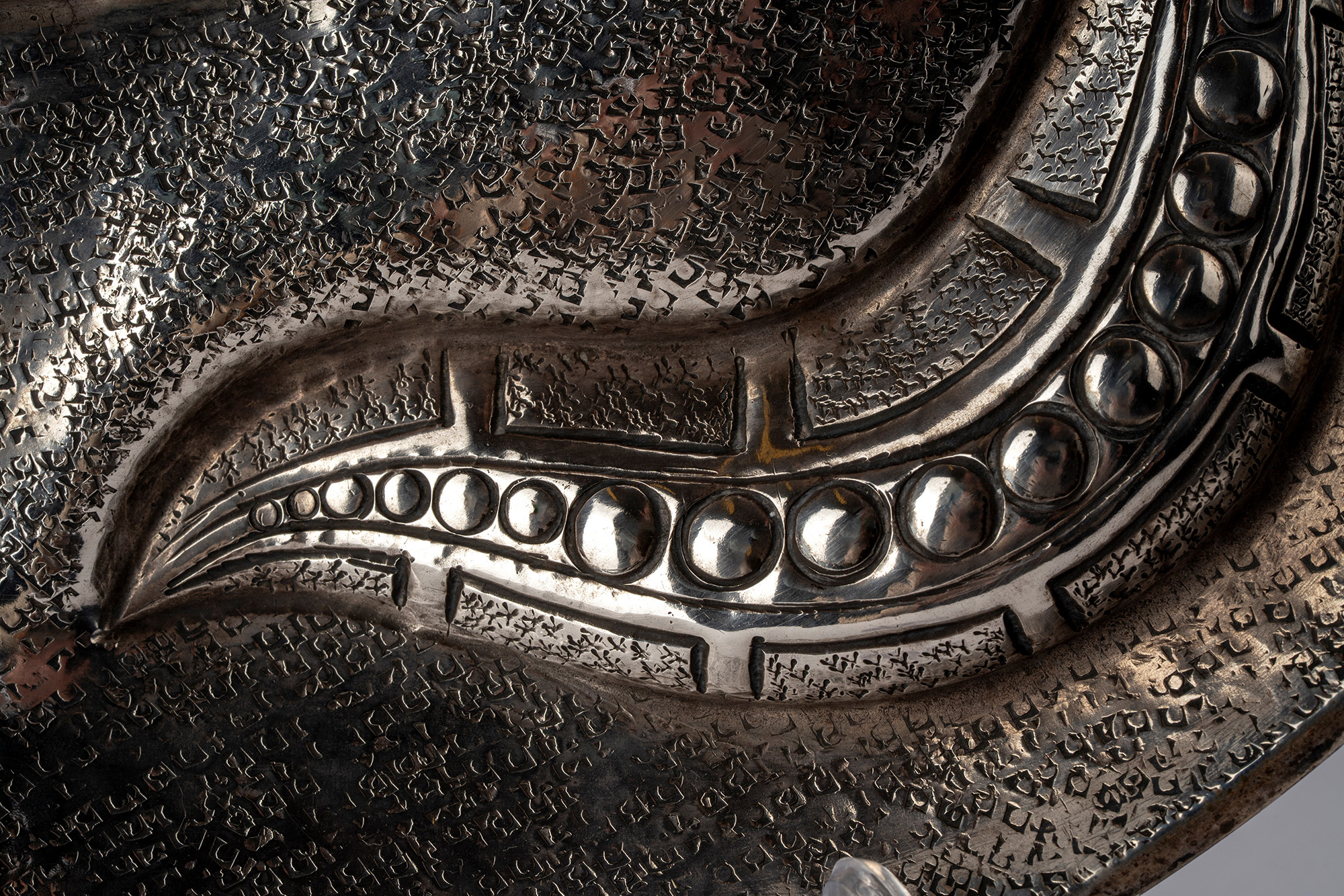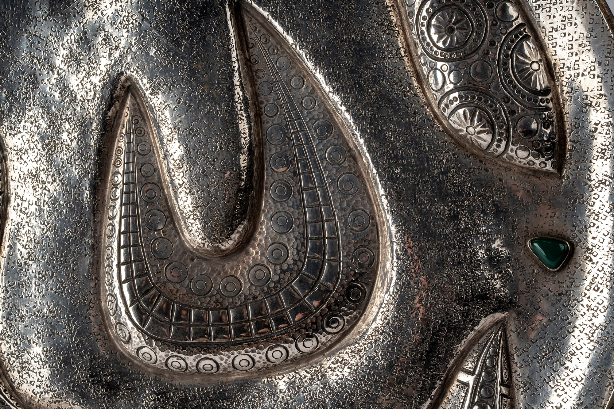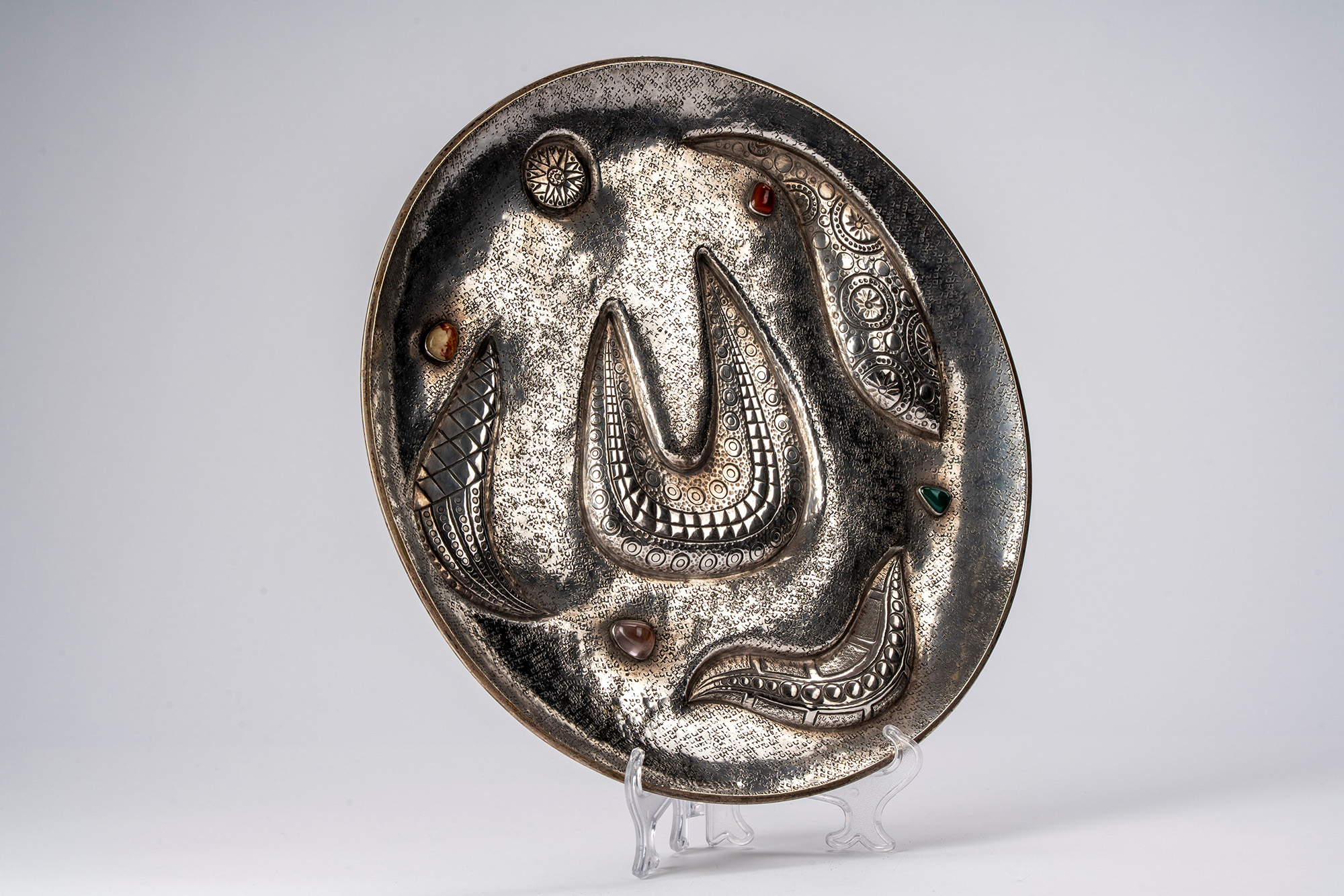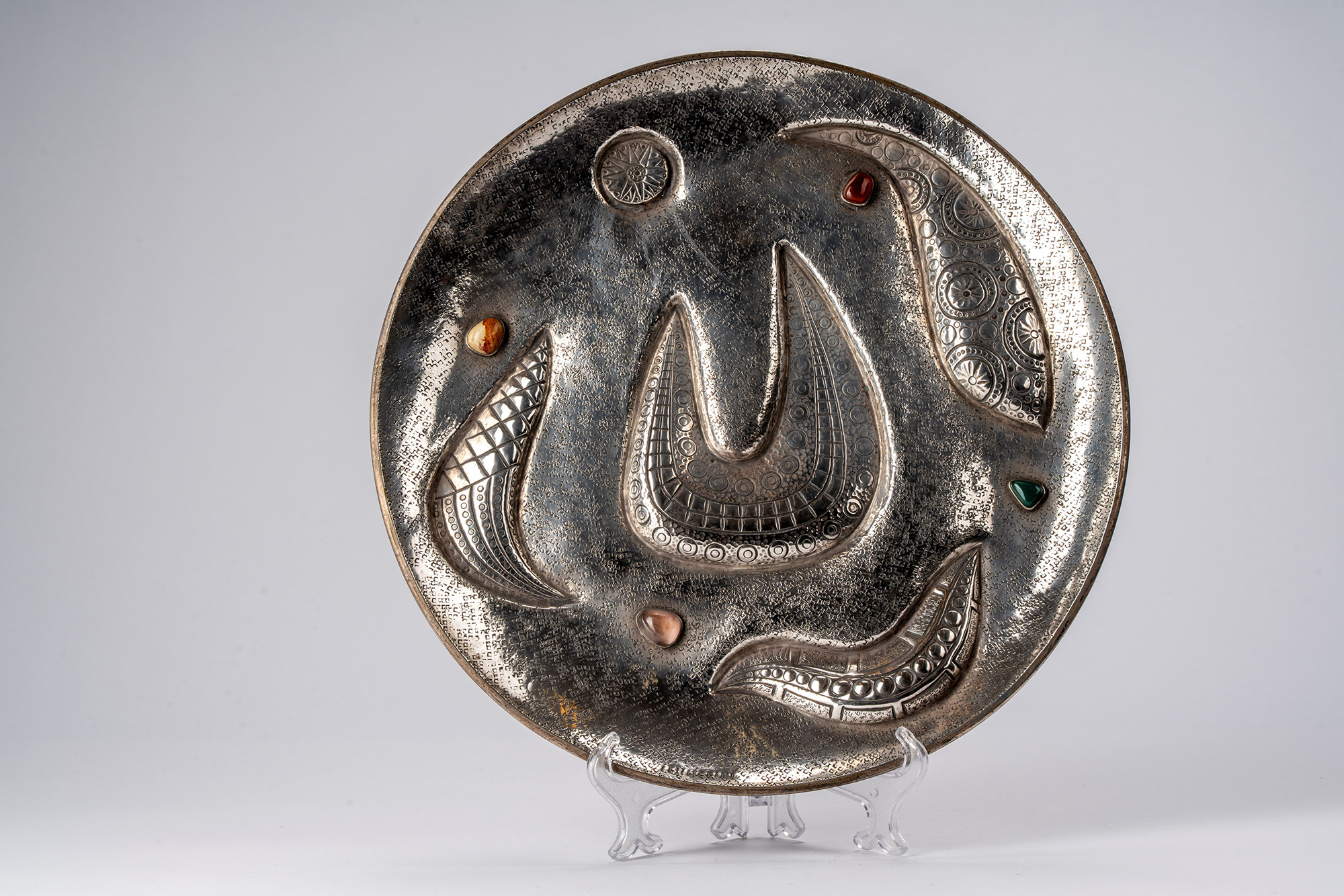 con cavetto sbalzato a motivi di gusto tribale ed incisioni martellate, decori in rilievo con pietre dure cabochon policrome, firmato dall’autore in basso al centro, firmato e punzonato alla base.