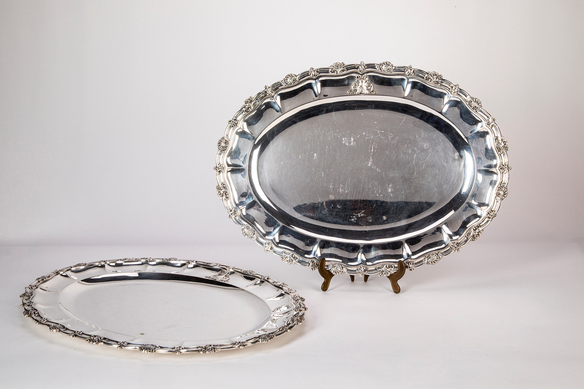 di forma ovale sagomata con bordo cesellato a fiori e valve di conchiglie stilizzate, sulla fascia stemma araldico in rilievo.