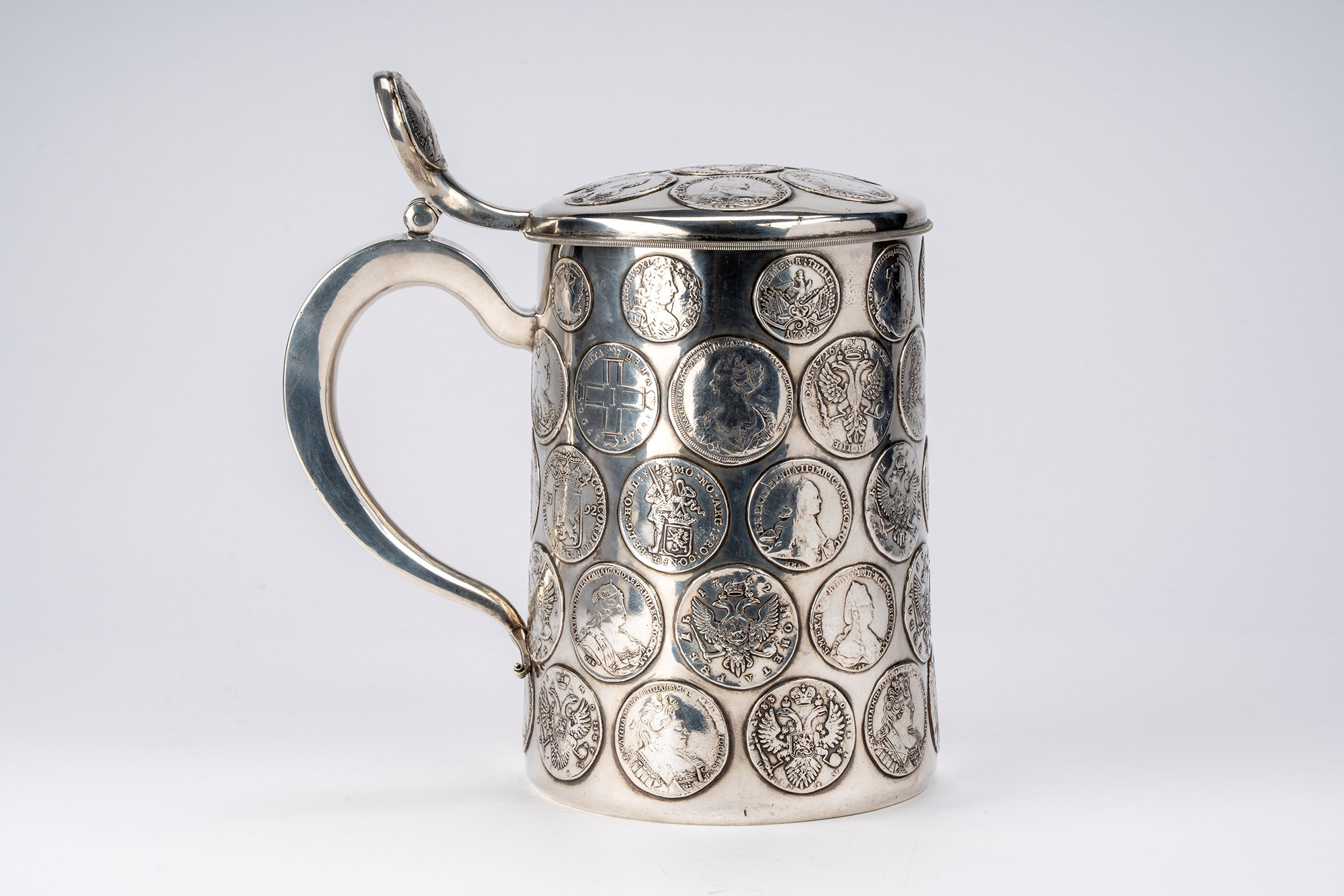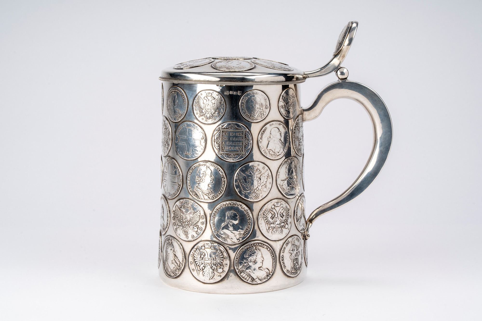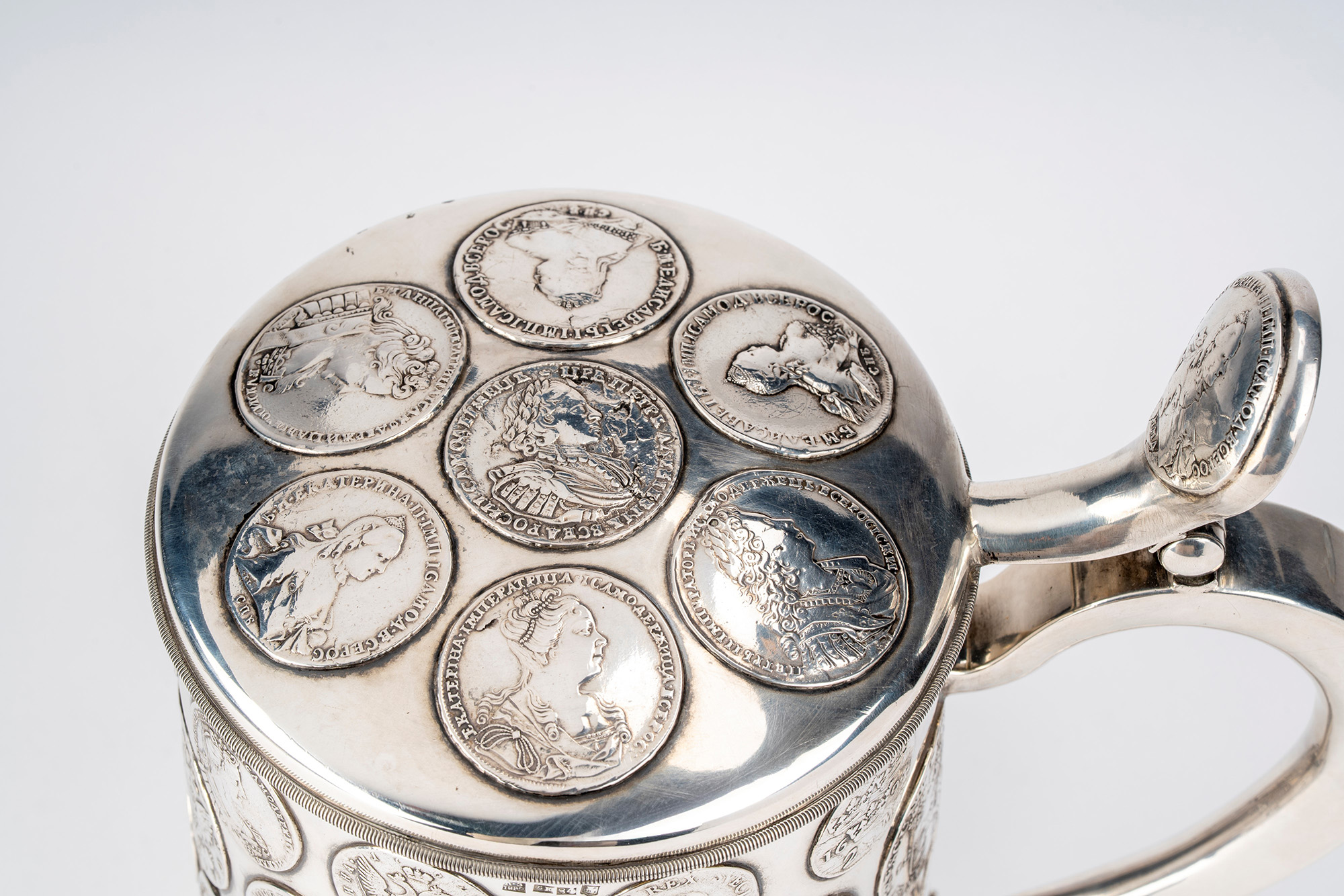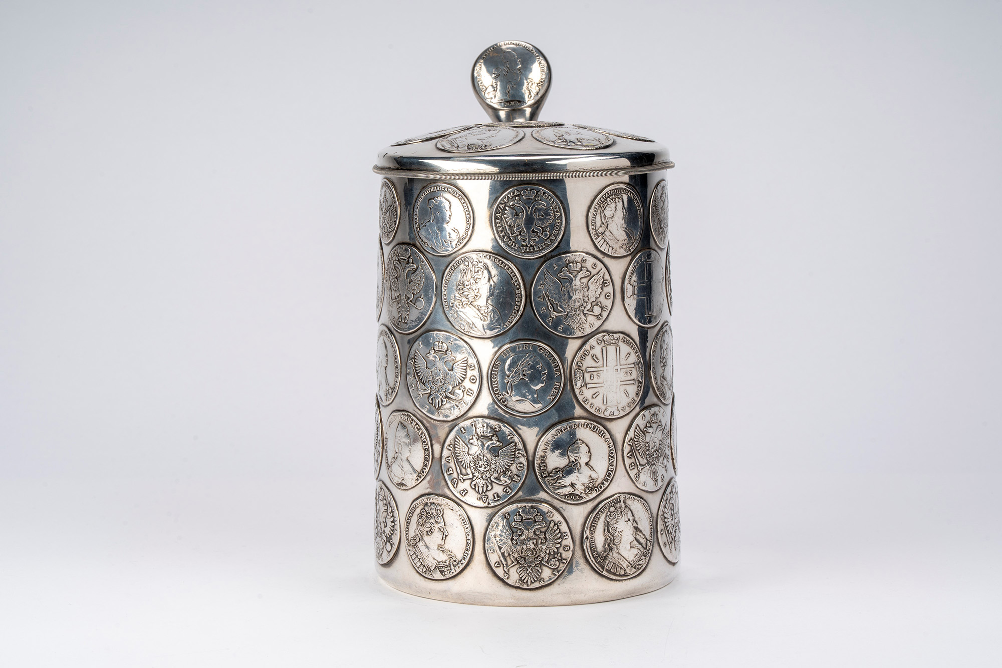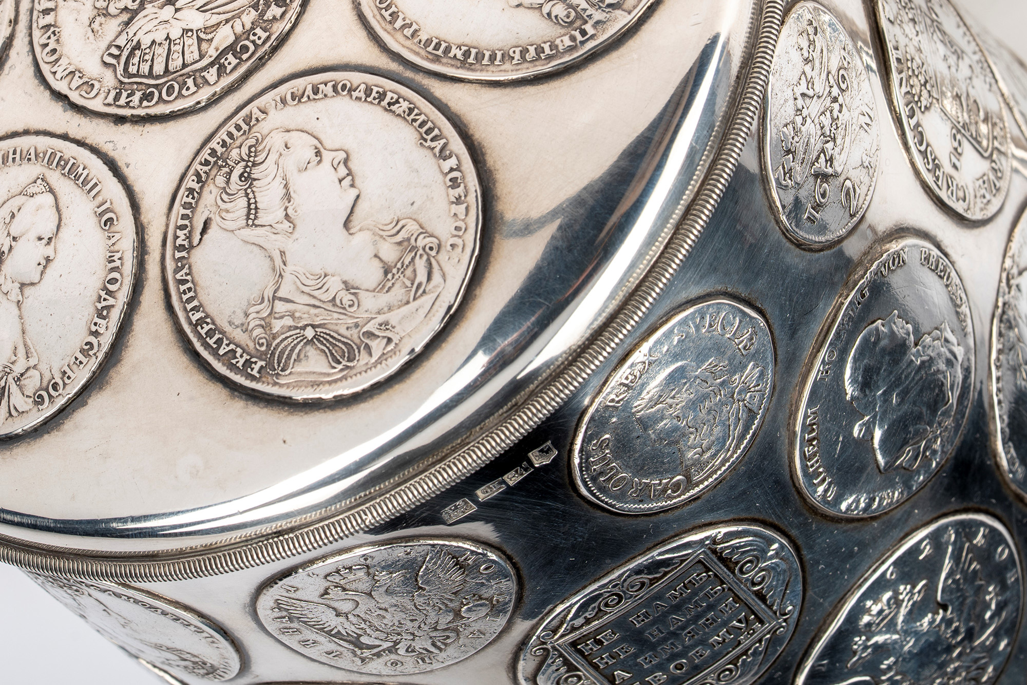 a corpo cilindrico completamente rivestito sul corpo, sul coperchio e sul fondo da monete incastonate (Rubli) del secolo XVIII e XIX. Presa mossa