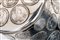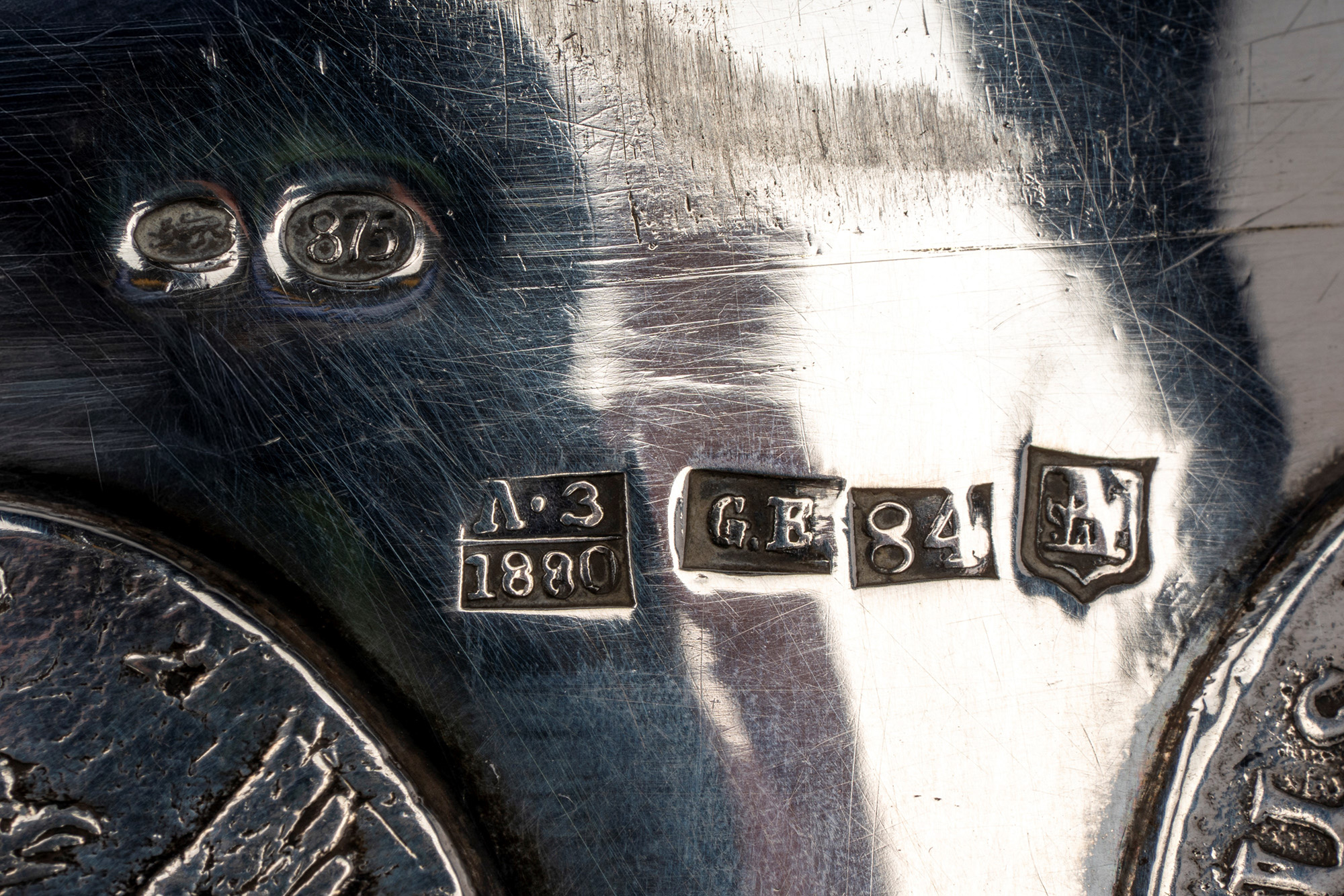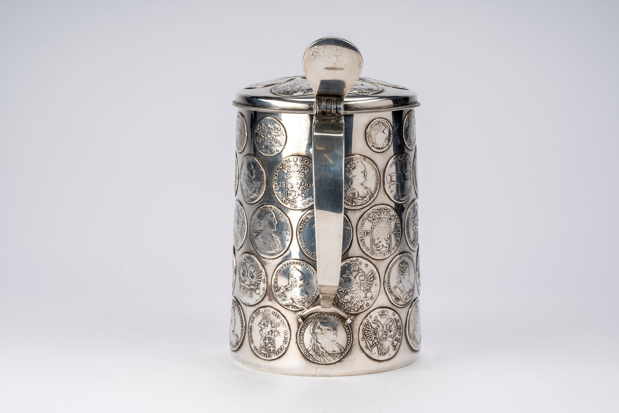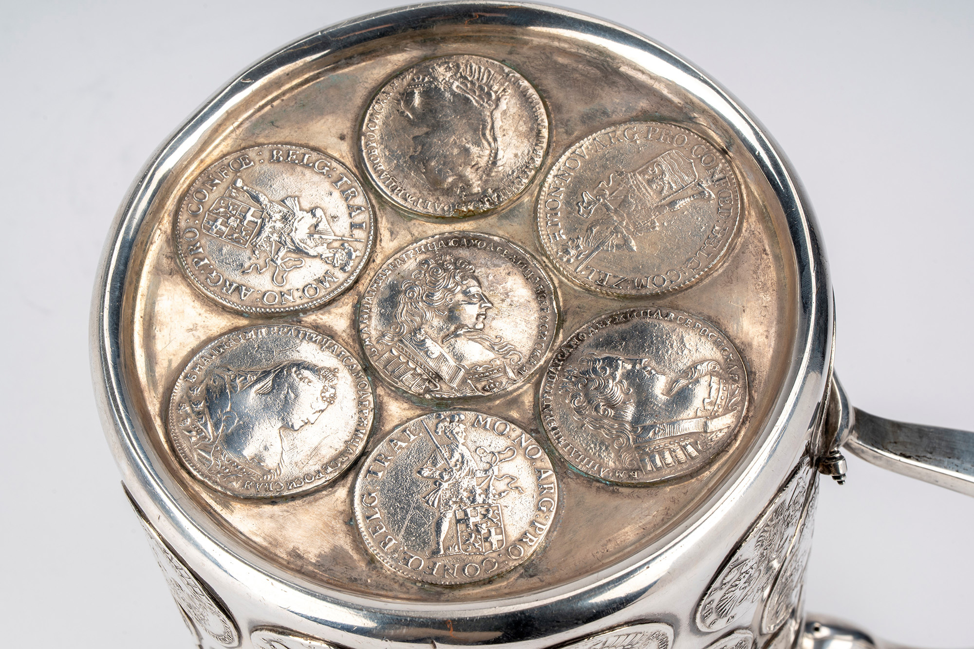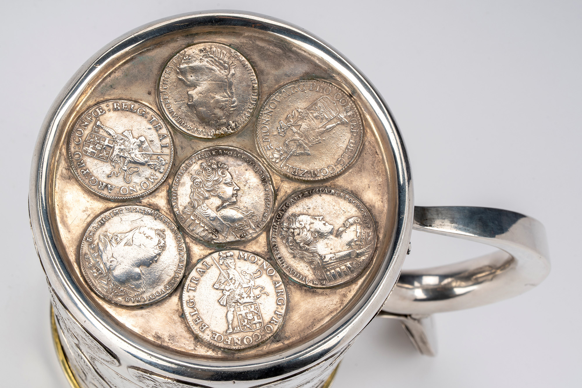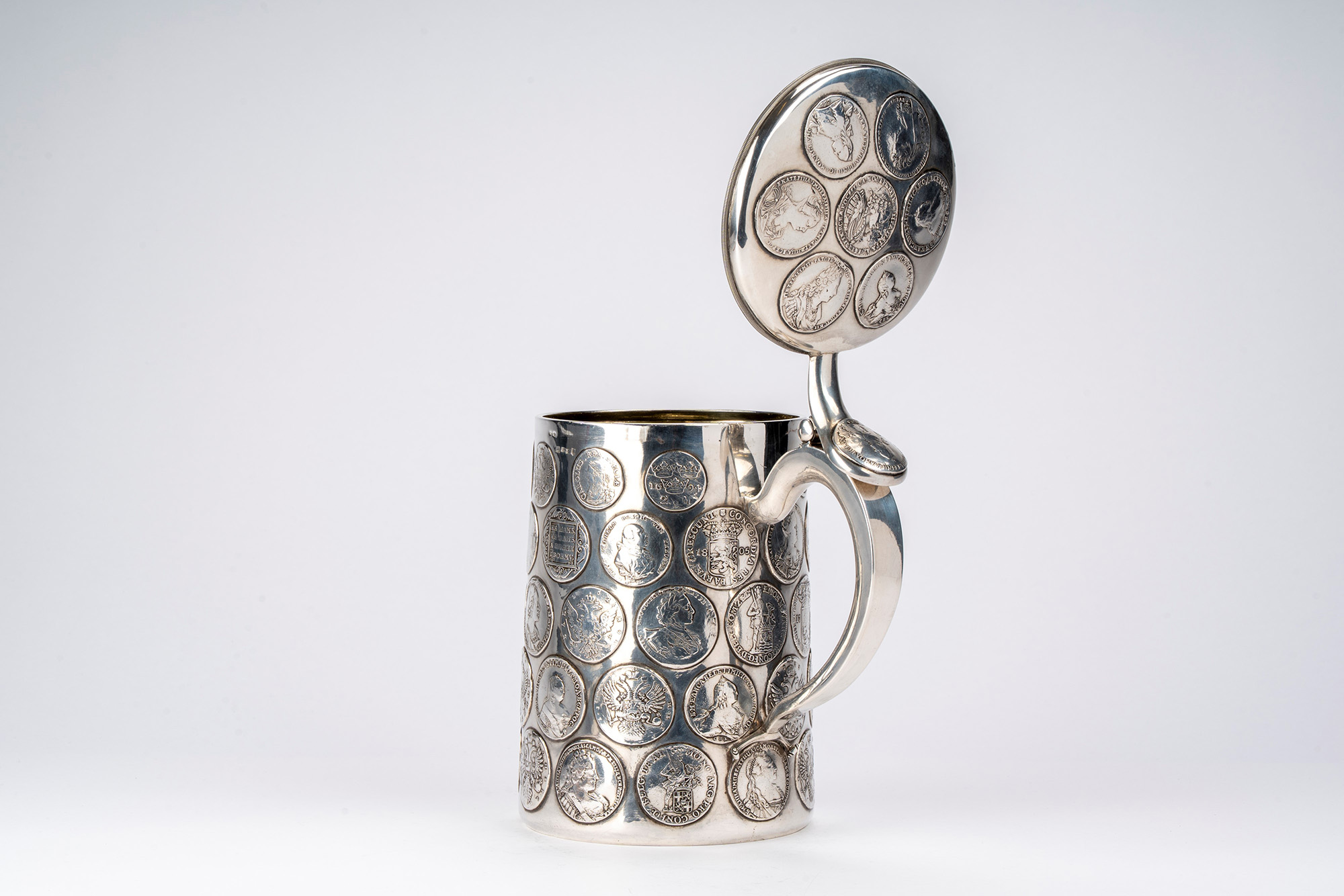 a corpo cilindrico completamente rivestito sul corpo, sul coperchio e sul fondo da monete incastonate (Rubli) del secolo XVIII e XIX. Presa mossa