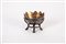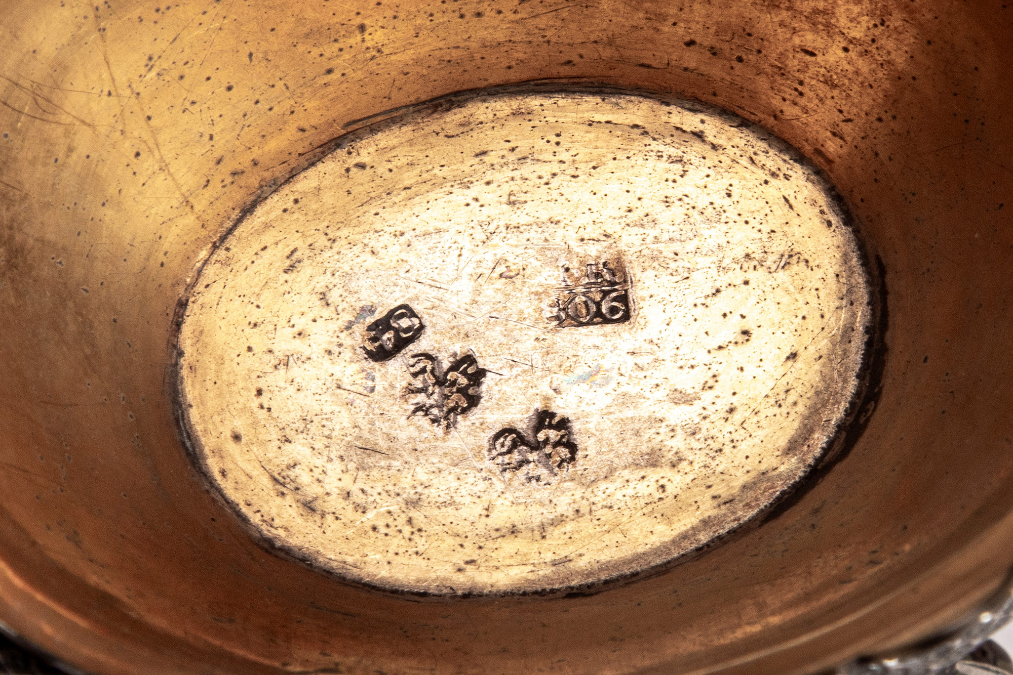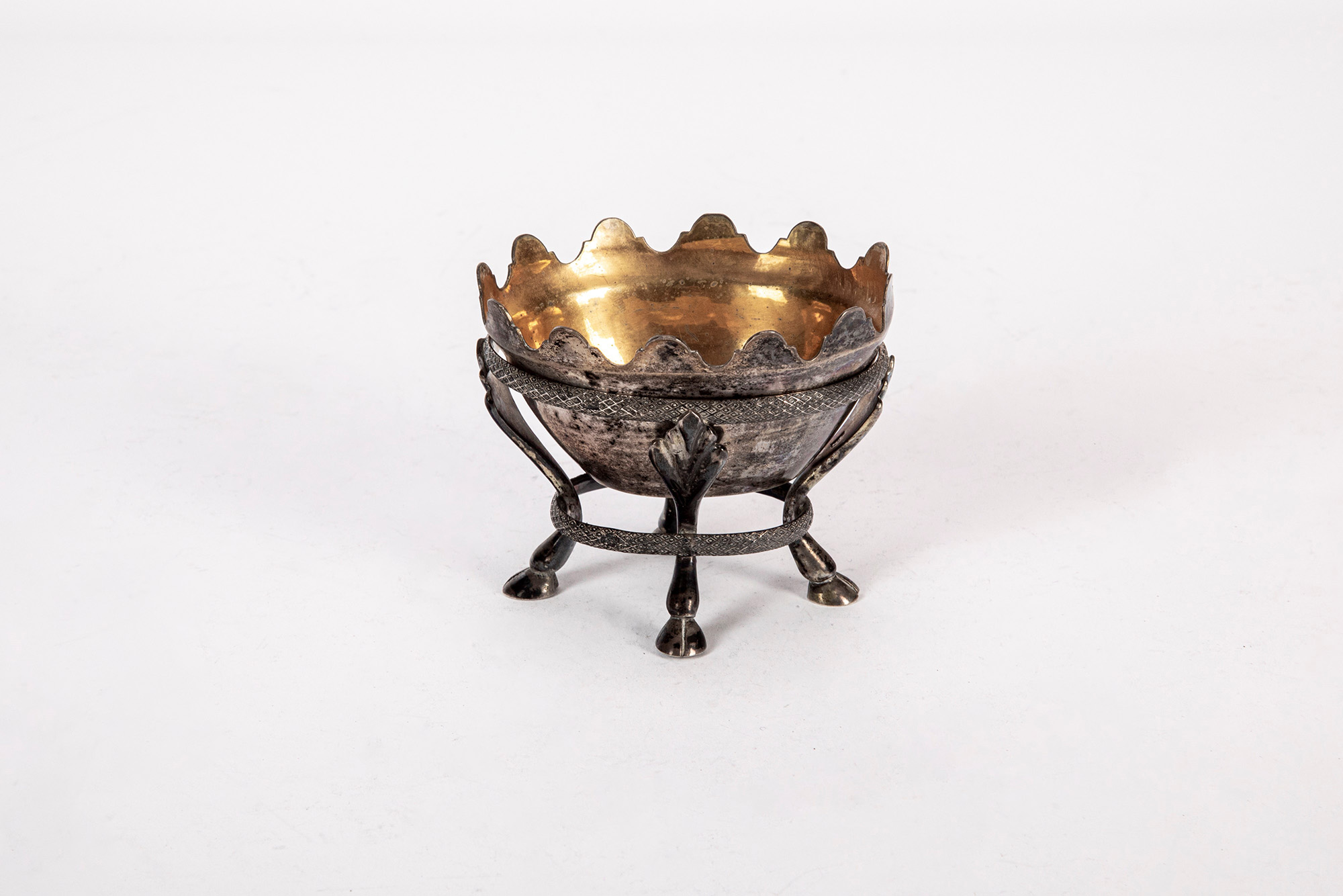con vaschetta a bordo sagomato con interno in vermeil poggiante su base a quattro gambe cesellate a foglie e terminanti a piedini riunite da fasce incise a motivo geometrico. (Lievi difetti).