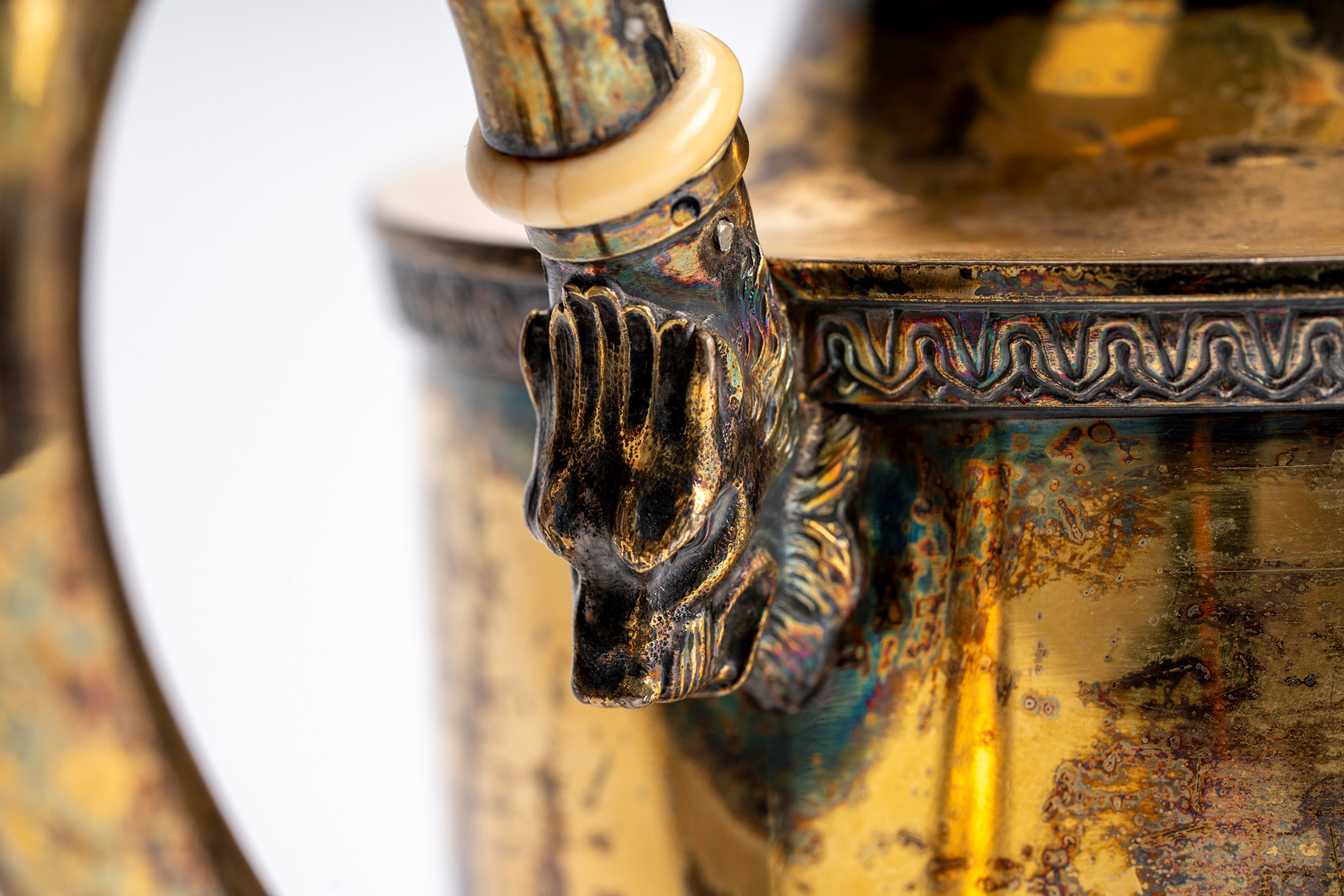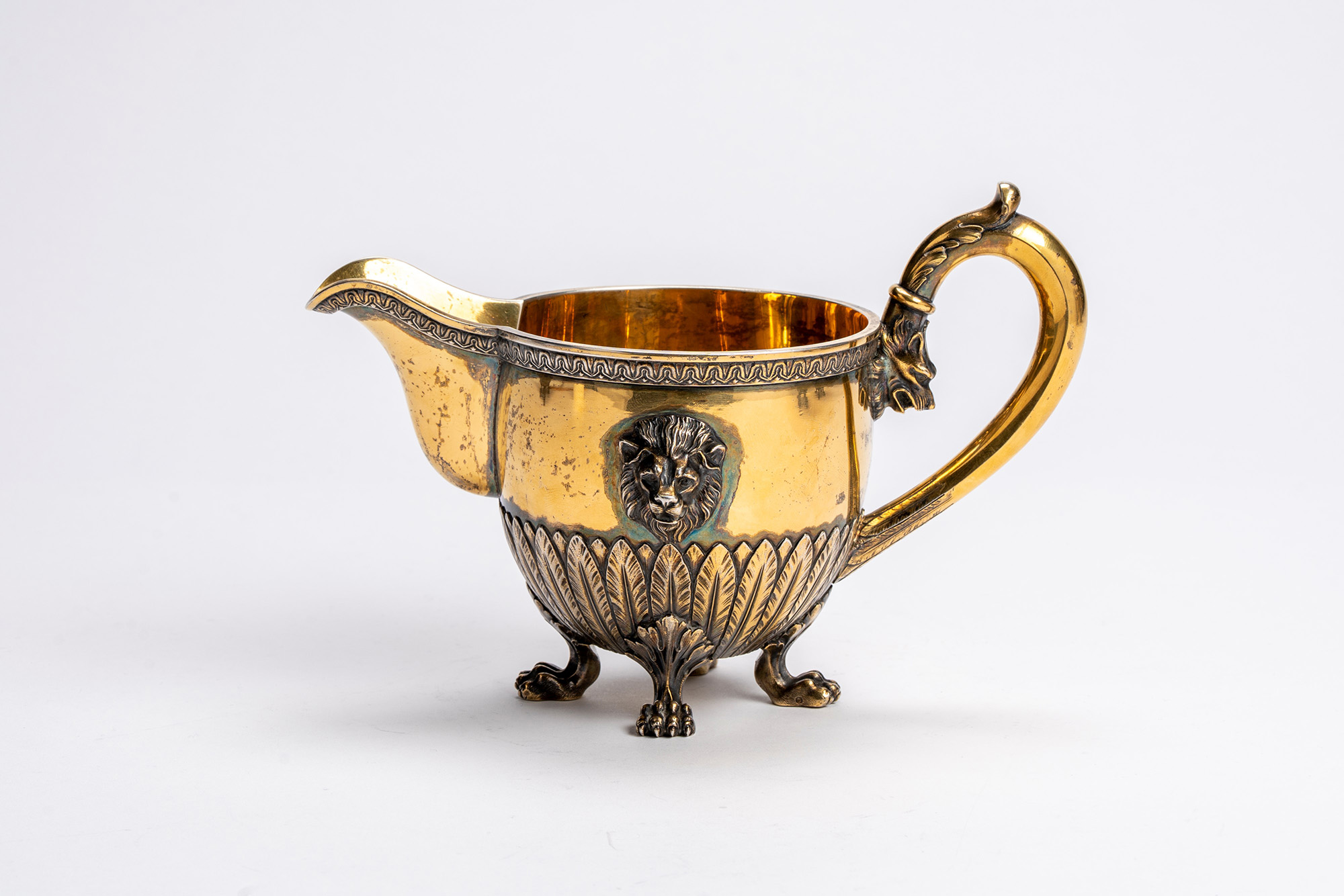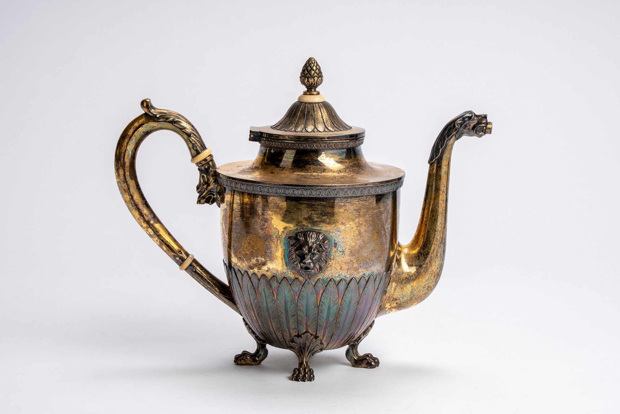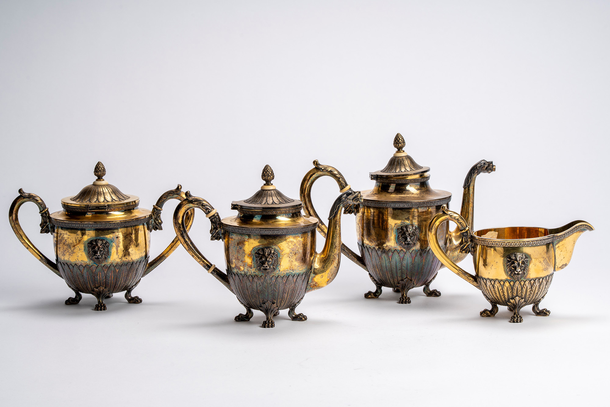 realizzato in stile “Impero” composto da teiera, caffettiera, lattiera e zuccheriera a corpo decorato con cesellature a palmette, foglie stilizzate e maschere leonine cesellate a tutto tondo applicate su 2 lati. Prese e beccucci mossi decorati all’attaccature e nella parte finale a teste animali cesellate. Coperchio con presa cesellata a pigna a tutto tondo. Piedini a zampa ferina.
