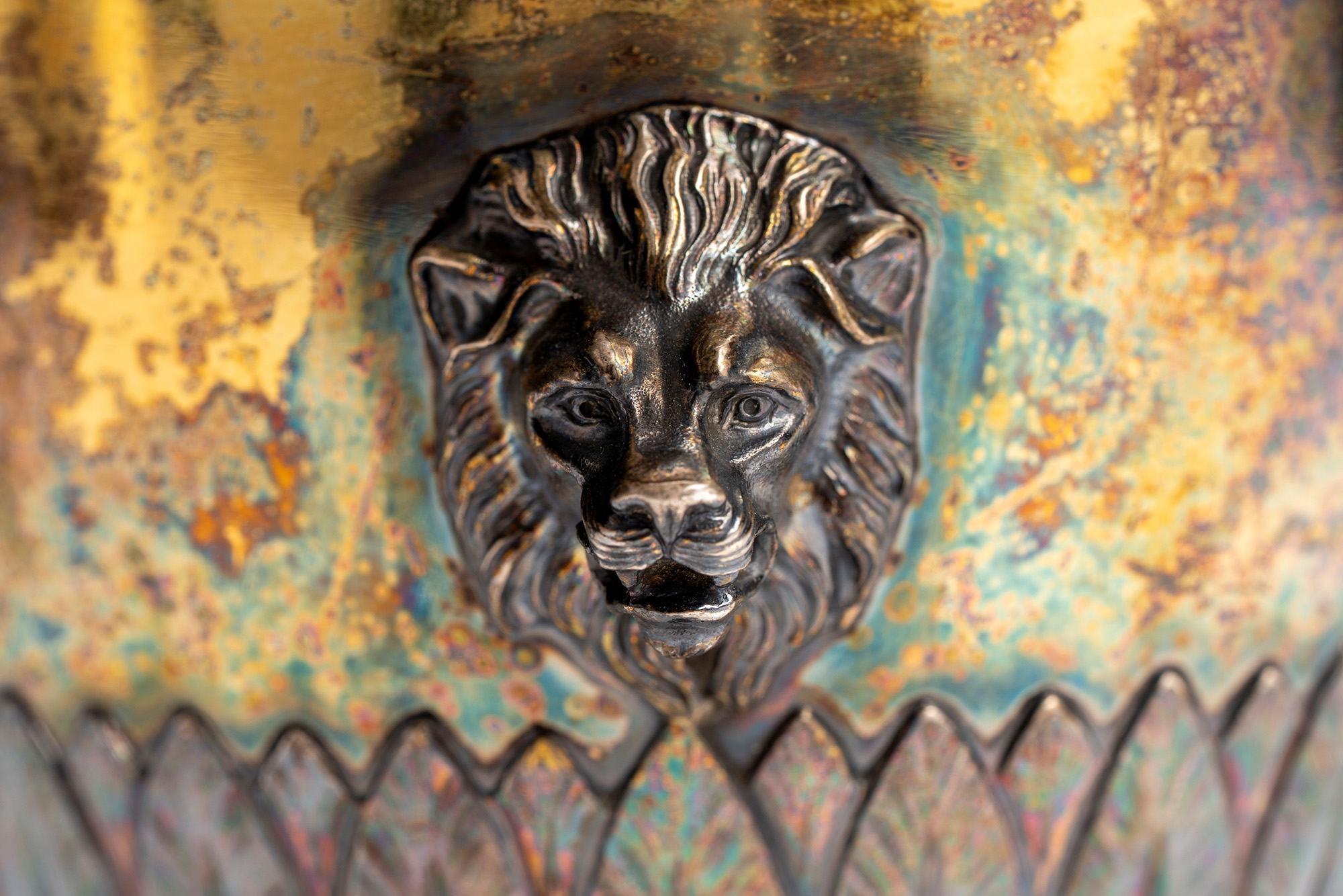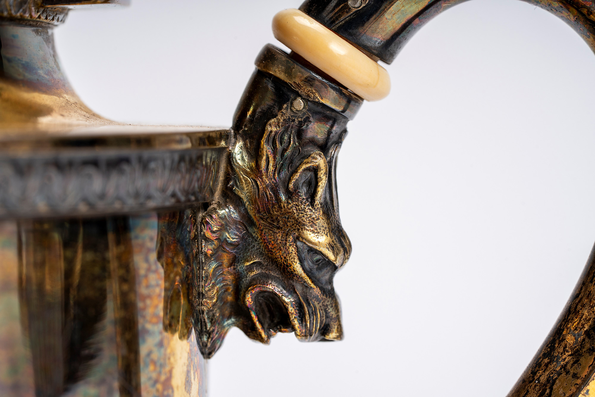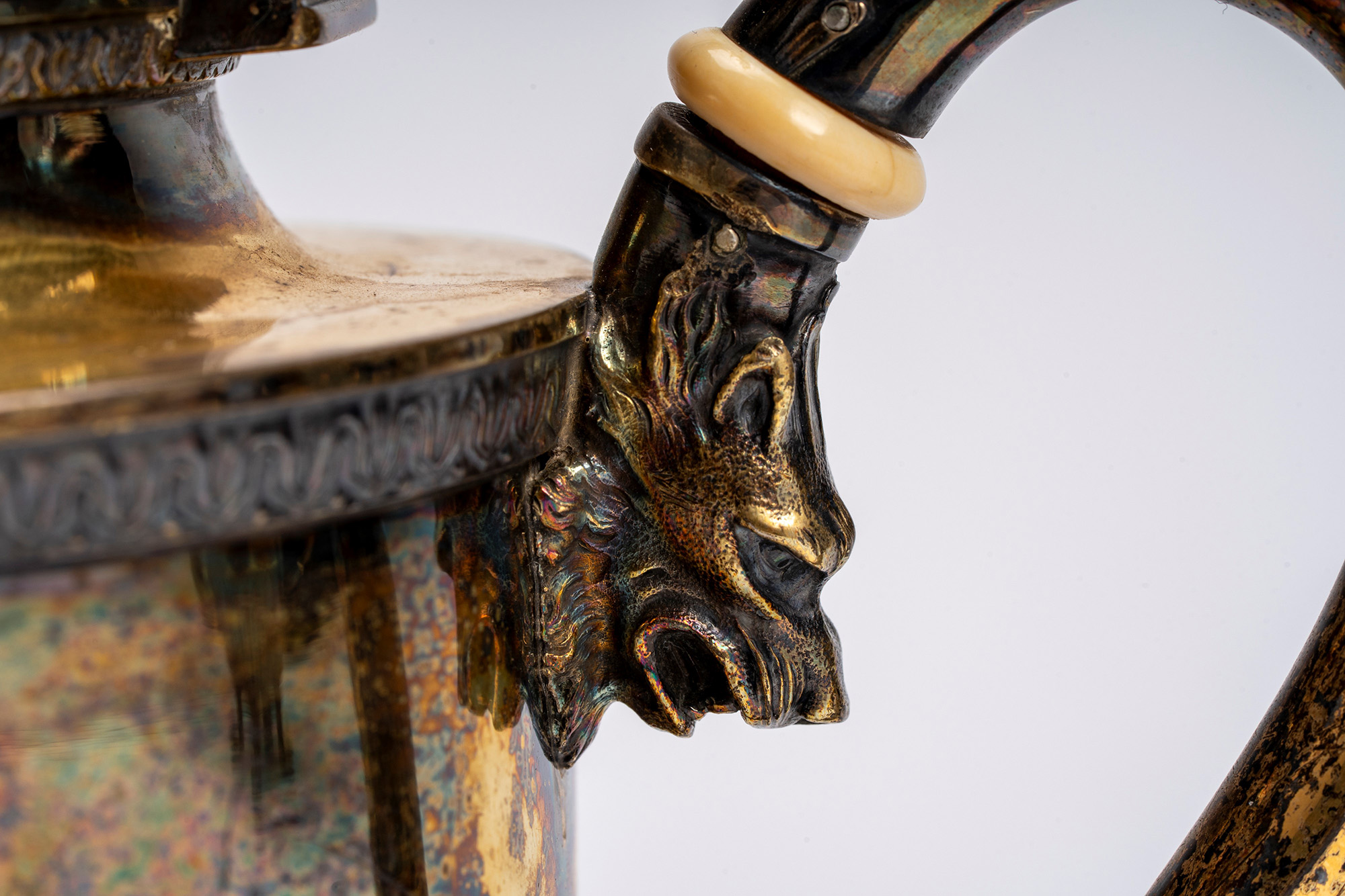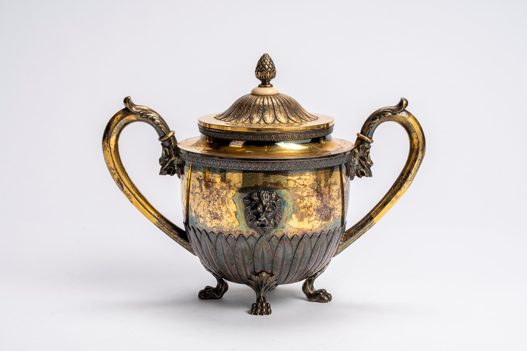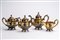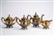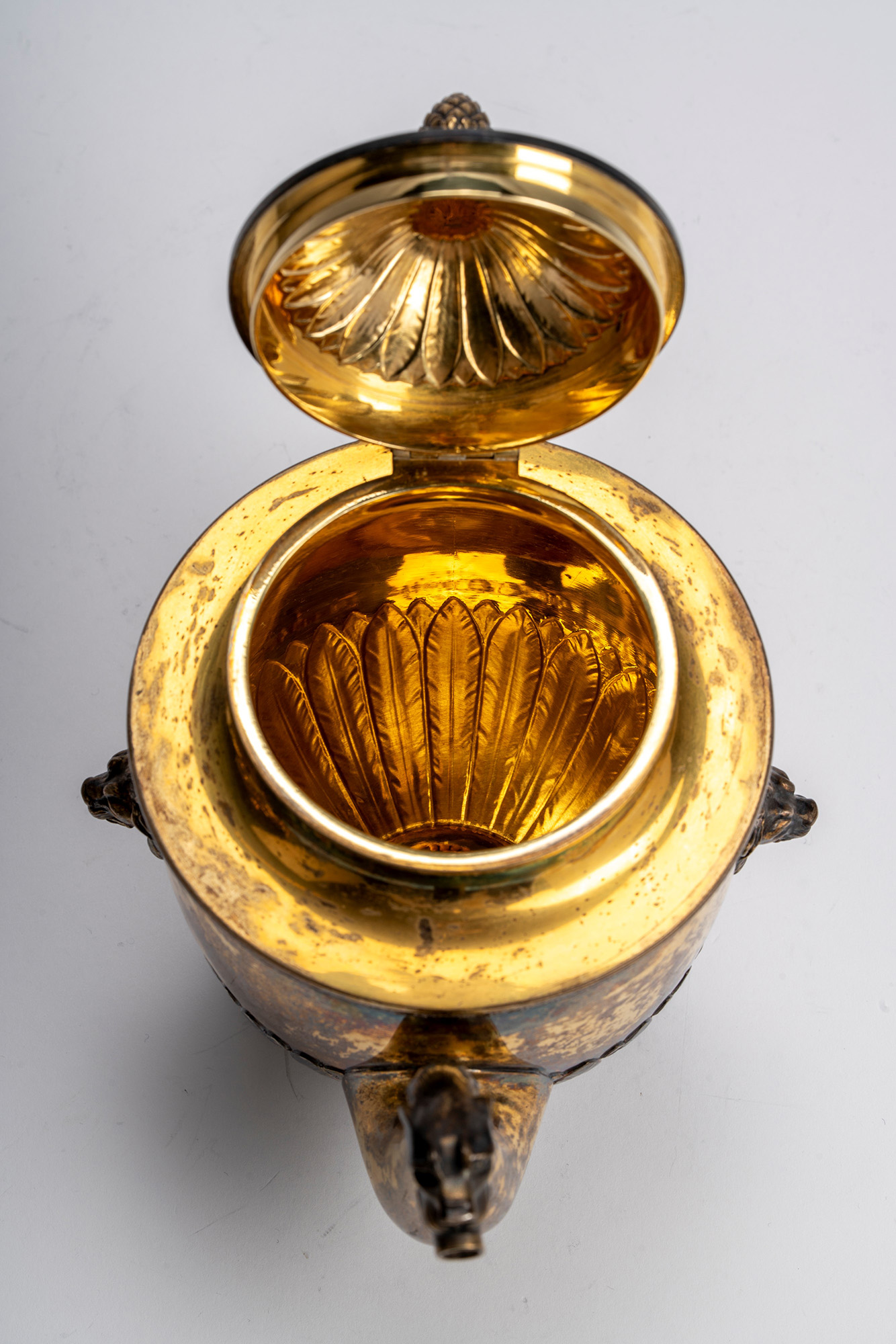 realizzato in stile “Impero” composto da teiera, caffettiera, lattiera e zuccheriera a corpo decorato con cesellature a palmette, foglie stilizzate e maschere leonine cesellate a tutto tondo applicate su 2 lati. Prese e beccucci mossi decorati all’attaccature e nella parte finale a teste animali cesellate. Coperchio con presa cesellata a pigna a tutto tondo. Piedini a zampa ferina.