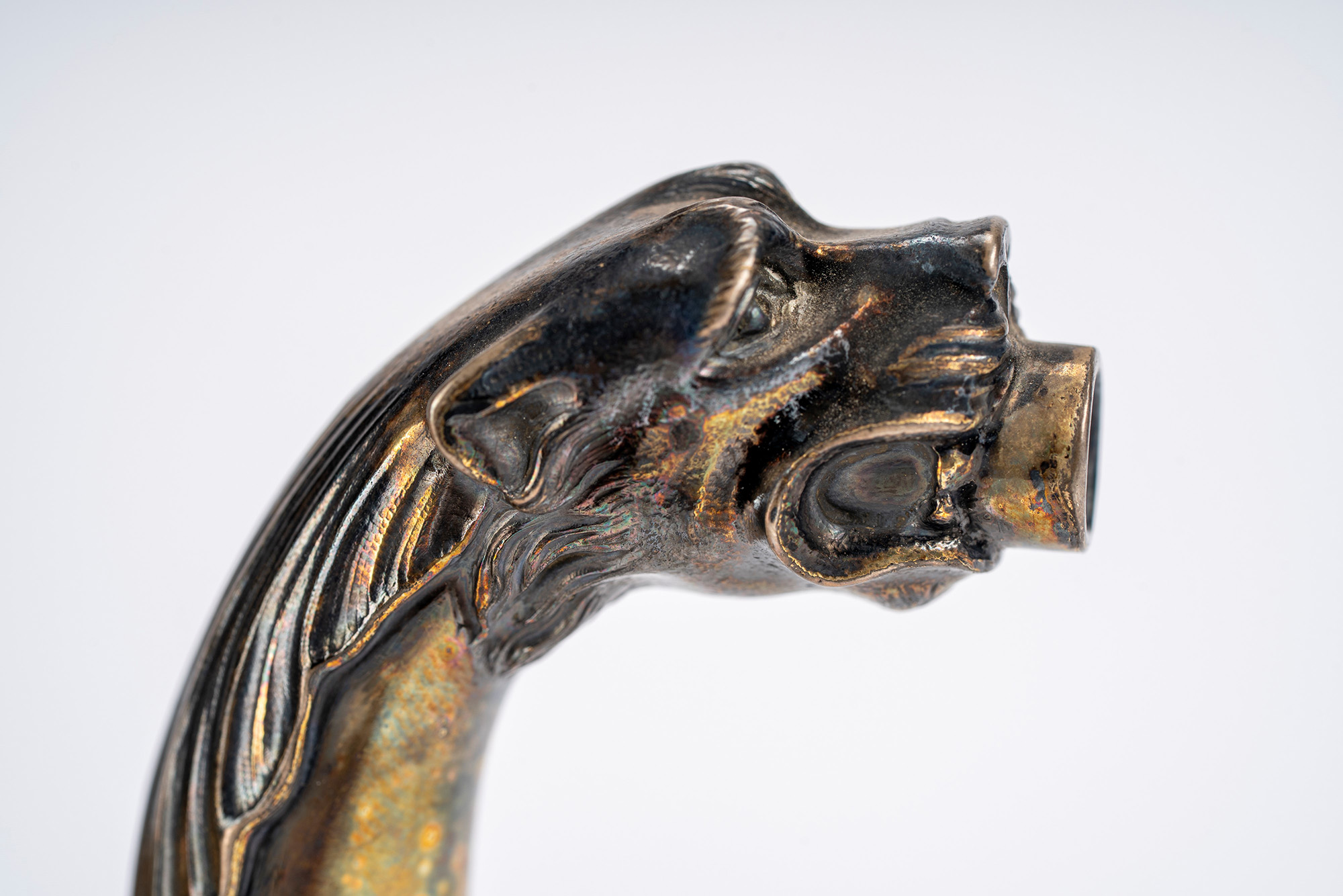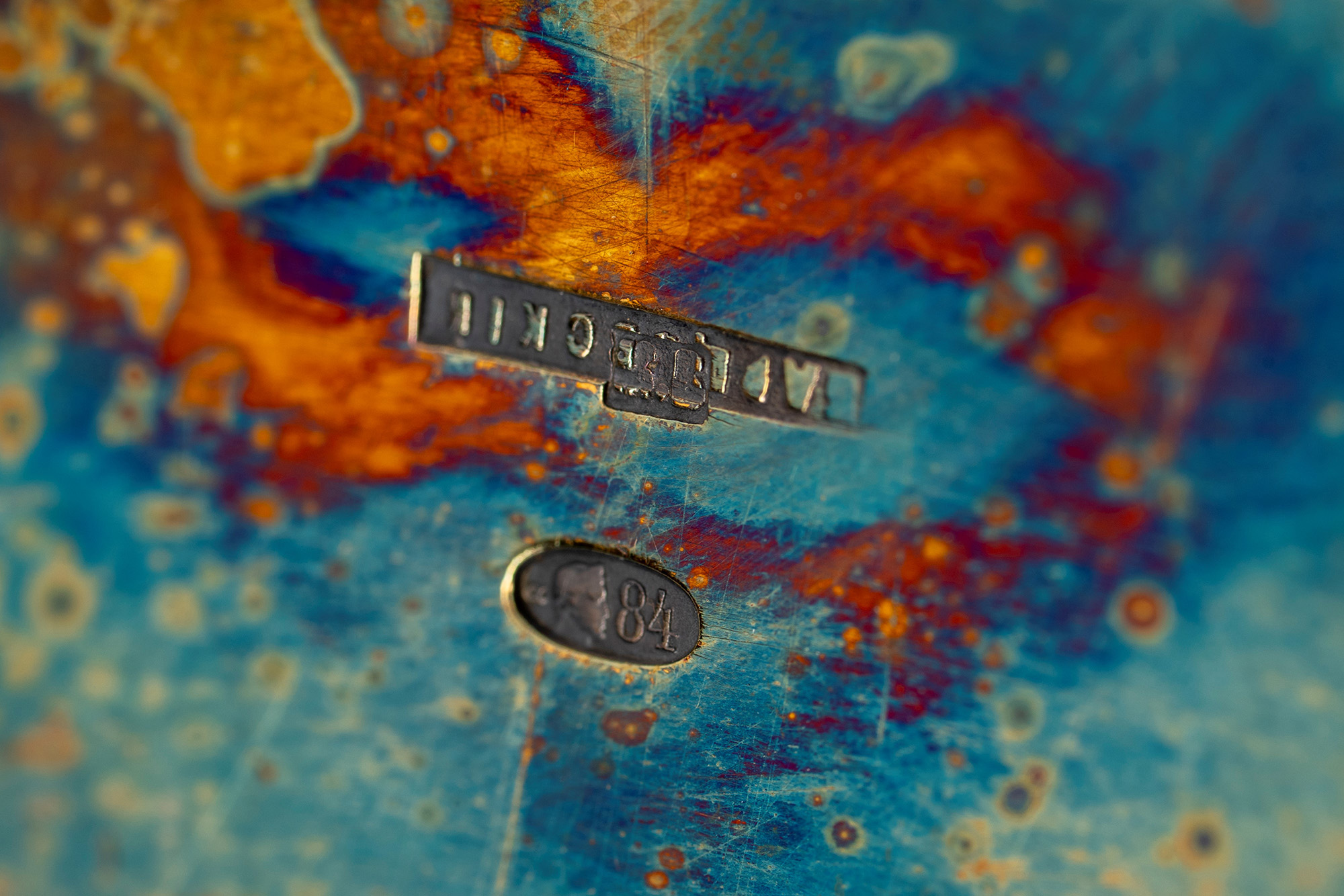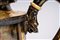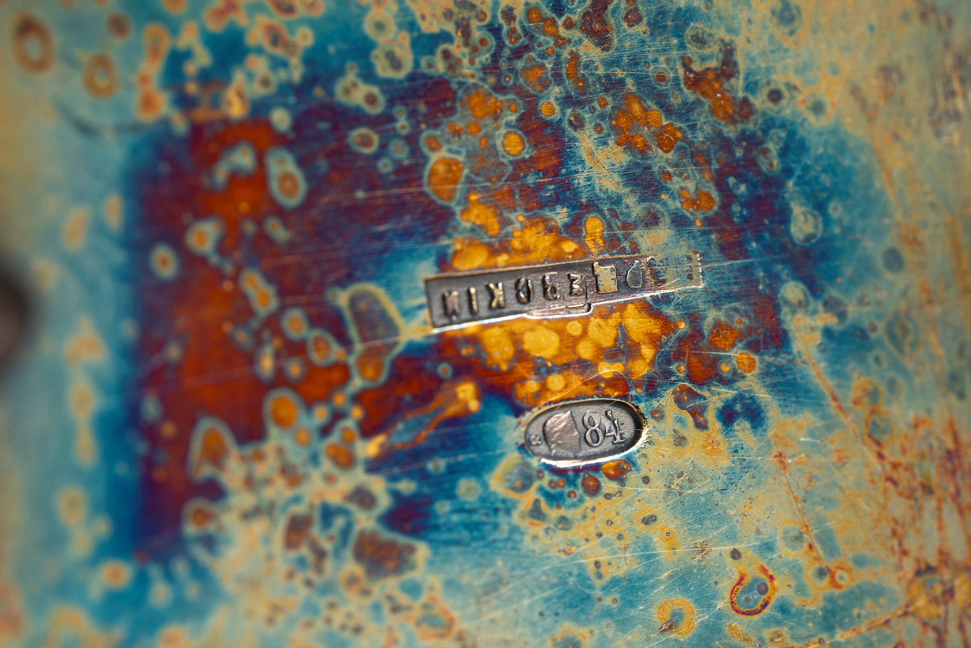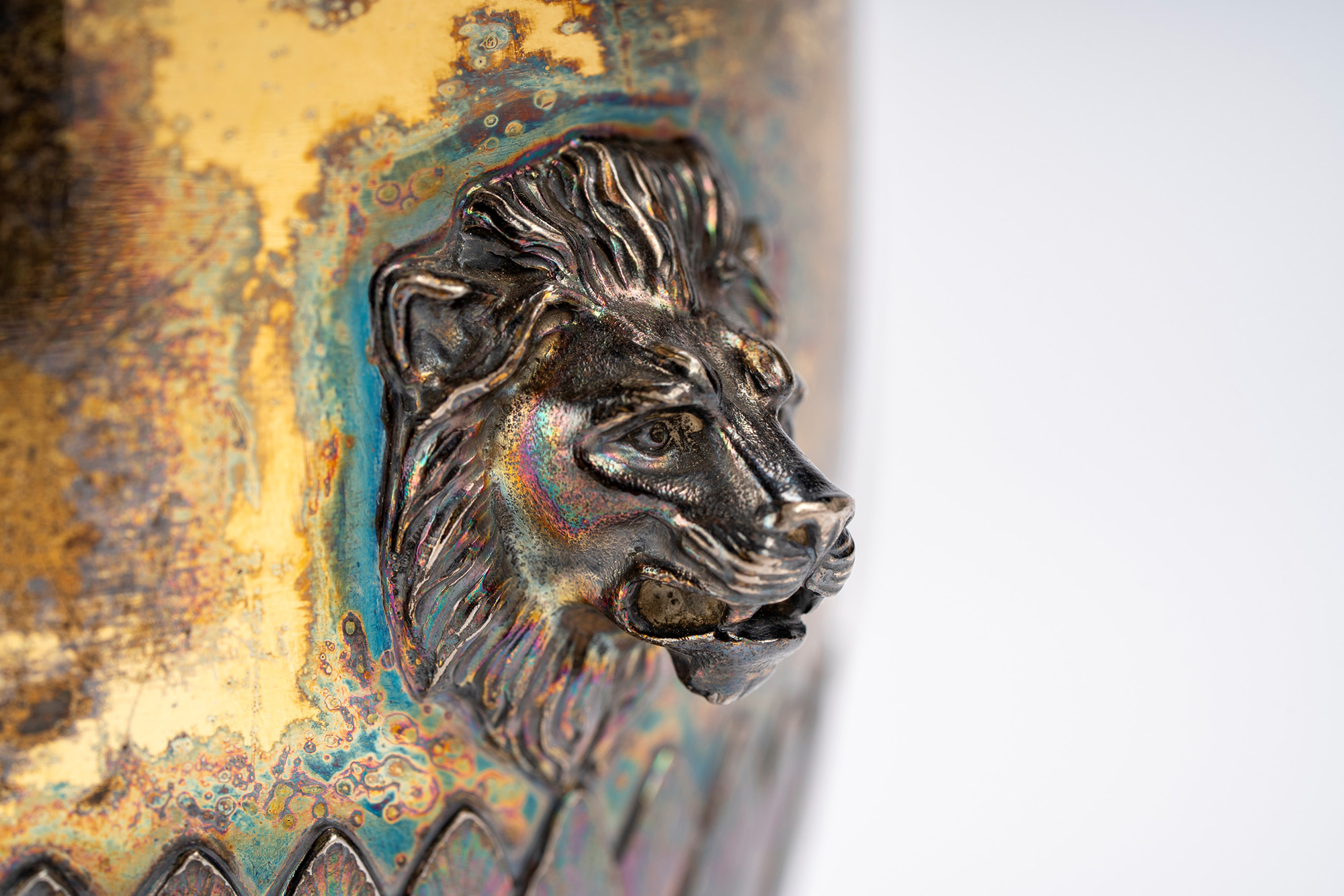 realizzato in stile “Impero” composto da teiera, caffettiera, lattiera e zuccheriera a corpo decorato con cesellature a palmette, foglie stilizzate e maschere leonine cesellate a tutto tondo applicate su 2 lati. Prese e beccucci mossi decorati all’attaccature e nella parte finale a teste animali cesellate. Coperchio con presa cesellata a pigna a tutto tondo. Piedini a zampa ferina.