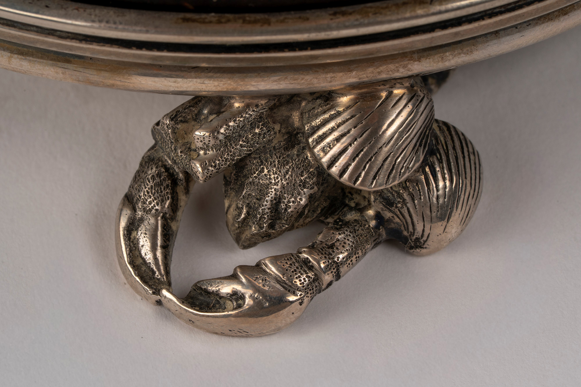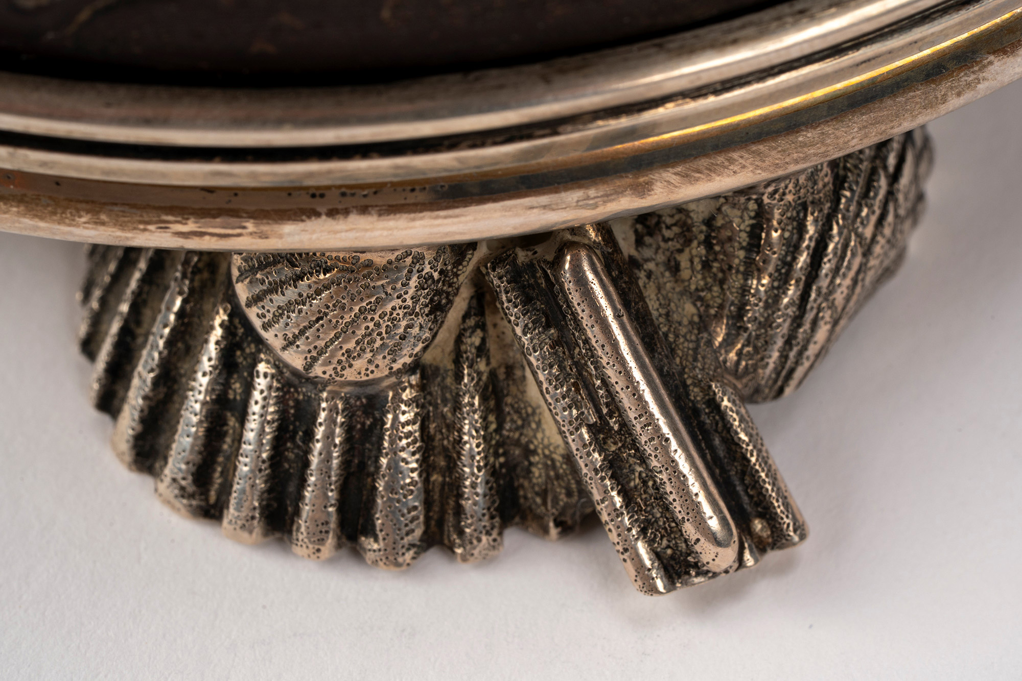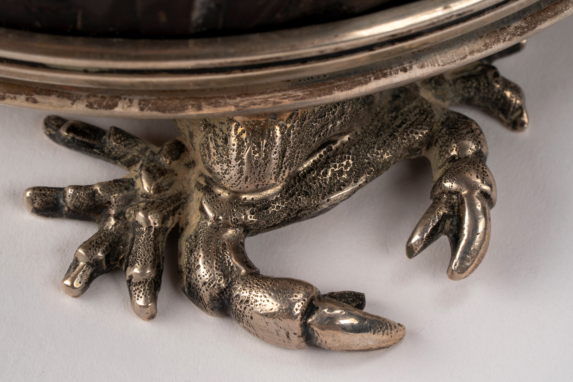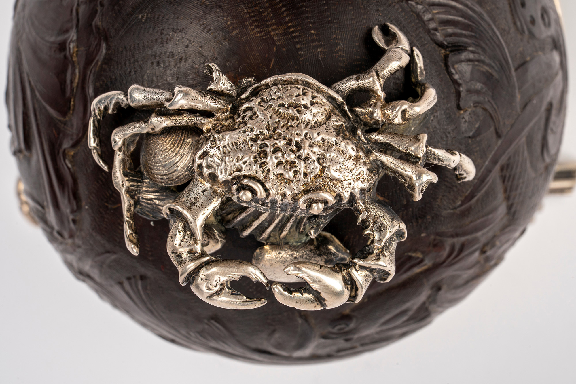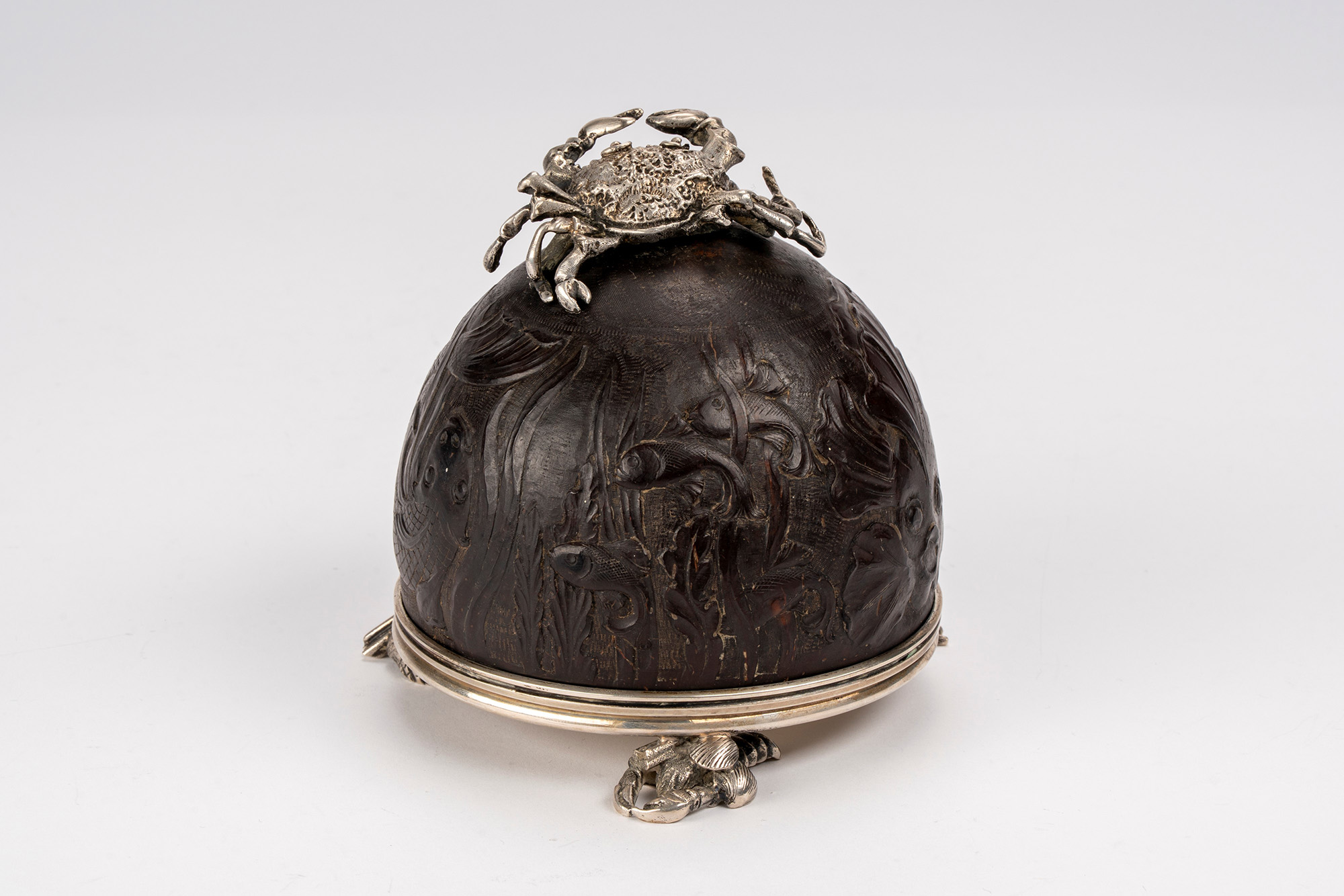 con struttura in noce di cocco scolpita a pesci e fondale marino con montatura e parte interna in argento a granchi e conchiglie cesellati a tutto tondo.