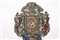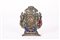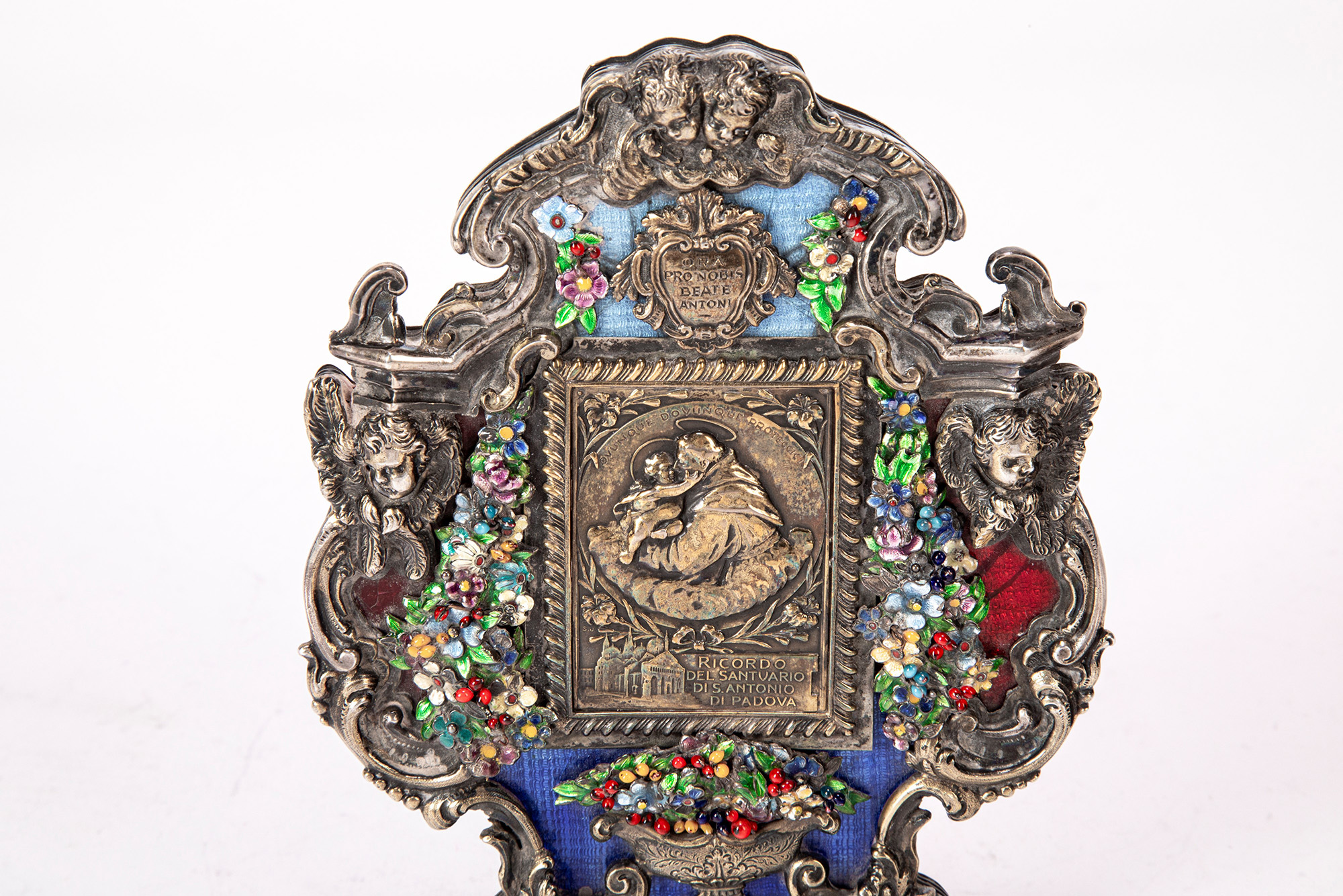 di forma sagomata finemente cesellata a putti alati, volute, e vaso centrale, sfondo realizzato in smalti policromi, trionfi floreali e alla base realizzati anch’essi in smalti policromi con piccoli frutti a tutto tondo, al centro placchetta dorata con Sant'Antonio da Padova, alla base decoro con inserti in pietre dure cabochon, firmata alla base. (Difetti e lievi mancanze).