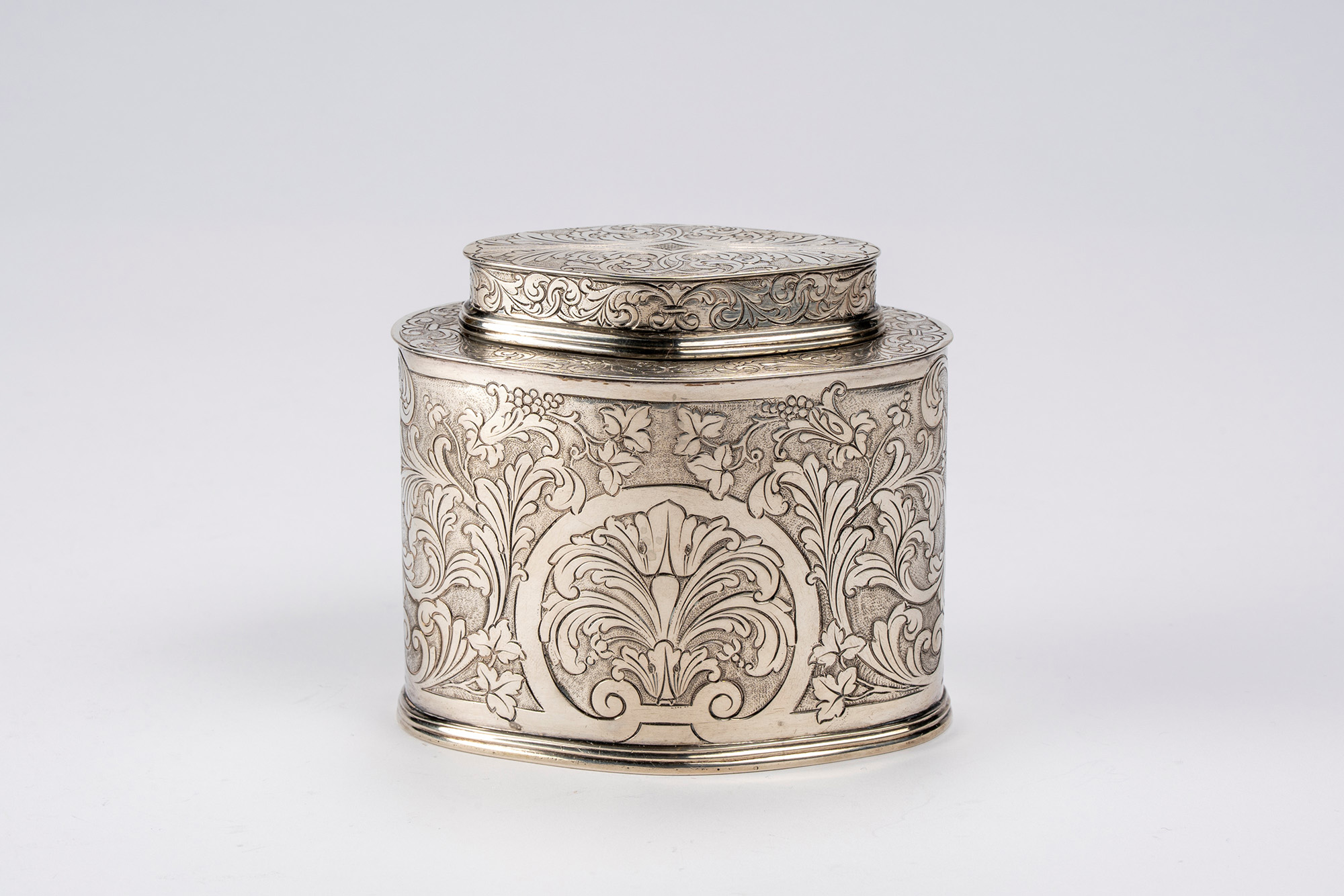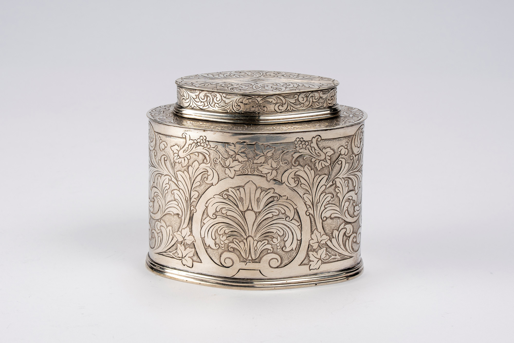 con corpo di forma sagomata finemente inciso a volute, motivi fogliacei e tralci di vite stilizzati