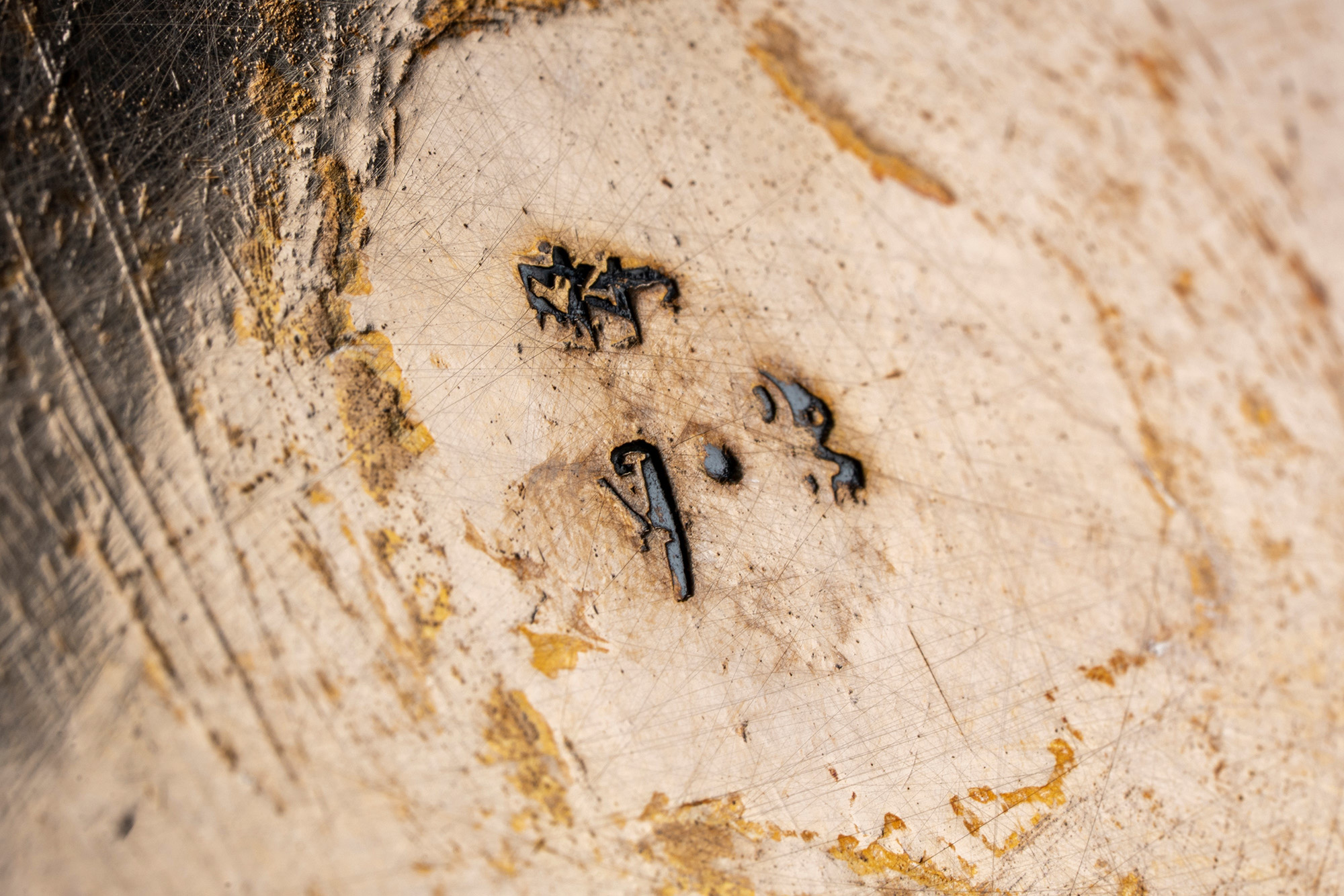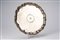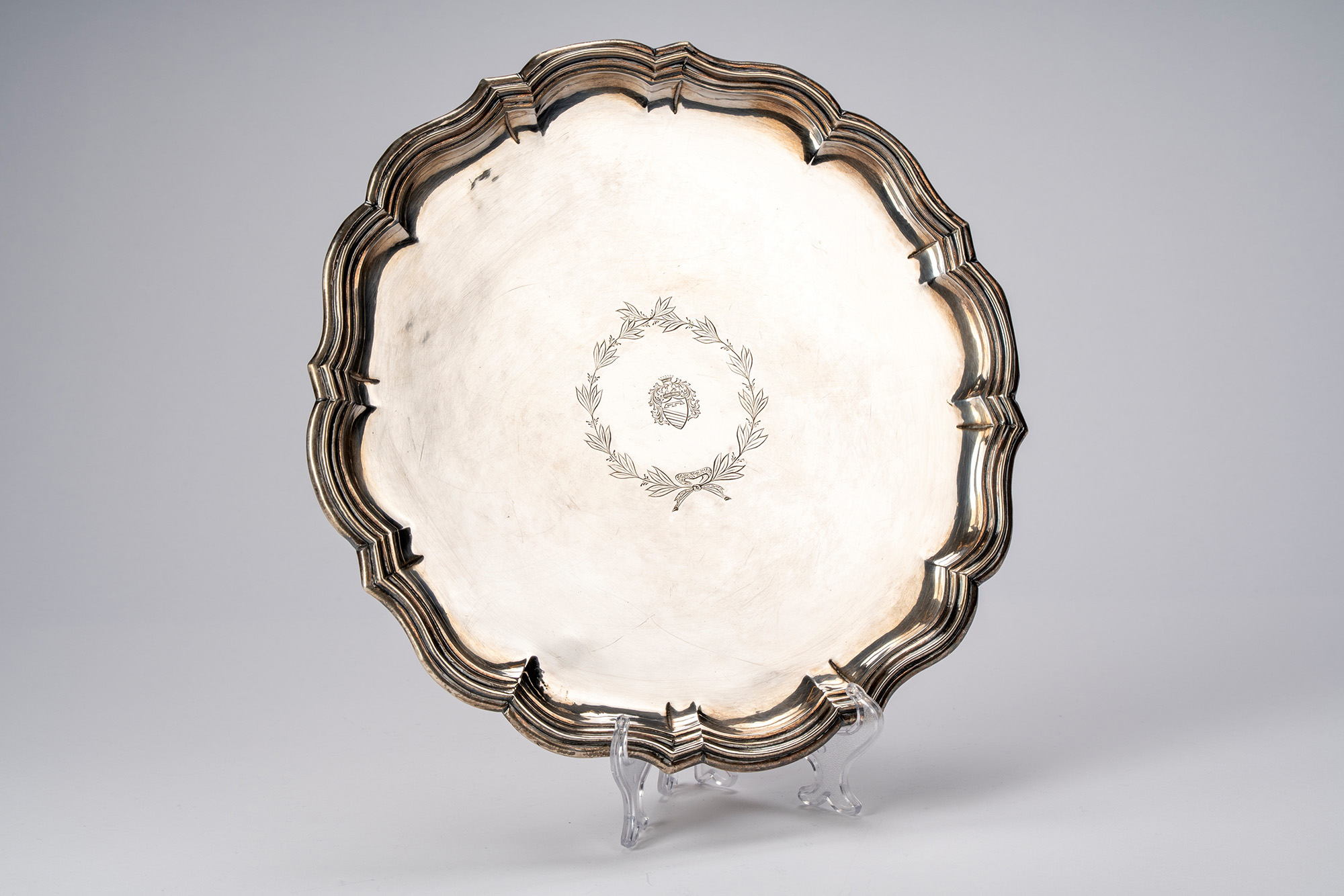 con piatto a bordo sagomato decorato con stemma e ghirlanda d’alloro centrali incisi nel cavetto, tre piedini mossi, punzoni parzialmente abrasi alla base.