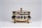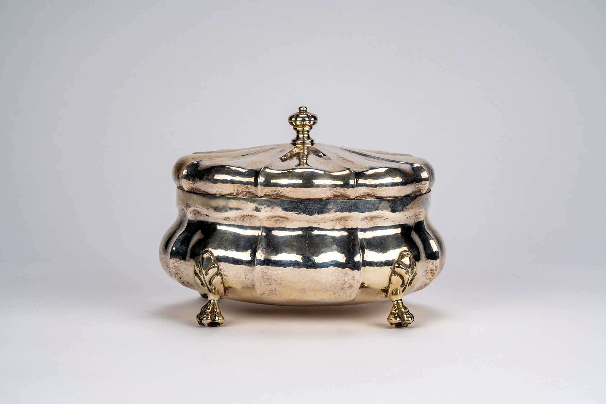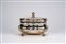 a corpo di forma ovoidale bombata sorretto da quattro piedini a zampe stilizzate, pomolo del coperchio tornito.