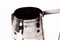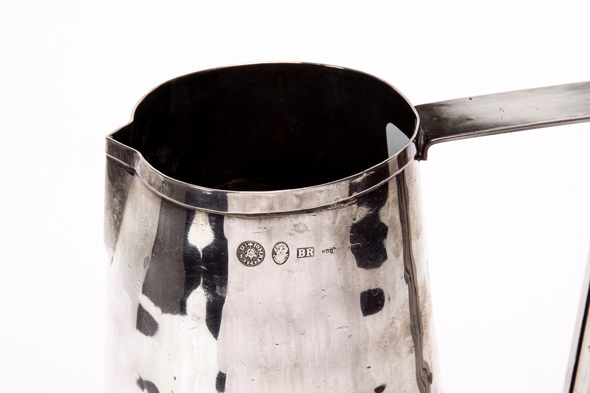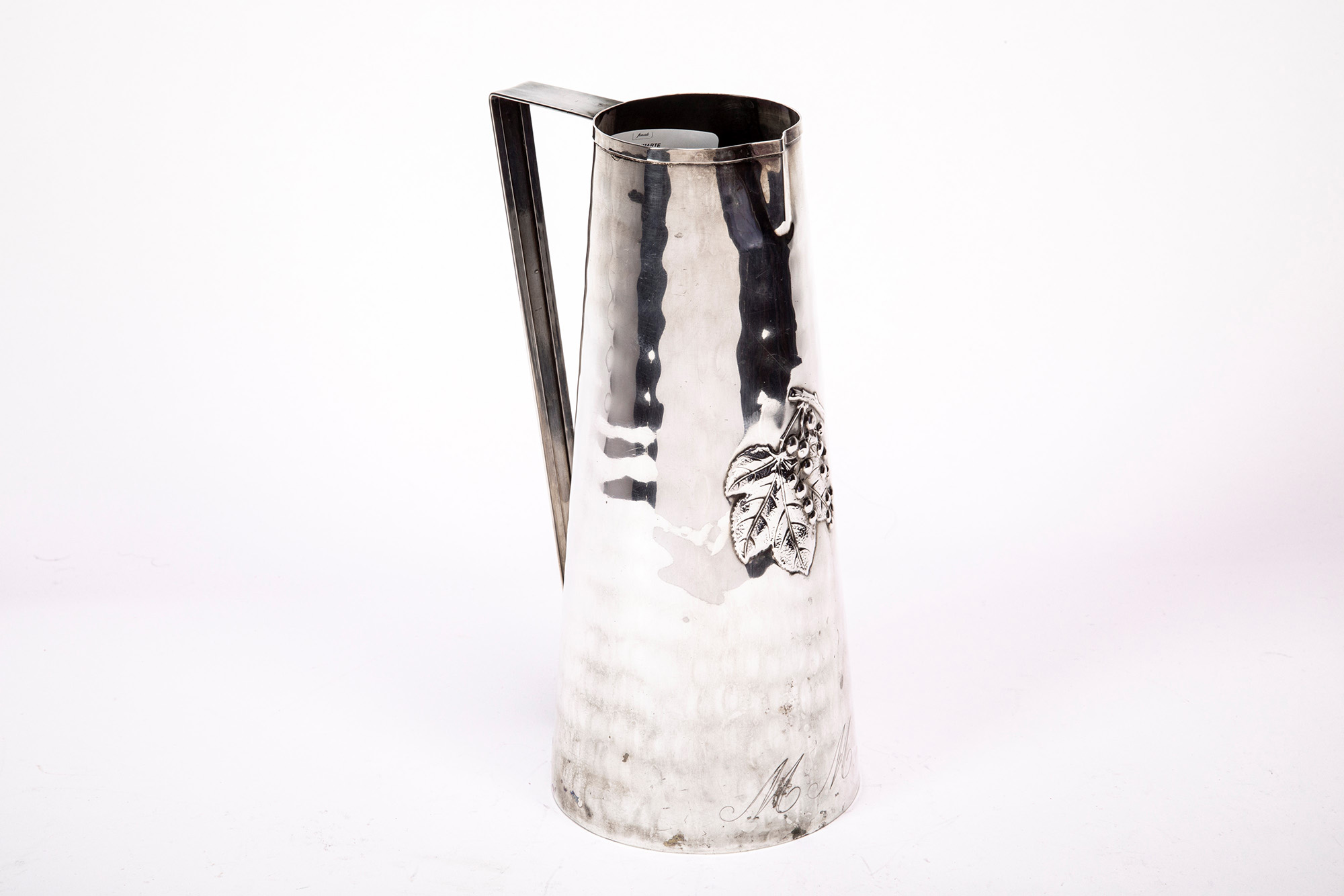 con corpo tronco conico decorato a leggere martellature e sbalzo centrale a foglia di vite con uva. Presa laterale di forma geometrica.