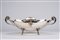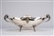 corpo di forma ovoidale decorato con applicazioni traforate a volute e piccoli mascheroni cesellati, anse laterali mosse, piedini a ricciolo.