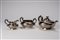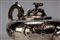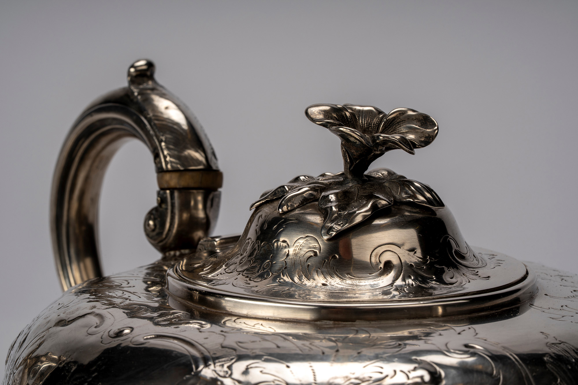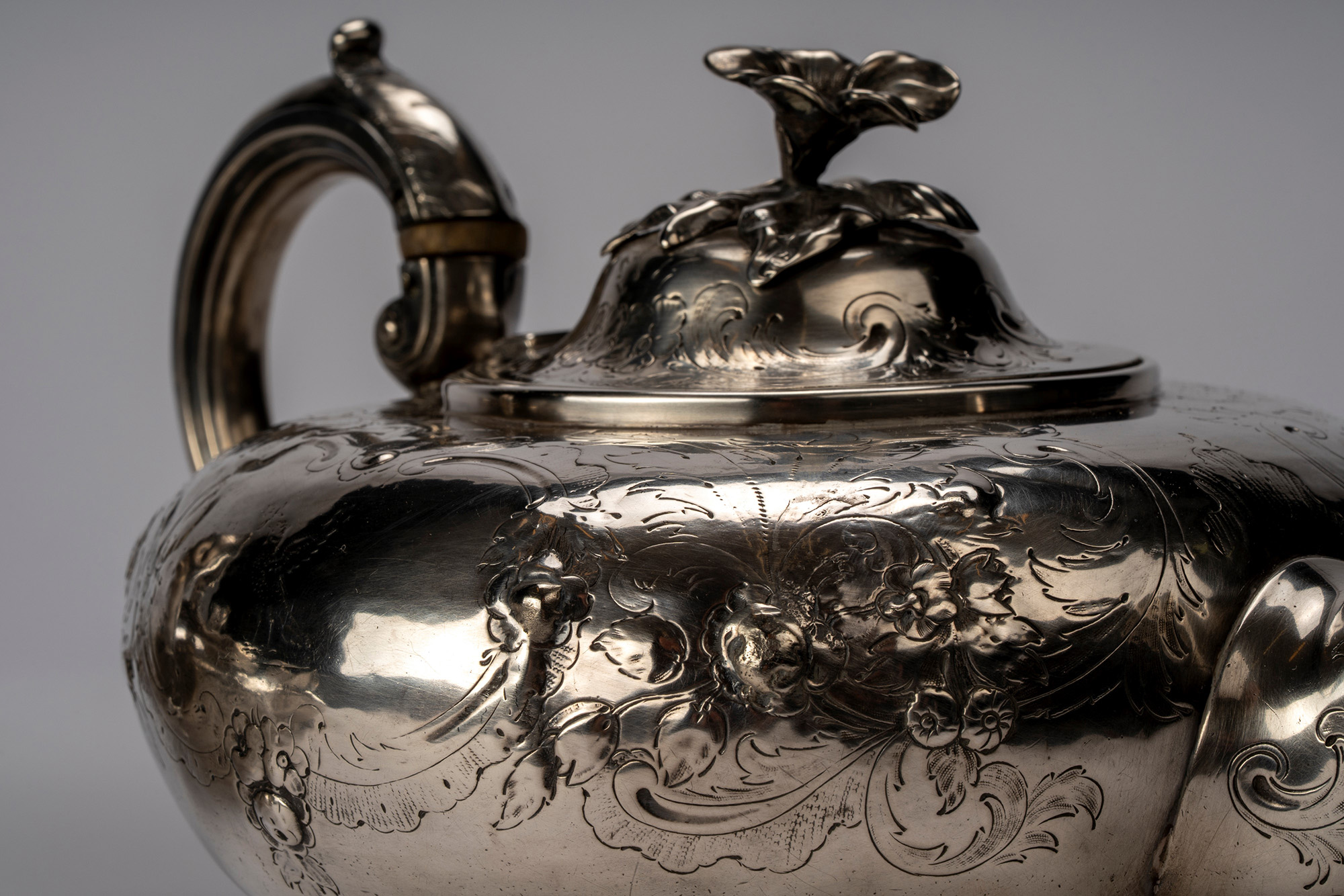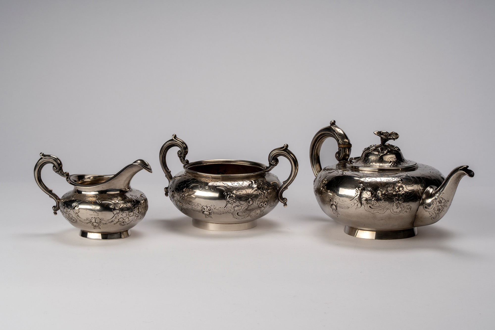 composto da teiera, lattiera e zuccheriera, a corpo sferico sbalzato a rami con motivi floreali, piccola incisione con animale araldico e presa del coperchio cesellata a fiore a tutto tondo. (Lievi difetti).