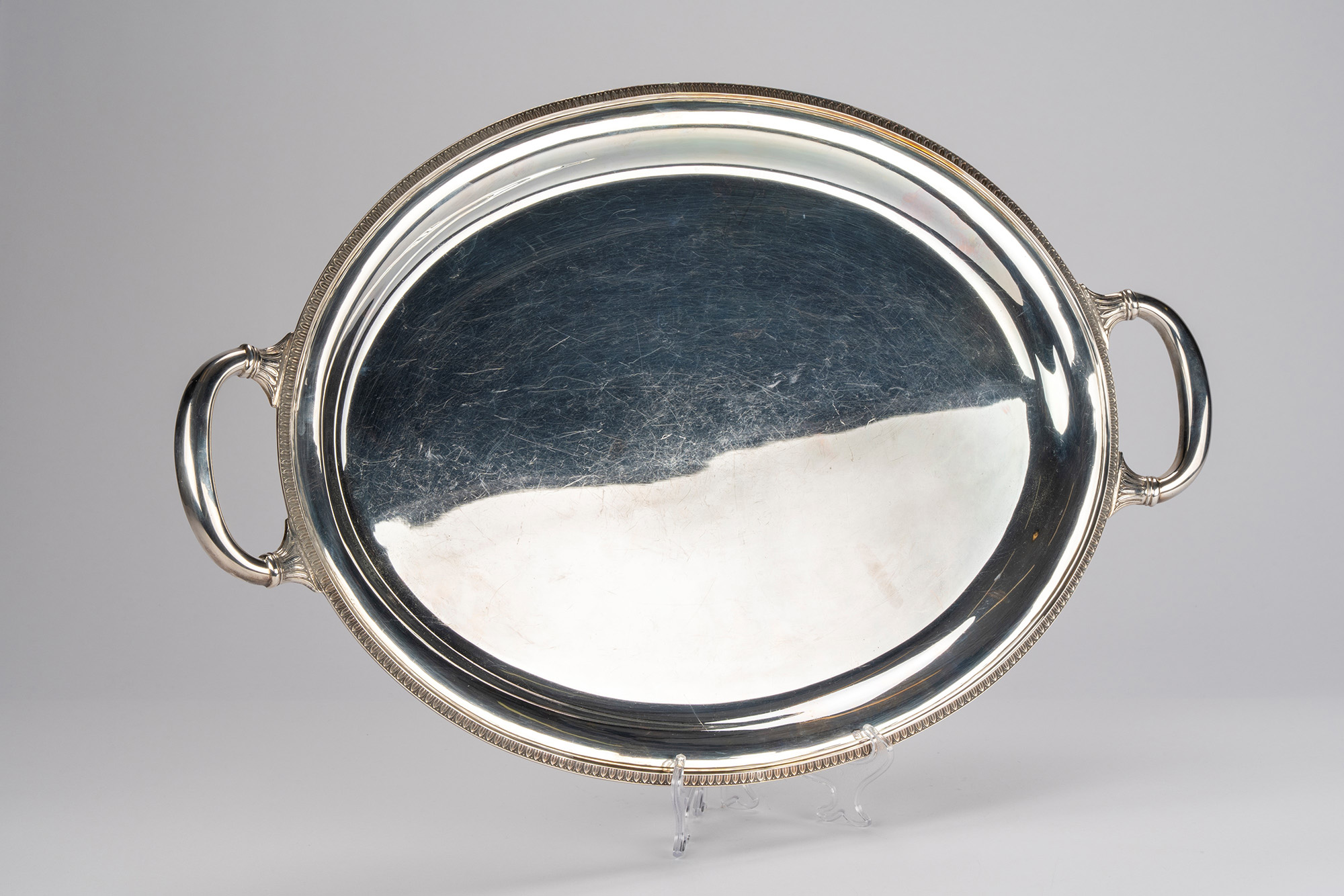 di forma ovale con bordo cesellato a palmette e prese mosse.