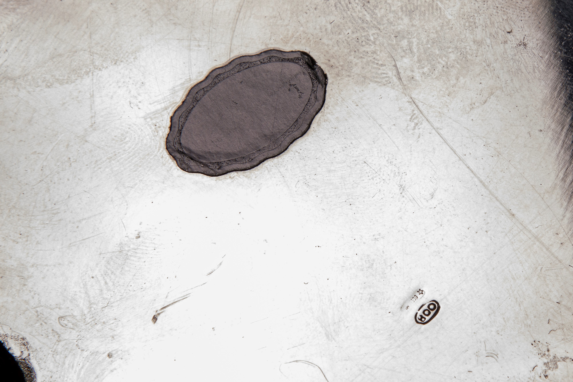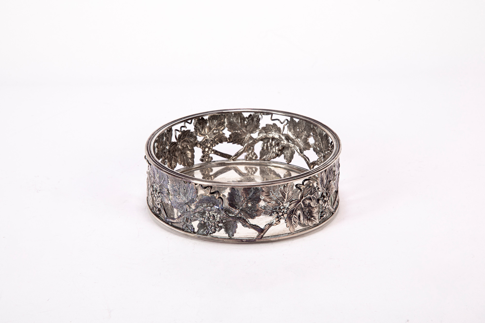 di forma circolare con fascia ricca,ente cesellata a tralci di vite con foglie ed uva.