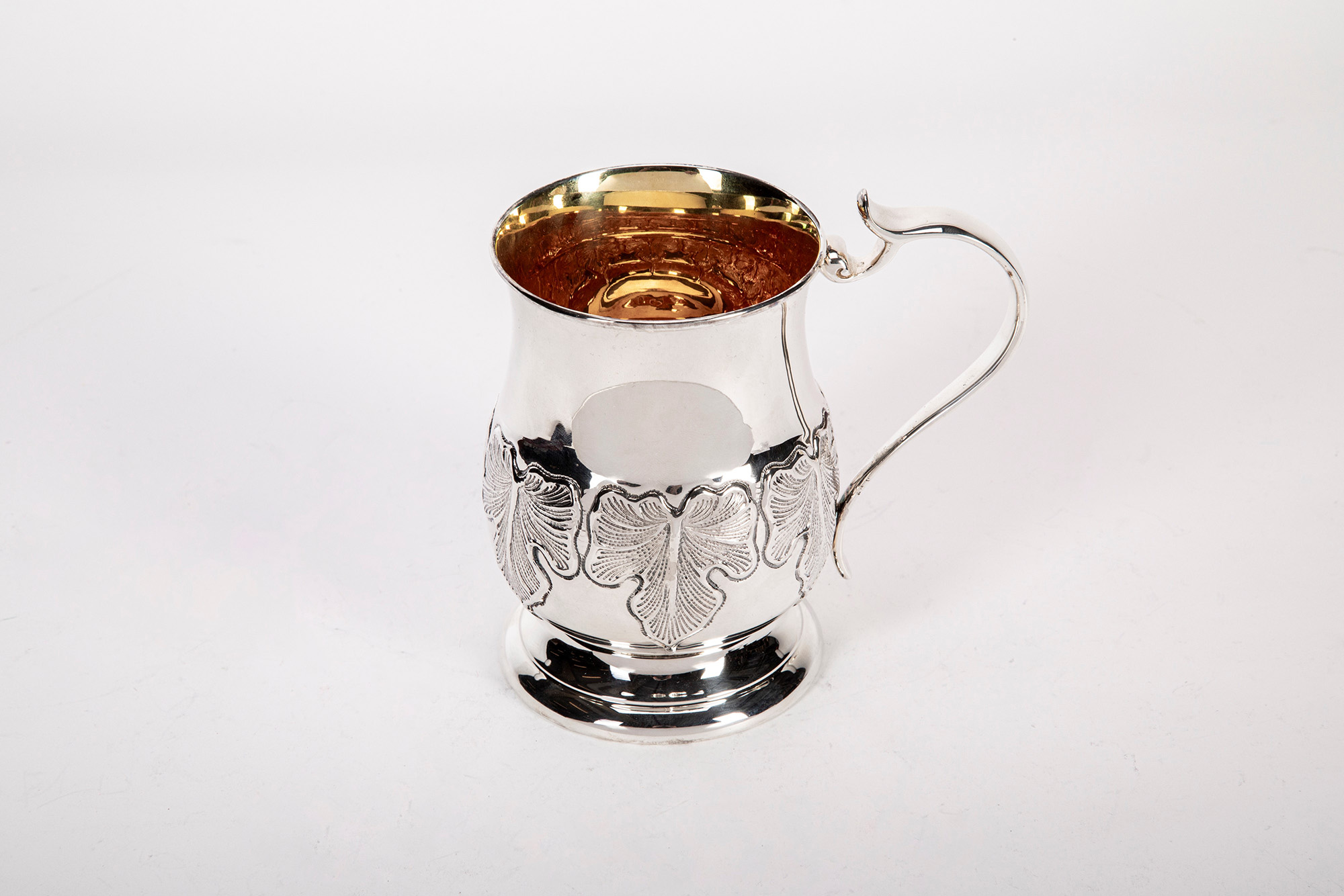 con corpo decorare a fascia di foglie sbalzate, presa mossa e interno dorato.